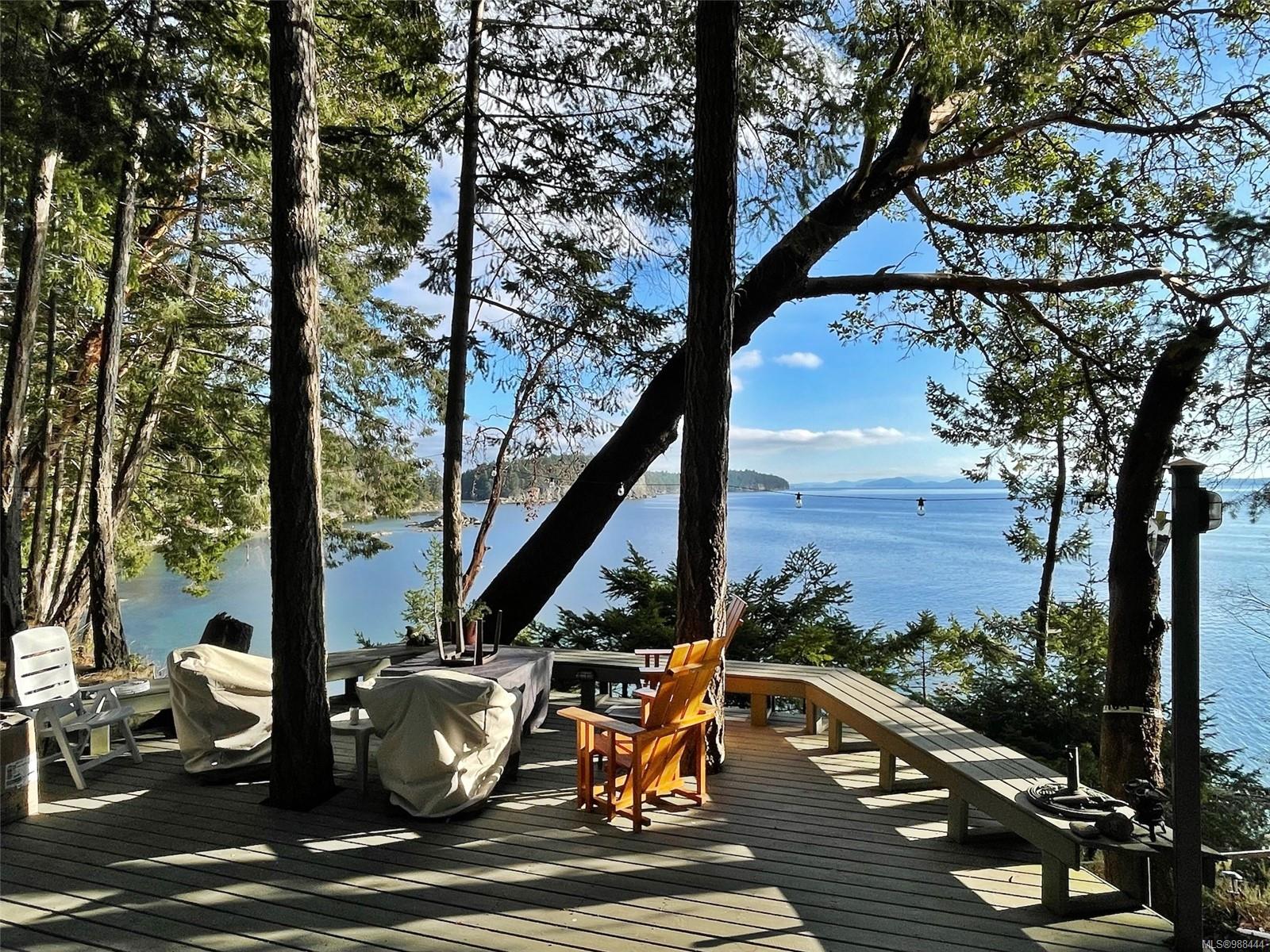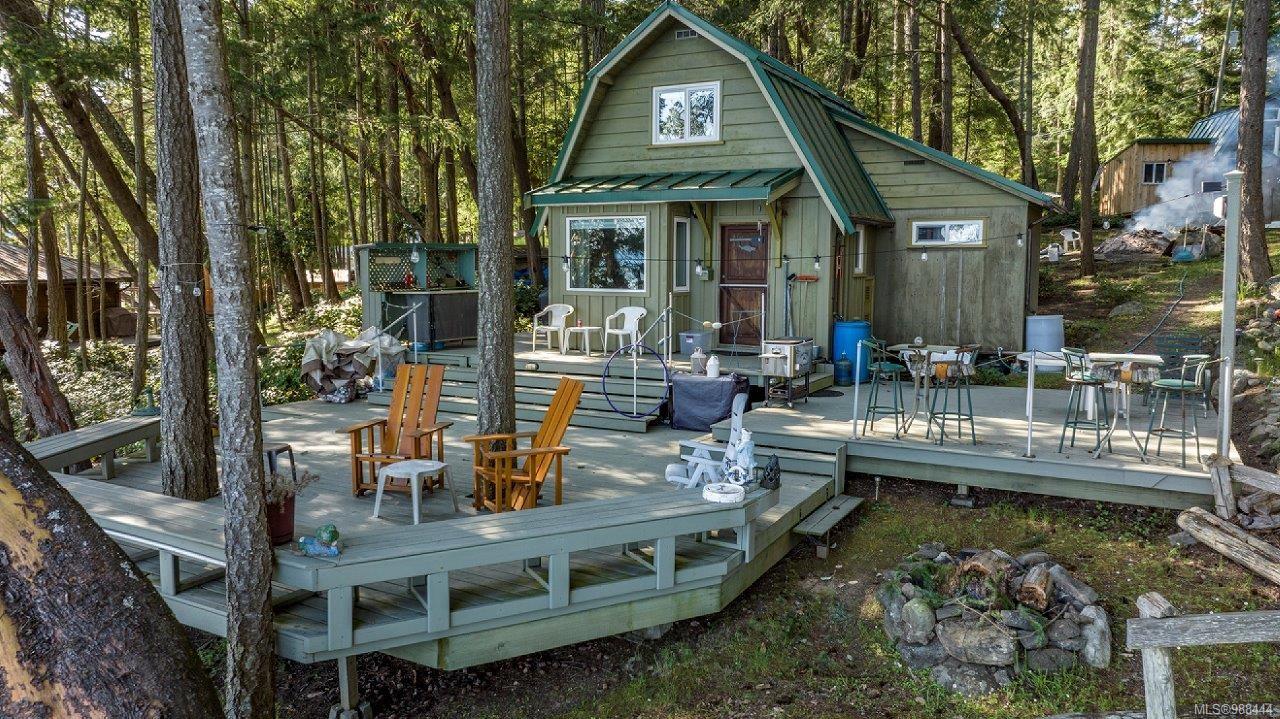 Sought after South facing waterfront property on beautiful Mudge Island. Gorgeous sandy beachfront lot with medium high bank. The .39-acre lot gently slopes from Salal Drive toward the ocean. The view is stunning, the beach is one of the best for swimming on the island & there’s a mooring buoy offshore to tie up your boat. The beach is accessible from the cozy rustic cabin which features an open concept main level & upstairs loft-style bedroom. Kitchen/great room features recessed bay window, real wood cabinets, gas stove (propane) & fridge (propane & electric), Pacific Energy Woodstove & air conditioning by a mini split heat pump. Full bath with tub/shower, low flow toilet & sink/vanity plus extra storage/pantry cupboard. Other features include a gambrel style metal roof, expansive multi-level sundeck (pressure treated) & a fire pit area. Drilled well, 2 cisterns, septic tank and field. The pump house has additional storage and full-sized fridge plus a loft-style bedroom for guests. A separate partially insulated workshop with power and light is great additional storage or potential for extra sleeping quarters. The cabin enjoys electric power, Telus fibre optic internet & TV. Make this your summer retreat or full time living at the seashore. This property is a must see, call for further details! Measurements are approximate and data should be verified if important.