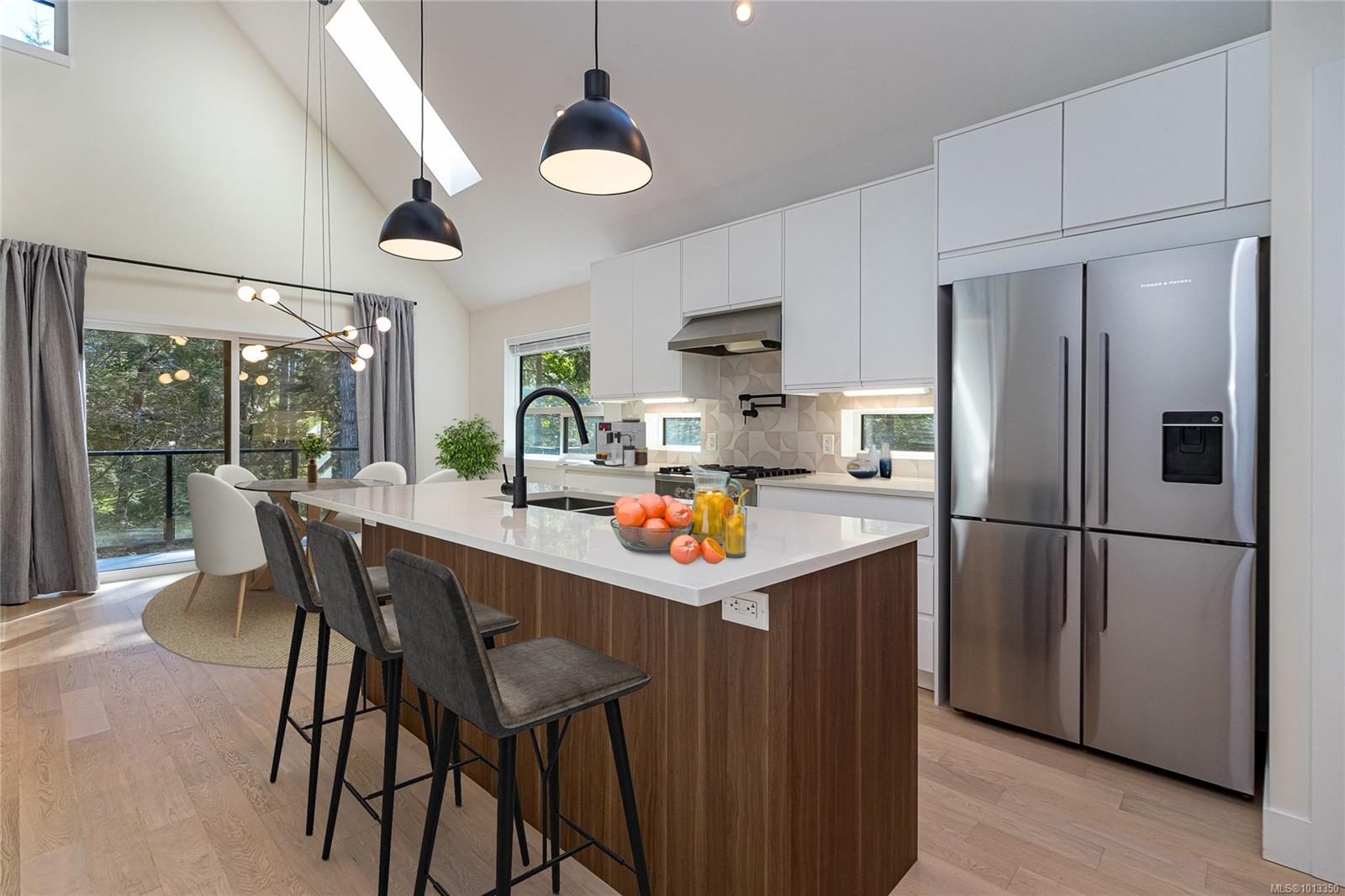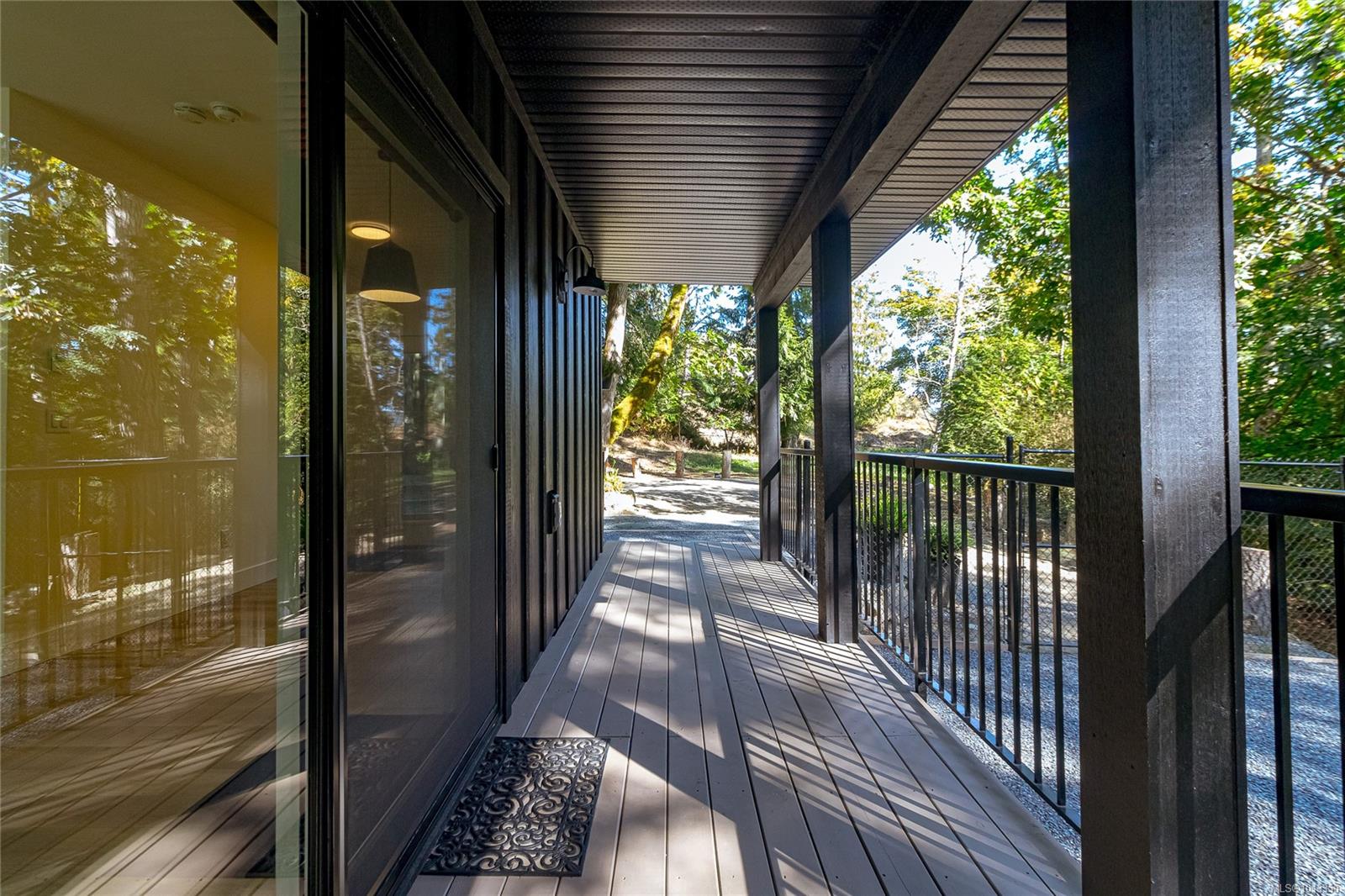 Architect-designed modern retreat in East Sooke. This custom 2022 home offers a serene escape—far enough from the city to feel like country living, yet with 3 routes in and out for easy access. Minutes from Roche Cove, East Sooke Park and endless trails, it’s the perfect base for outdoor adventure. Inside, vaulted ceilings, wood beams and high-end finishes create minimalist elegance. The open living area is filled with natural light and peaceful forest views, anchored by a chef’s kitchen with premium appliances, a cozy wood stove and a sun-soaked patio. With 2 bedrooms plus a spacious den ideal for a home office, and a loft-style primary retreat, there’s room for both work and relaxation. A self-contained 1-bedroom suite offers income or multi-gen potential. A rare blend of modern design and natural beauty.