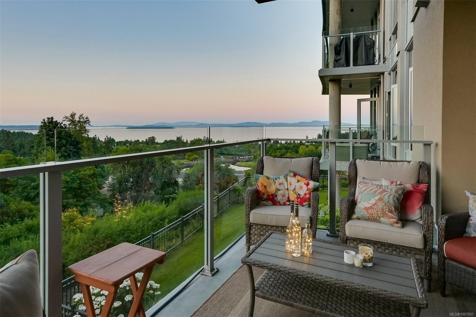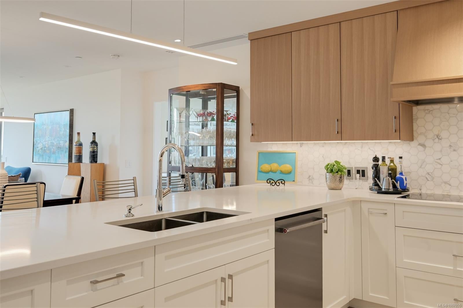 Luxury living at Sayward Hill in this over 1,800 sq ft 2 bed + den + media room home with beautiful ocean views. Thoughtfully designed with 8'9" ceilings, engineered hardwood, custom millwork, and large windows with roller shades. The chef’s kitchen features stone counters, premium KitchenAid appliances, and a 36” rangetop. Spa-inspired ensuite with soaker tub, rain shower, heated floors, and dual vanities. Enjoy year-round comfort with a gas fireplace and efficient heating/cooling. Entertainment-sized balcony with gas, water, and power. Includes deluxe laundry room, walk-in closet, two secure parking stalls, dedicated EV charger, and a storage locker. Building amenities: bike storage, fitness centre, fully outfitted workshop, and elegant lobby. Steps to Cordova Bay Golf, Mattick Farm, Lochside Trail, and the ocean. Open House Oct 25th 1-2pm or call for your private showing 250-883-5005.