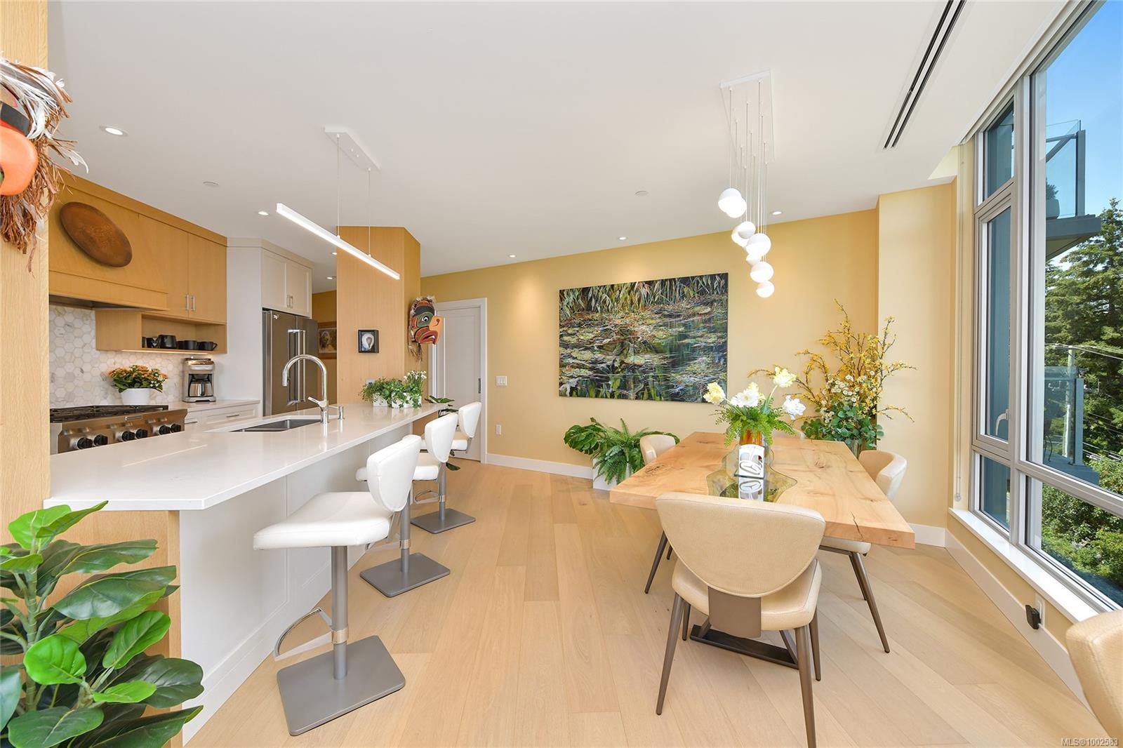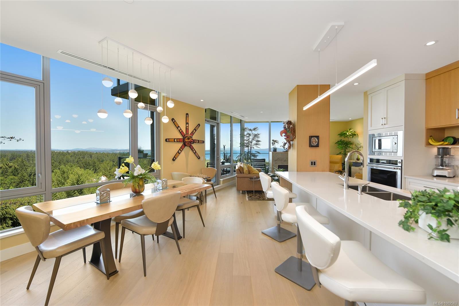 PINNACLE at Sayward Hill! Rare opportunity to own one of the most desired locations in this near-new concrete/steel 2019 by JAWL DEVELOPMENTS overlooking CORDOVA BAY GOLF with unobstructed commanding views of Mt. Baker, Salish Sea & beyond. Exceptionally spacious, contemporary 1844sf home, 2BD/2BA, Media Room/Home Office plus bonus Flex room offers a great layout. Top quality finishings with gourmet kitchen, pantry, quartz counters, engineered hardwood floors & in-floor heating in both bathrooms. AC/heat pump, rough-in for central vac, Gas FP, custom built-ins & high-end closet organizers just some of the upgrades. U/G secure parking stall, large storage locker and building amenities inc: fitness gym, workshop, bike storage & SW outdoor pergola gardens. Outdoor entertainment sized, sunny 250sf balcony offers the most stunning OCEANVIEWS in the city, best golf in town just a chip away & Mattick's Farm local shops just down the hill. Live your best life at The Pinnacle at Sayward Hill!