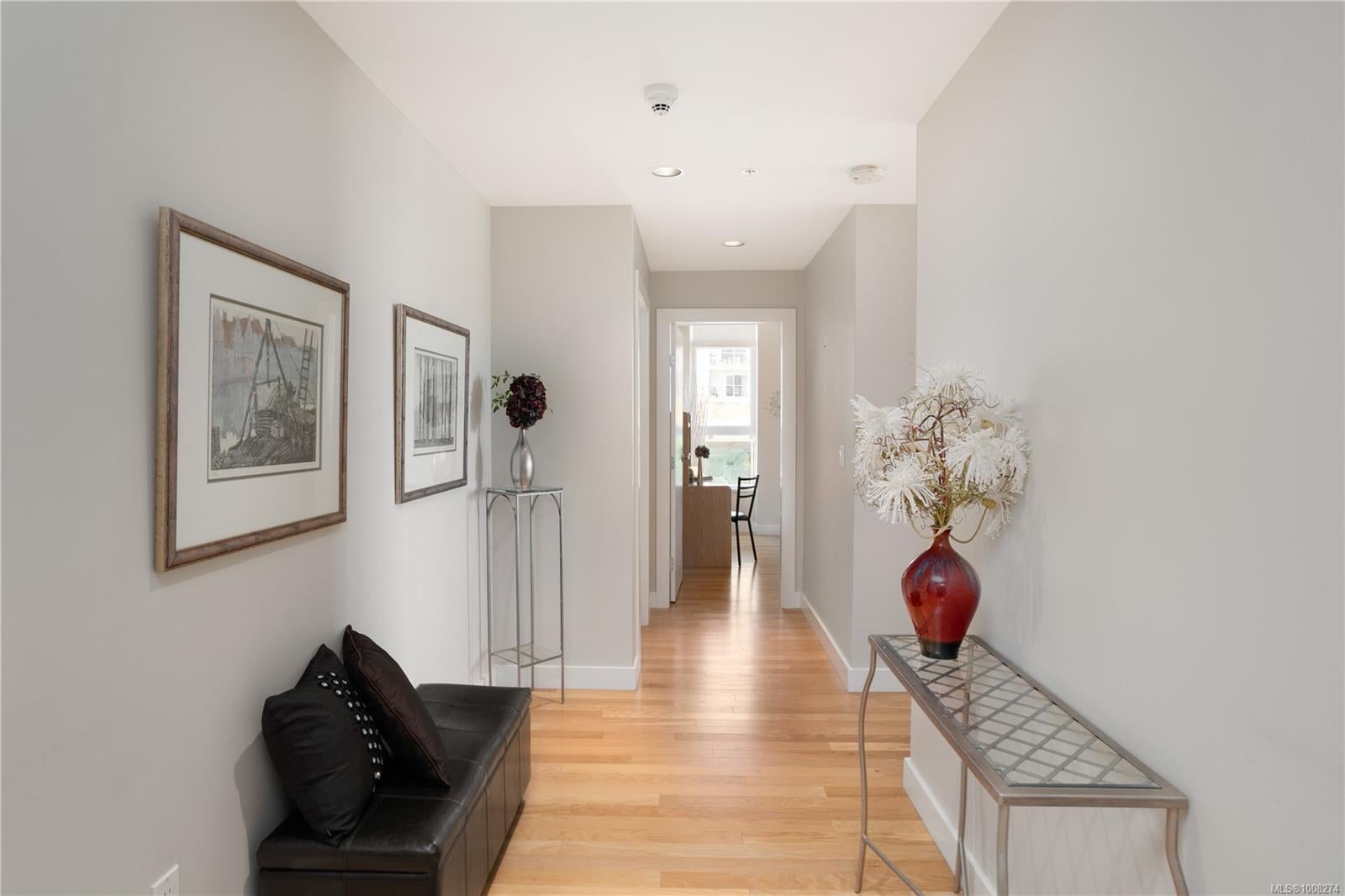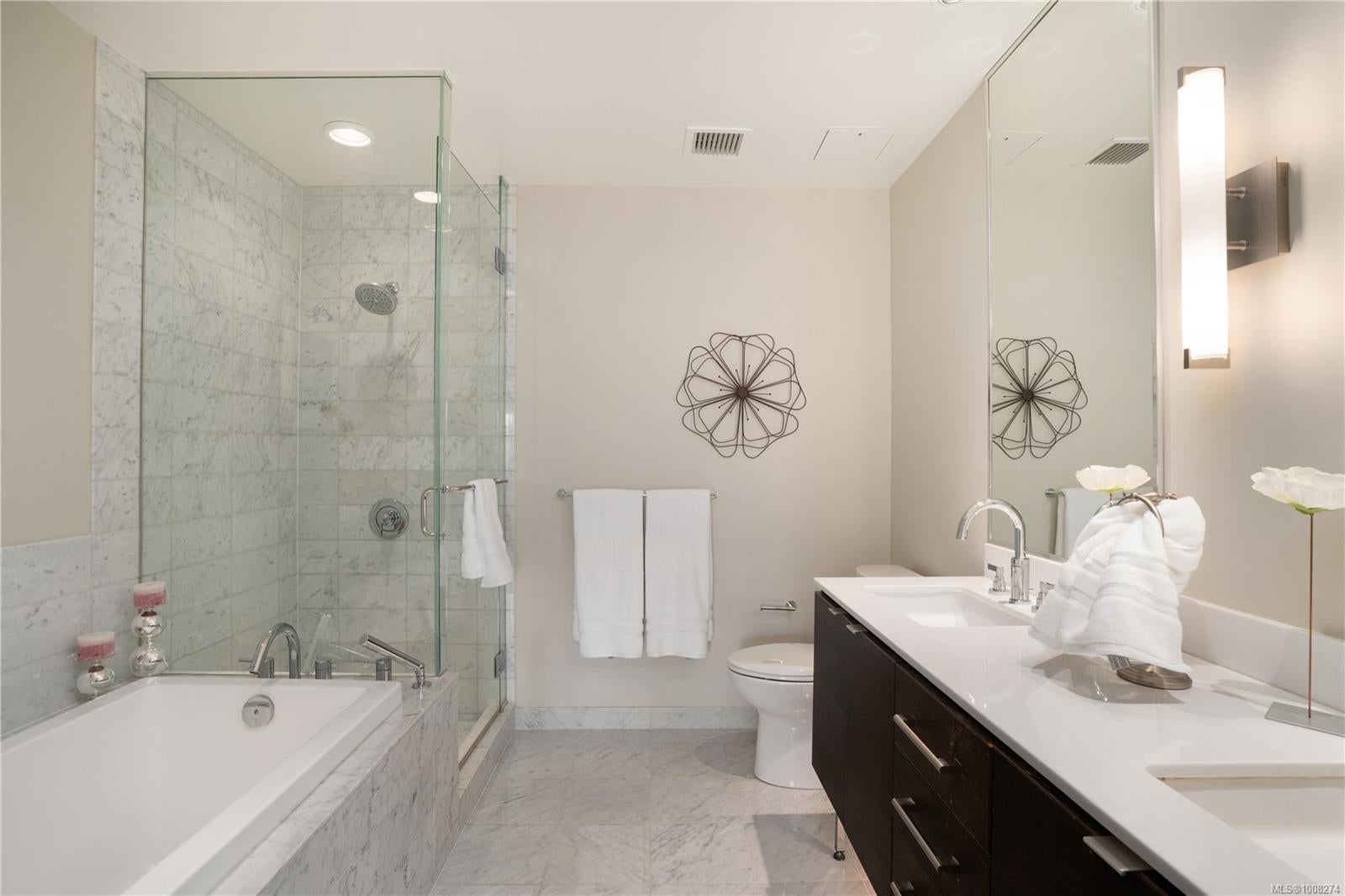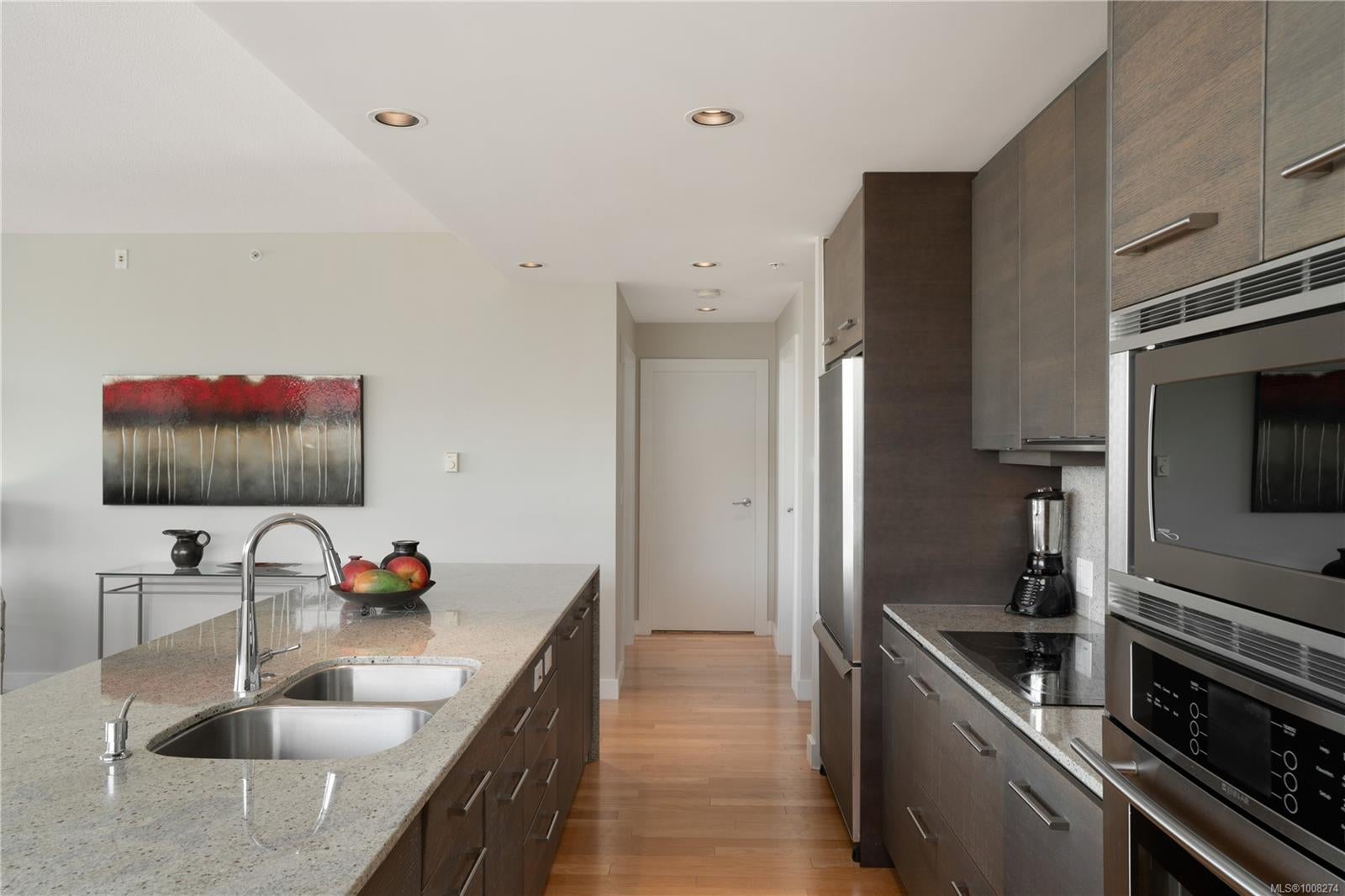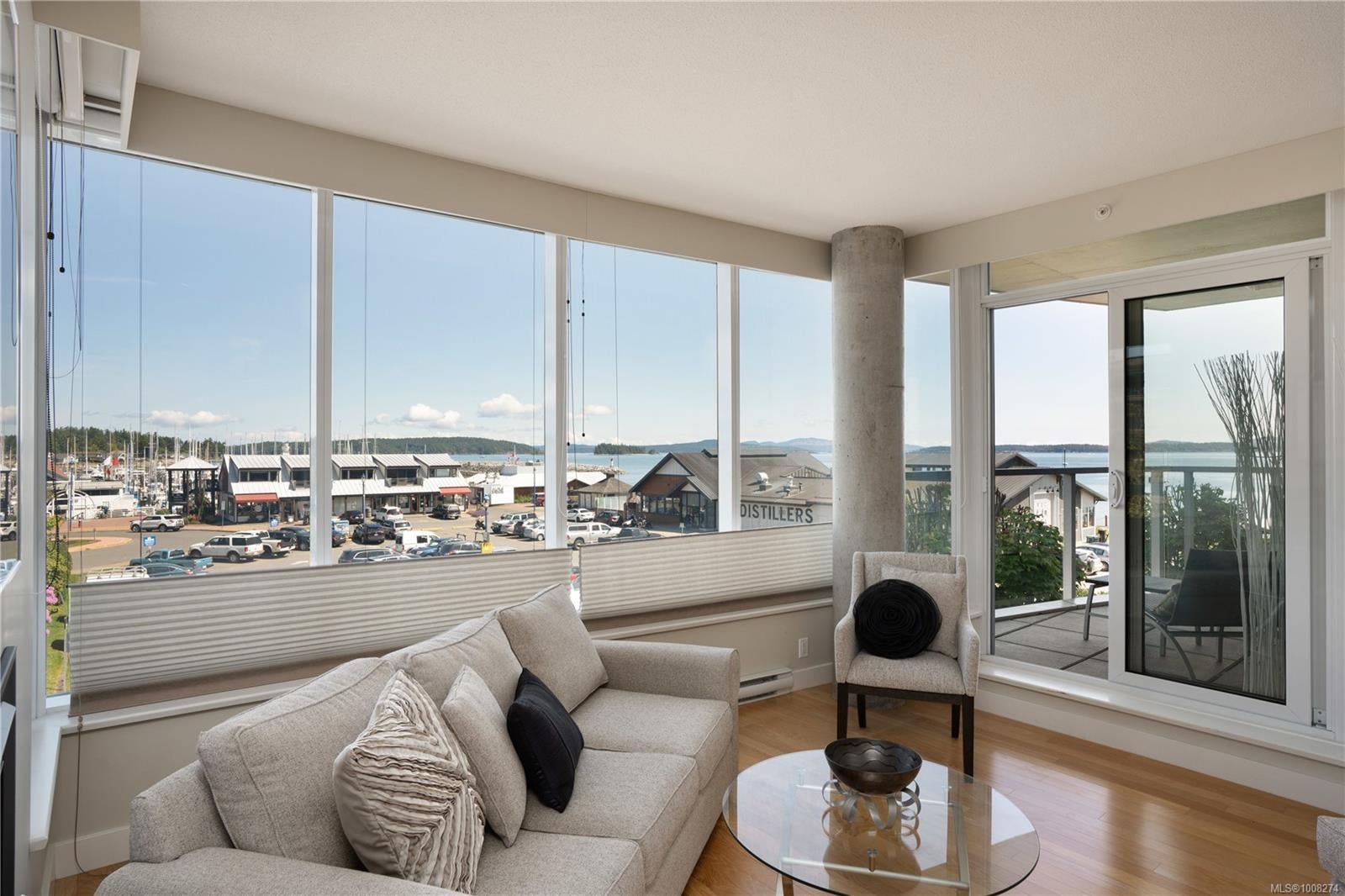 Seaport: Enjoy ocean views & marine activity from morning to night in this bright, exceptional corner condo in a distinctive steel & concrete building connected to the Sidney Pier Hotel. Just steps from the scenic waterfront walkway & Sidney marina it represents a sophisticated lifestyle with local markets, shops & cafes all within a block. Inside, the open-concept layout with huge windows offer plenty of natural light. Features include geothermal heating and cooling, hardwood floors, high ceilings, roller blinds, granite countertops & high-end appliances. The primary bedroom has a five-piece ensuite, and the second bedroom is beside a full bathroom. A separate den offers overflow guest accommodation or a functional workspace. At Seaport Place, you have a designated parking space (2 more available to purchase) & sep storage unit. All just minutes from Victoria International Airport & BC Ferries. An exceptional choice for those seeking comfort, convenience & location.