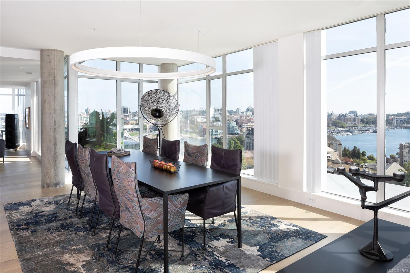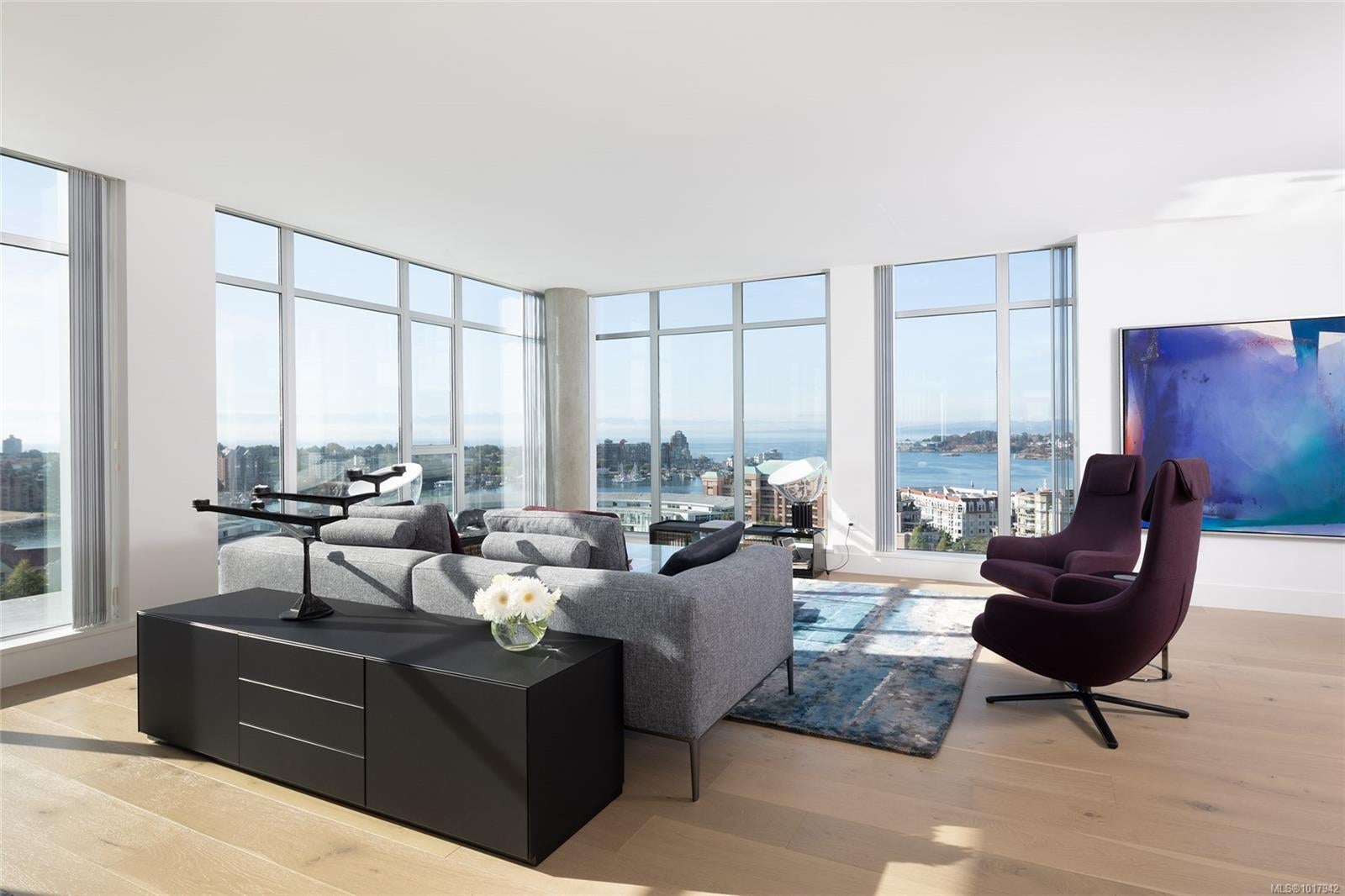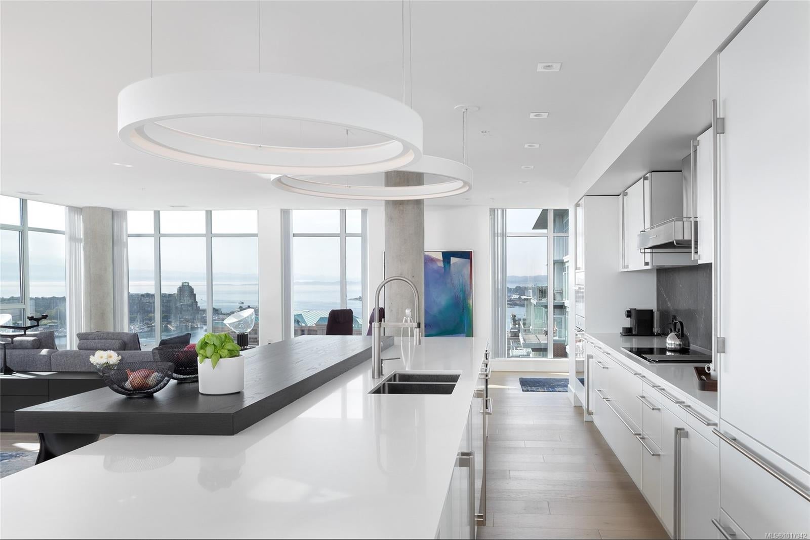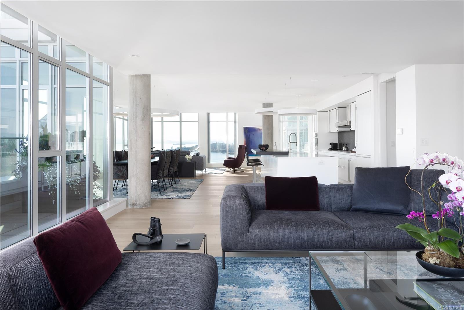Perched high on one of Victoria's most prestigious buildings, this one-of-a-kind, 4234 sq ft penthouse offers unparalleled luxury and breathtaking panoramic views. With a rare position that overlooks the dynamic activity of the Inner Harbour, the tranquil waters, and majestic mountain vistas, this home spans East, South, and West, providing views of the Olympic Mountains, Port Angeles, and the iconic Mt. Baker. The open-concept design is flooded with natural light, thanks to expansive windows that frame the ever-changing scenery. Every inch of this residence has been meticulously curated and extensively renovated in 2022, blending sophisticated elegance with modern functionality. The home boasts three luxurious bedrooms, each with its own ensuite bathroom, a stunning media room, and a spacious butler’s pantry off the chef-inspired kitchen. Crafted with the finest materials, the property features engineered flooring with a ¾” plywood base for exceptional stability, locally sourced marble, and high-end appliances. High-tech elements such as an integrated Whole House electrical system, electric window blinds, and heat pumps ensure both convenience and comfort. The building itself is regarded as one of the best in Victoria, offering exclusive amenities such as a concierge, a common entertainment room with a pool table, outdoor BBQ area, gym, hot tub, sauna, and even a dog-washing facility. Additional luxuries include four parking stalls in a secure, heated underground garage and two oversized storage lockers. This penthouse epitomizes the pinnacle of refined living in Victoria, combining space, style, and spectacular surroundings.