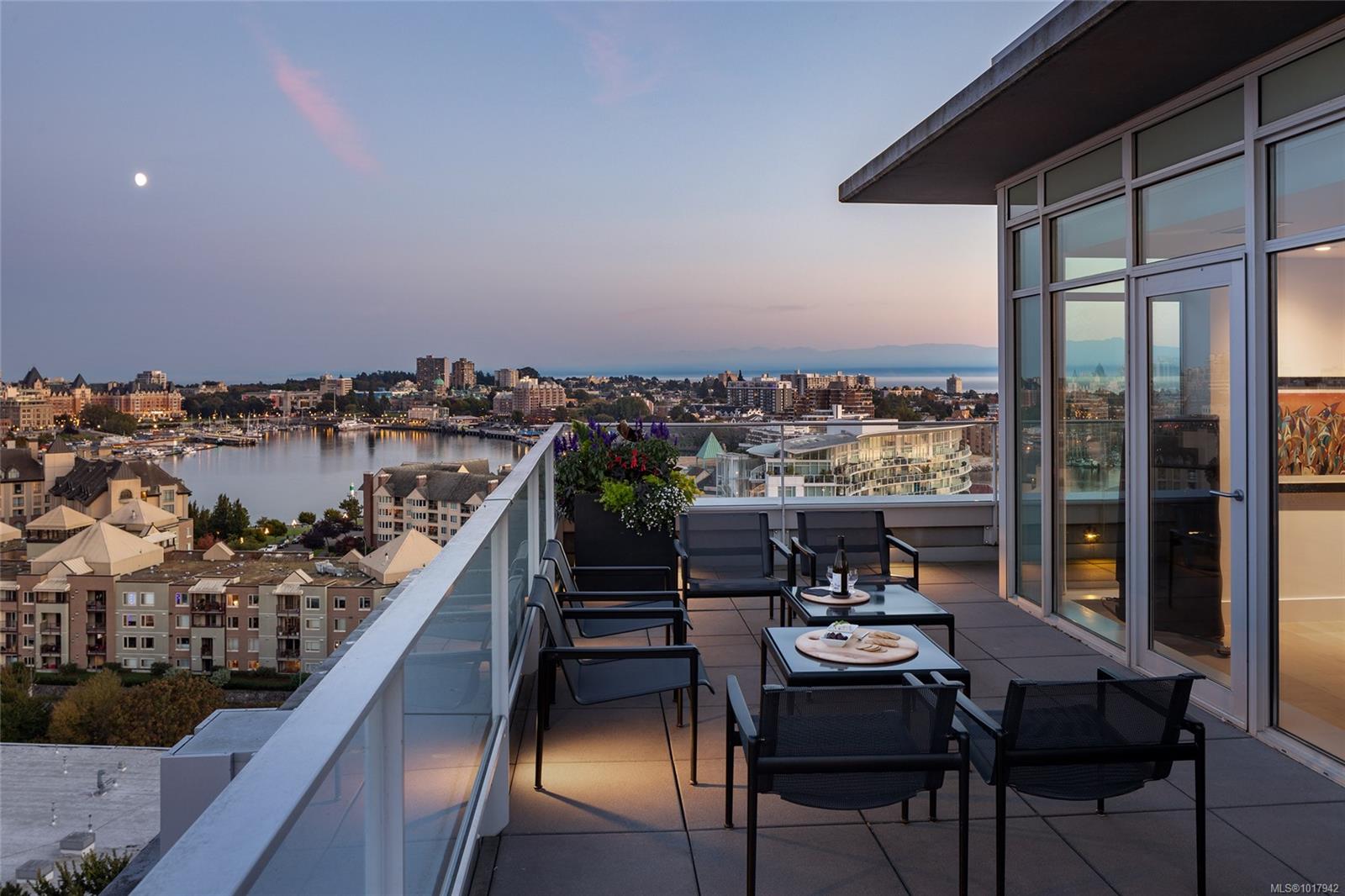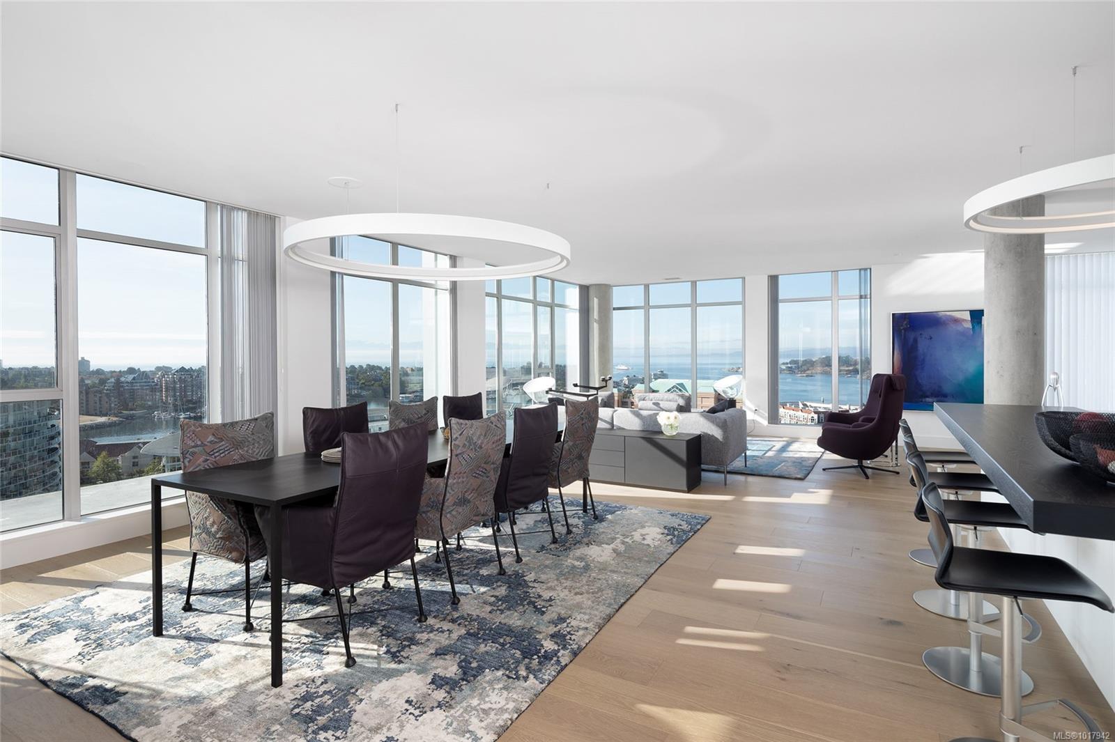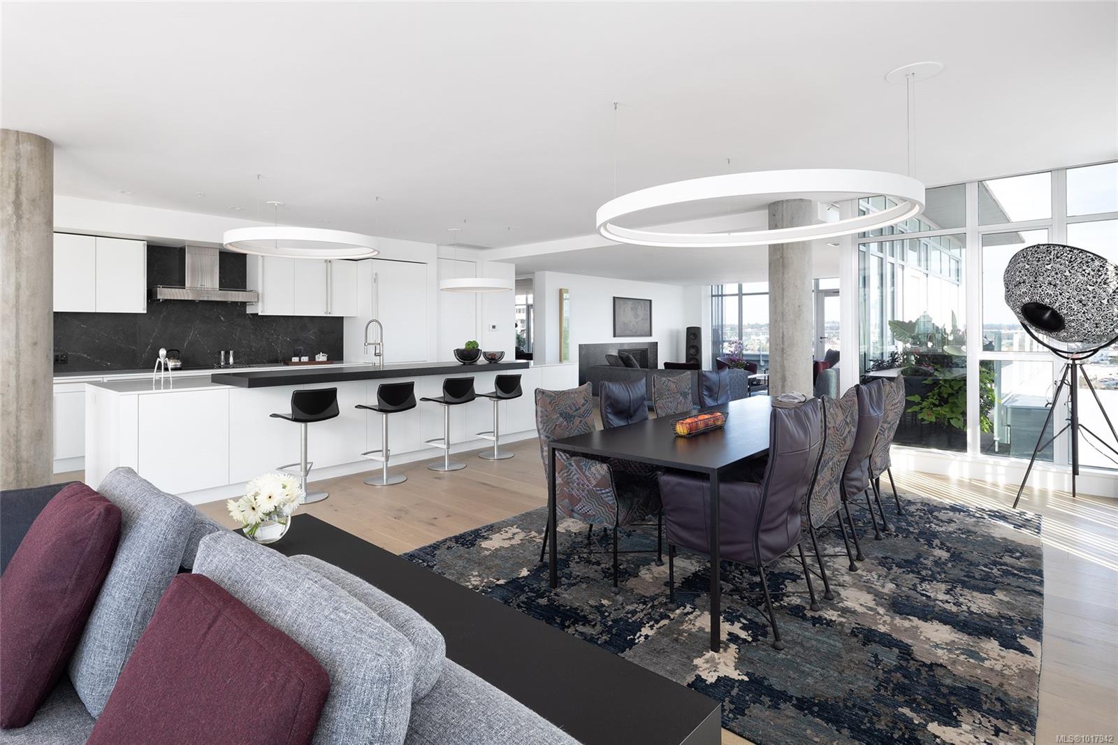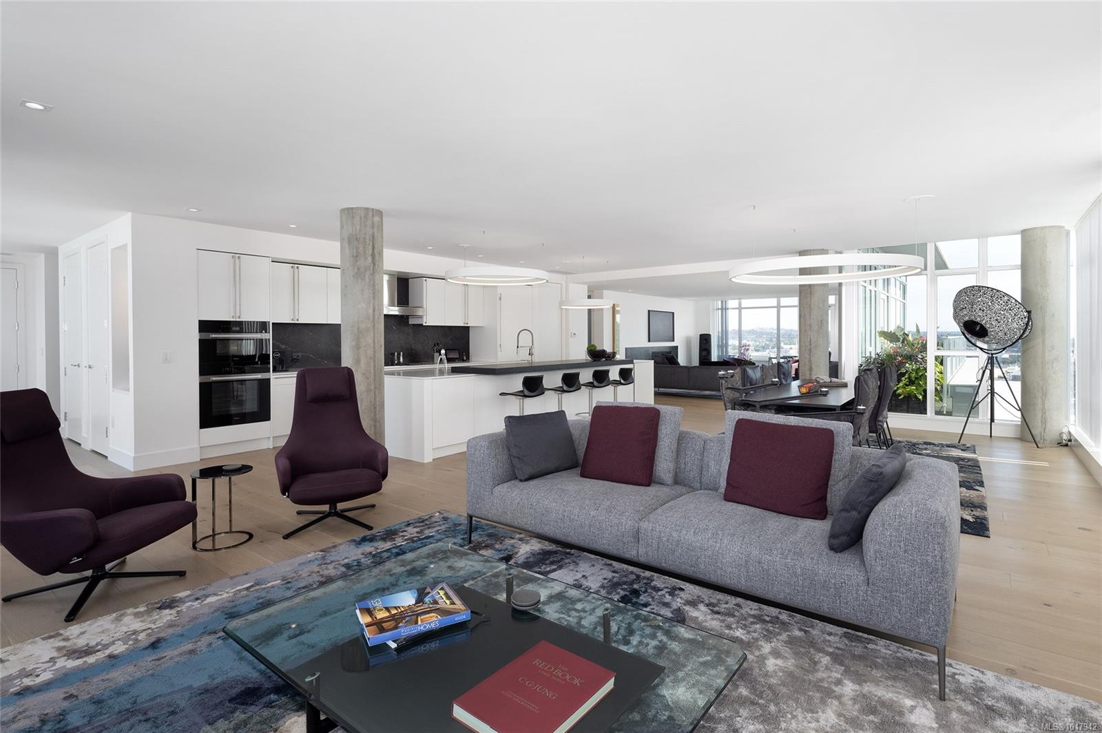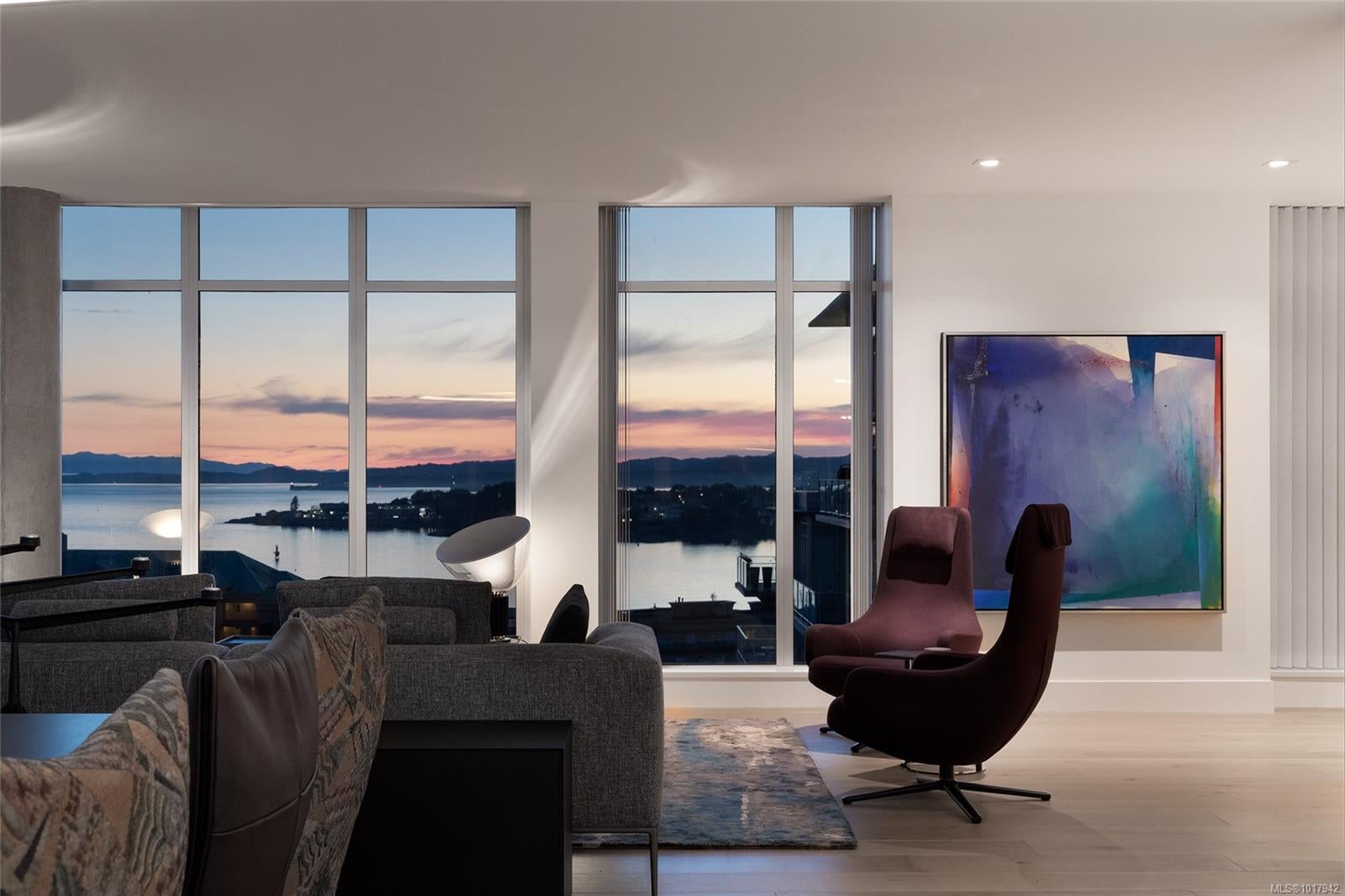 Perched high on one of Victoria's most prestigious buildings, this one-of-a-kind, 4234 sq ft penthouse offers unparalleled luxury and breathtaking panoramic views. With a rare position that overlooks the dynamic activity of the Inner Harbour, the tranquil waters, and majestic mountain vistas, this home spans East, South, and West, providing views of the Olympic Mountains, Port Angeles, and the iconic Mt. Baker. The open-concept design is flooded with natural light, thanks to expansive windows that frame the ever-changing scenery. Every inch of this residence has been meticulously curated and extensively renovated in 2022, blending sophisticated elegance with modern functionality. The home boasts three luxurious bedrooms, each with its own ensuite bathroom, a stunning media room, and a spacious butler’s pantry off the chef-inspired kitchen. Crafted with the finest materials, the property features engineered flooring with a ¾” plywood base for exceptional stability, locally sourced marble, and high-end appliances. High-tech elements such as an integrated Whole House electrical system, electric window blinds, and heat pumps ensure both convenience and comfort. The building itself is regarded as one of the best in Victoria, offering exclusive amenities such as a concierge, a common entertainment room with a pool table, outdoor BBQ area, gym, hot tub, sauna, and even a dog-washing facility. Additional luxuries include four parking stalls in a secure, heated underground garage and two oversized storage lockers. This penthouse epitomizes the pinnacle of refined living in Victoria, combining space, style, and spectacular surroundings.