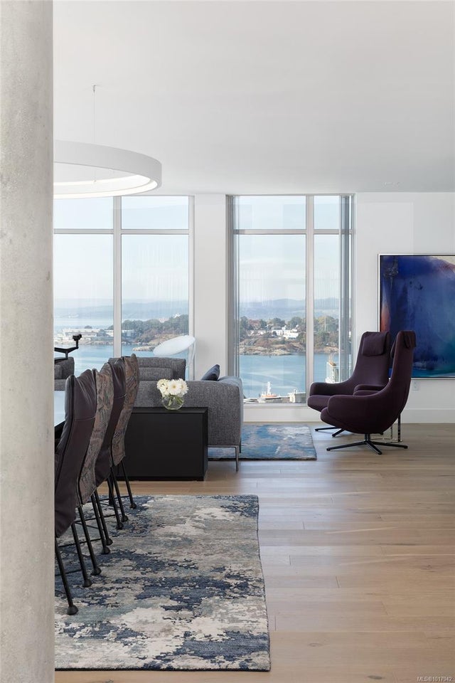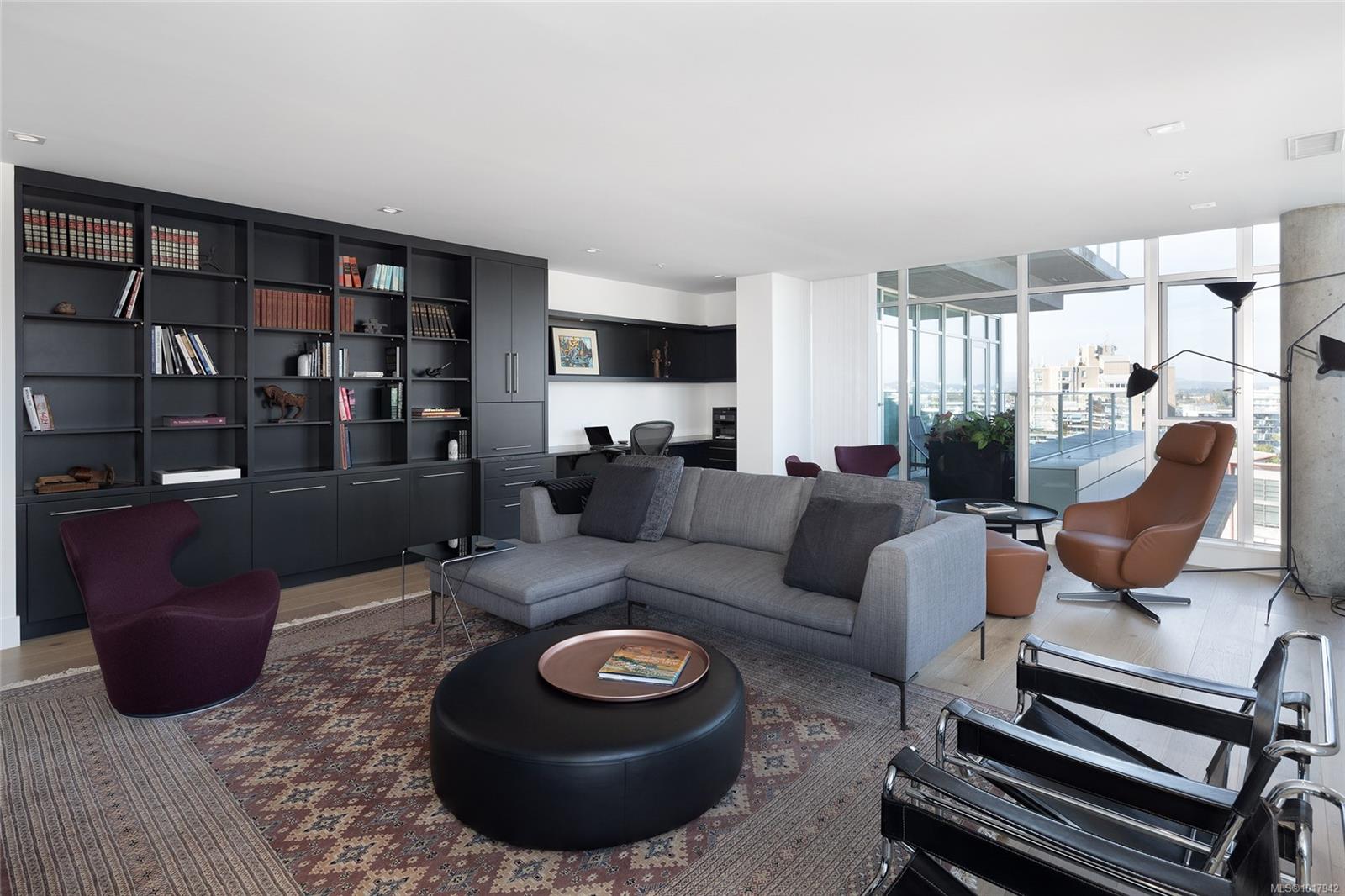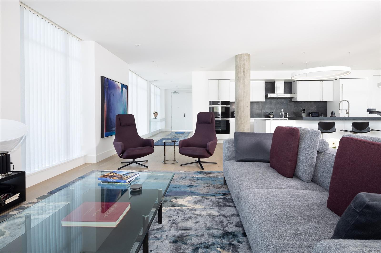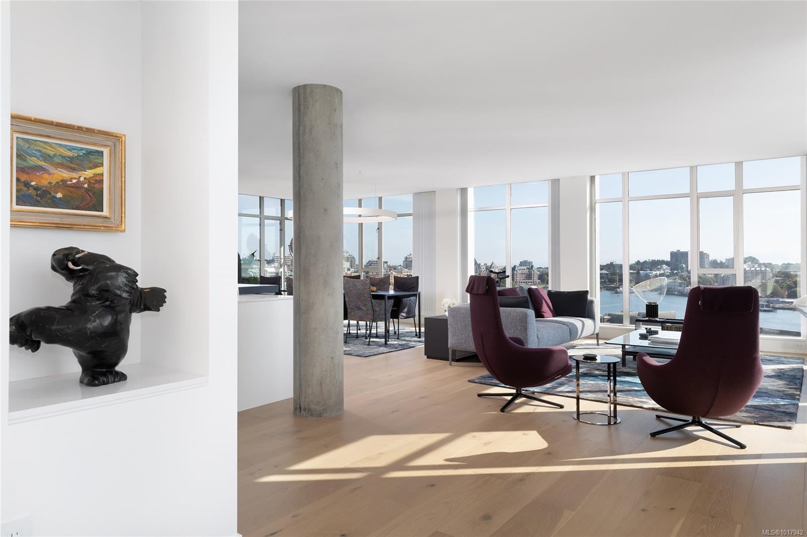 Perched high on one of Victoria's most prestigious buildings, this one-of-a-kind, 4234 sq ft penthouse offers unparalleled luxury and breathtaking panoramic views. With a rare position that overlooks the dynamic activity of the Inner Harbour, the tranquil waters, and majestic mountain vistas, this home spans East, South, and West, providing views of the Olympic Mountains, Port Angeles, and the iconic Mt. Baker. The open-concept design is flooded with natural light, thanks to expansive windows that frame the ever-changing scenery. Every inch of this residence has been meticulously curated and extensively renovated in 2022, blending sophisticated elegance with modern functionality. The home boasts three luxurious bedrooms, each with its own ensuite bathroom, a stunning media room, and a spacious butler’s pantry off the chef-inspired kitchen. Crafted with the finest materials, the property features engineered flooring with a ¾” plywood base for exceptional stability, locally sourced marble, and high-end appliances. High-tech elements such as an integrated Whole House electrical system, electric window blinds, and heat pumps ensure both convenience and comfort. The building itself is regarded as one of the best in Victoria, offering exclusive amenities such as a concierge, a common entertainment room with a pool table, outdoor BBQ area, gym, hot tub, sauna, and even a dog-washing facility. Additional luxuries include four parking stalls in a secure, heated underground garage and two oversized storage lockers. This penthouse epitomizes the pinnacle of refined living in Victoria, combining space, style, and spectacular surroundings.