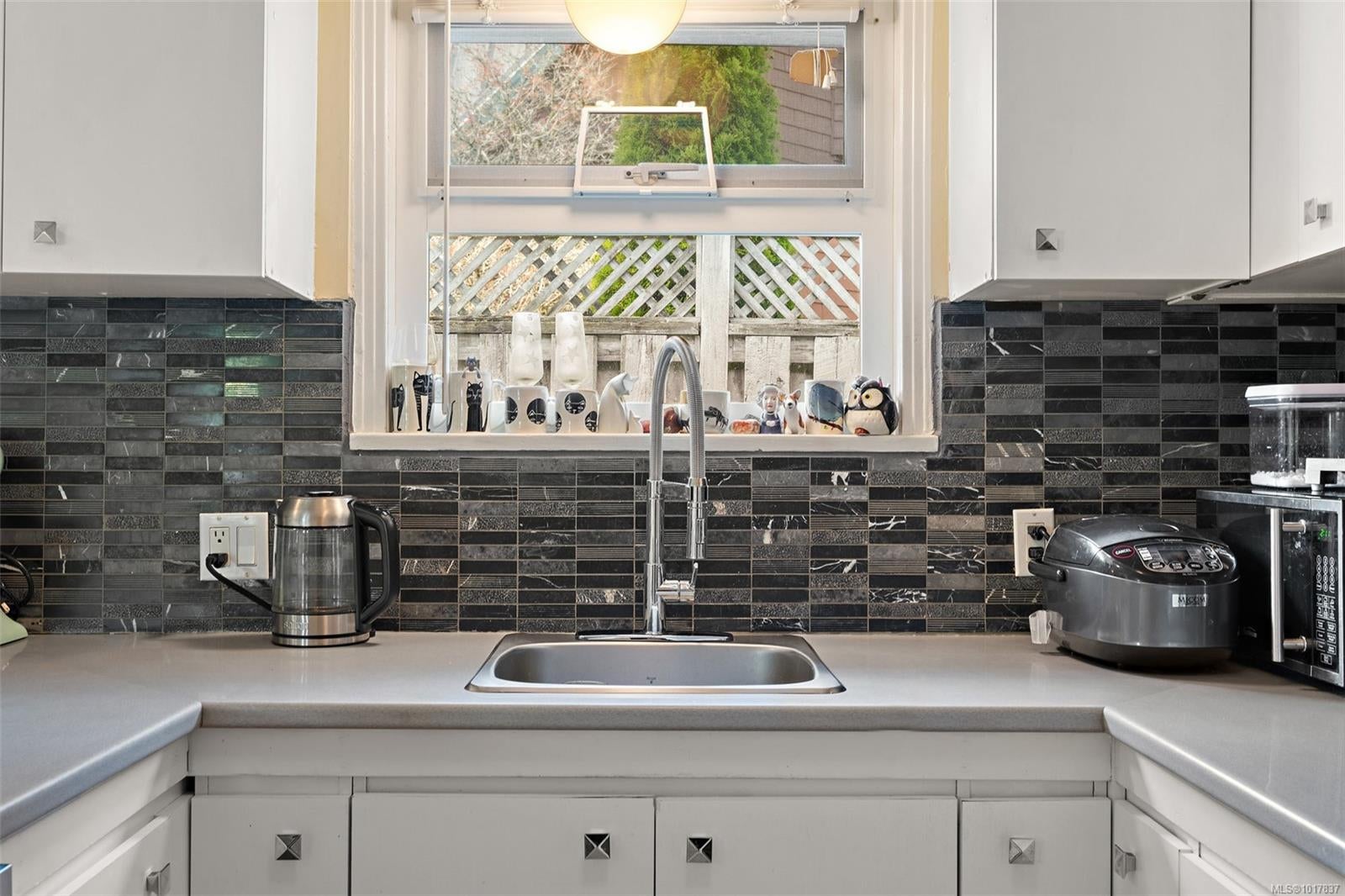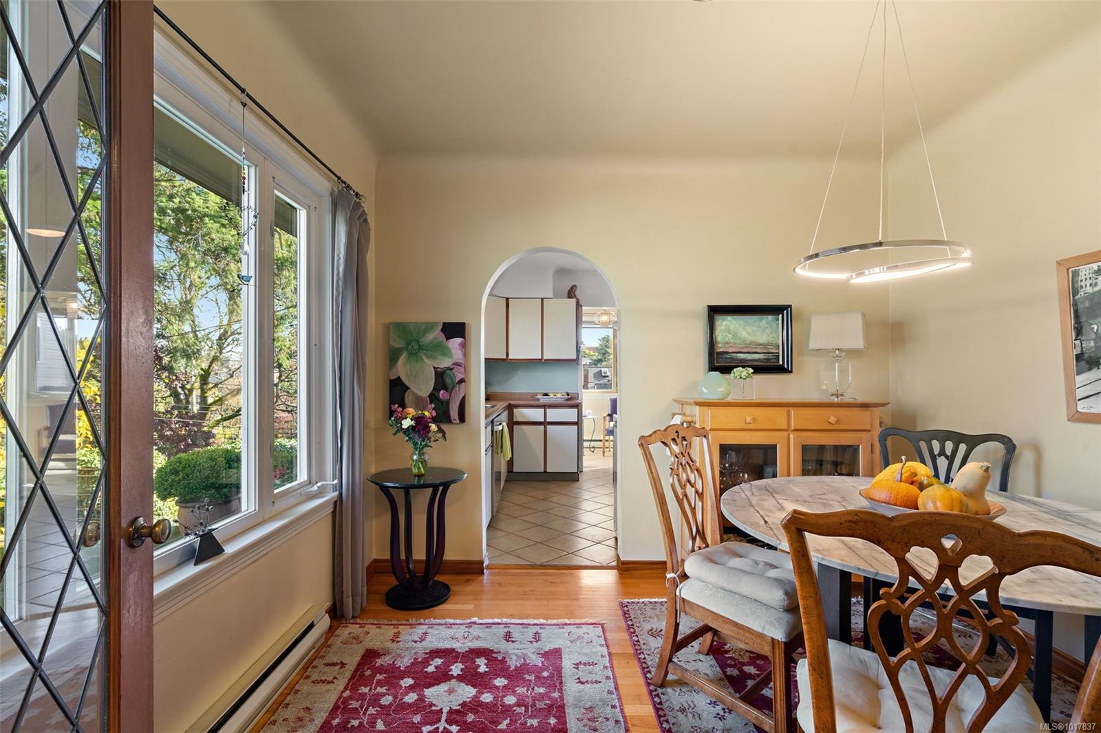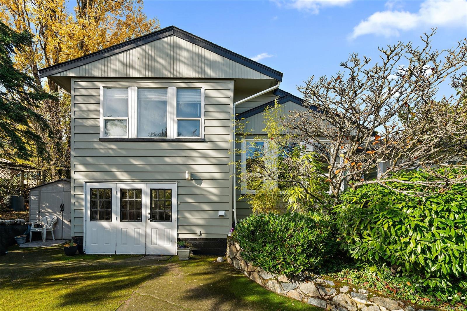 Step into this charming 1948 character home, where timeless style meets modern versatility. Warm wood floors, elegant coved ceilings, and a cozy wood-burning fireplace create a sense of comfort and nostalgia, while abundant natural light fills every corner. The main home features three spacious bedrooms, including a sun-drenched primary suite with a skylight and private 2-piece ensuite. From the kitchen, watch the morning sun rise over a peaceful landscape, or relax on the large, private patio surrounded by lush greenery with water views. Thoughtfully designed in a front-and-back duplex style, this property is perfect for multi-generational living or added privacy. The suite offers a bright, inviting space with 1 bedroom plus a den (or 2nd bedroom), a cozy fireplace, and a private deck. Nestled in a quiet, friendly neighborhood close to parks, schools, and every convenience, this home offers the perfect balance of character, flexibility, and comfort — a truly special place to call home.