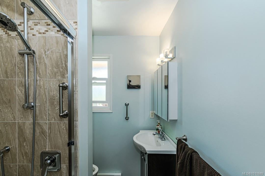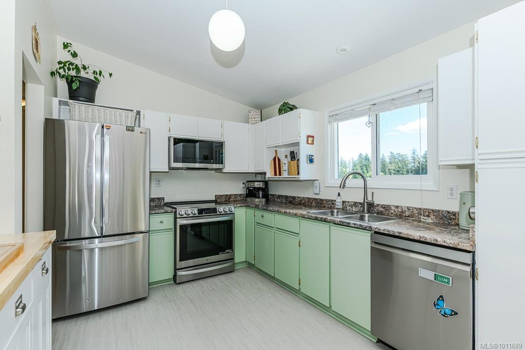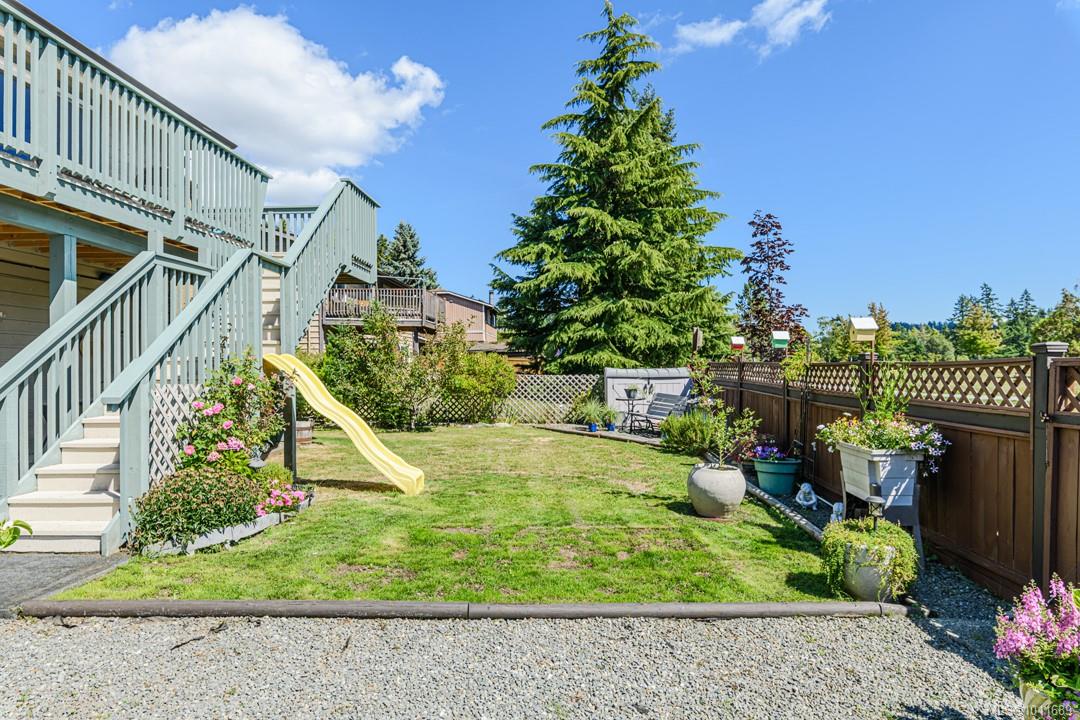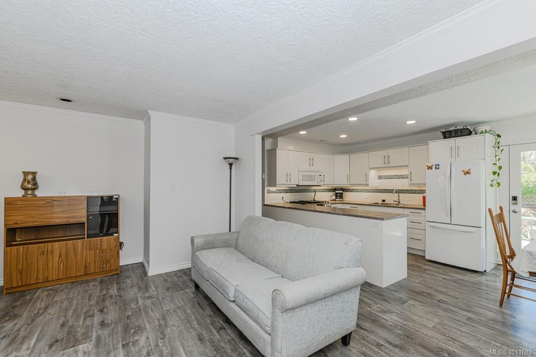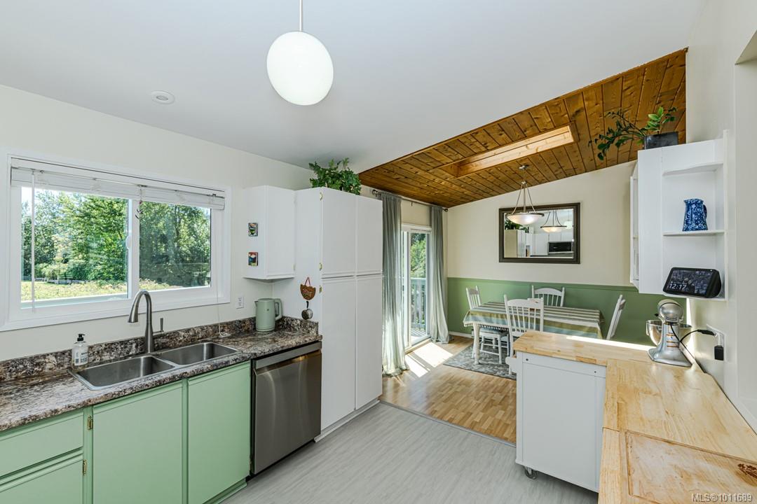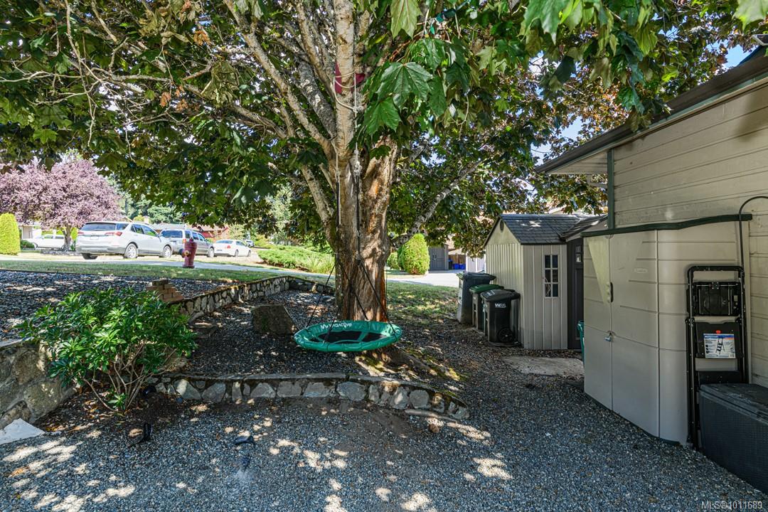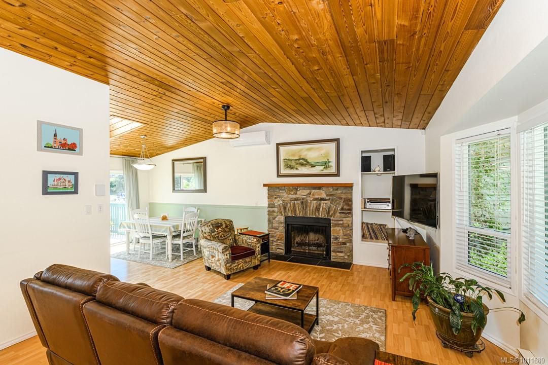 Home Business? Check out the flexible inlaw area w/kitchenette, 3pc bath & sep entrance, perfect for guests & extended family. Updated, multi-generational home on a no thru street, VR Park is an extension of the beautiful level backyard. Enjoy level entry living w/3 beds/2 baths up & income in legal 2 bed/1 bath suite. Open-concept layout shows off the vaulted wood ceilings & handsome rock fireplace, with spacious dining opening to new deck & fully fenced, landscaped yard. Skylights&lrg windows let the light flood in year round while the heat pump regulates for comfort. Other great updates include: 8yr roof, hot water on demand!, 2 laundries, & newer appliances. Yard offers fruit trees, gardens, generous storage, covered patio for the suite & locked gate to park for endless opportunities to bike, play, & off-leash walks. Ample parking for tenants or toys. Close to schools, E&N Trail, Eagle Creek shopping, Thetis Lake & local beaches, in a quiet, family-friendly neighbourhood!