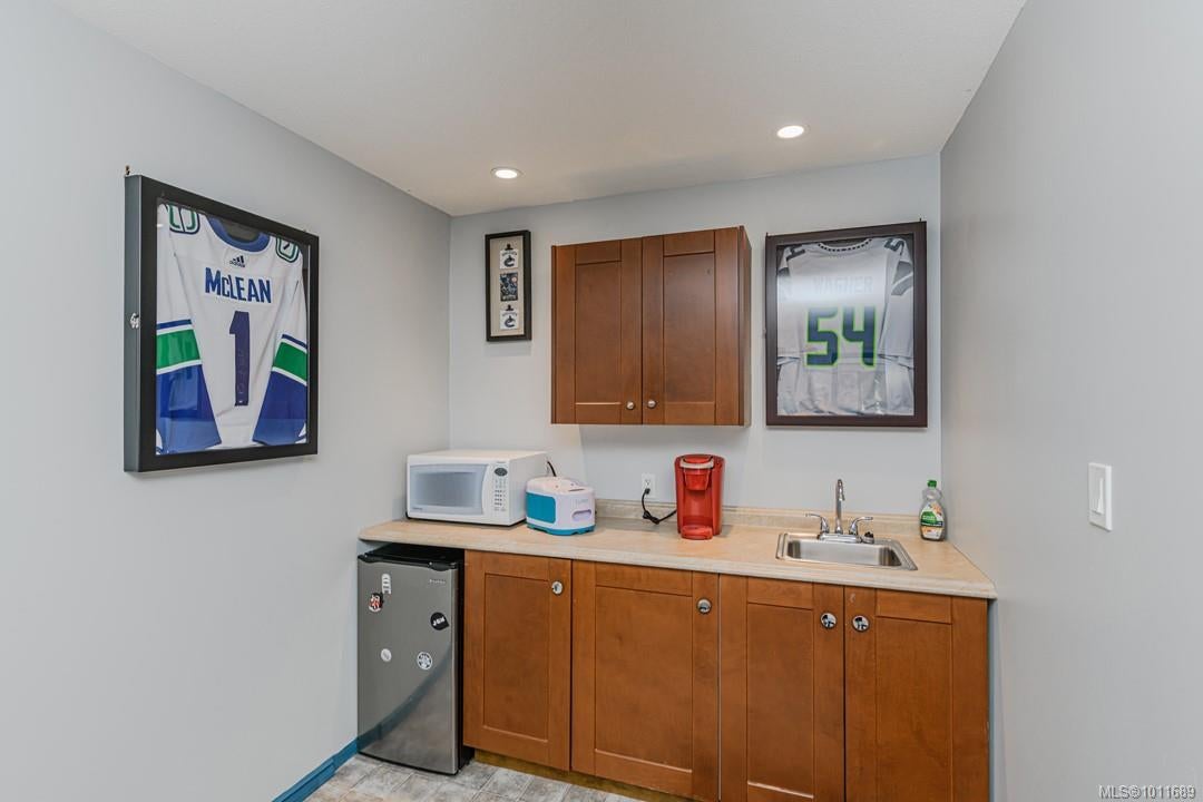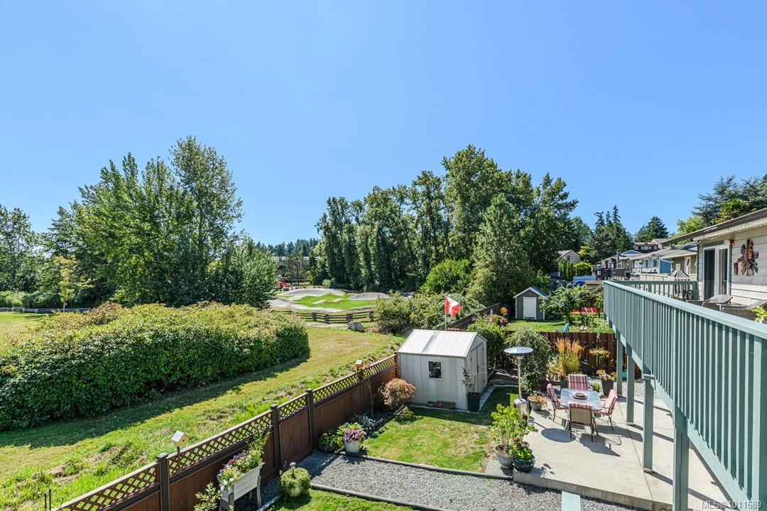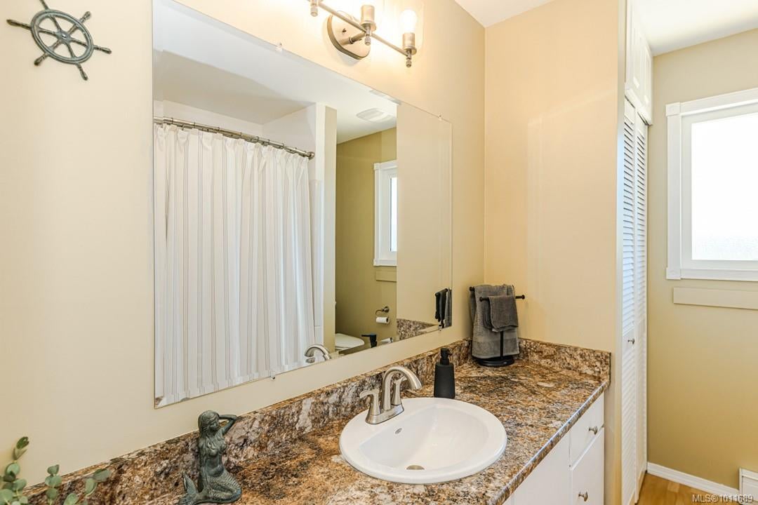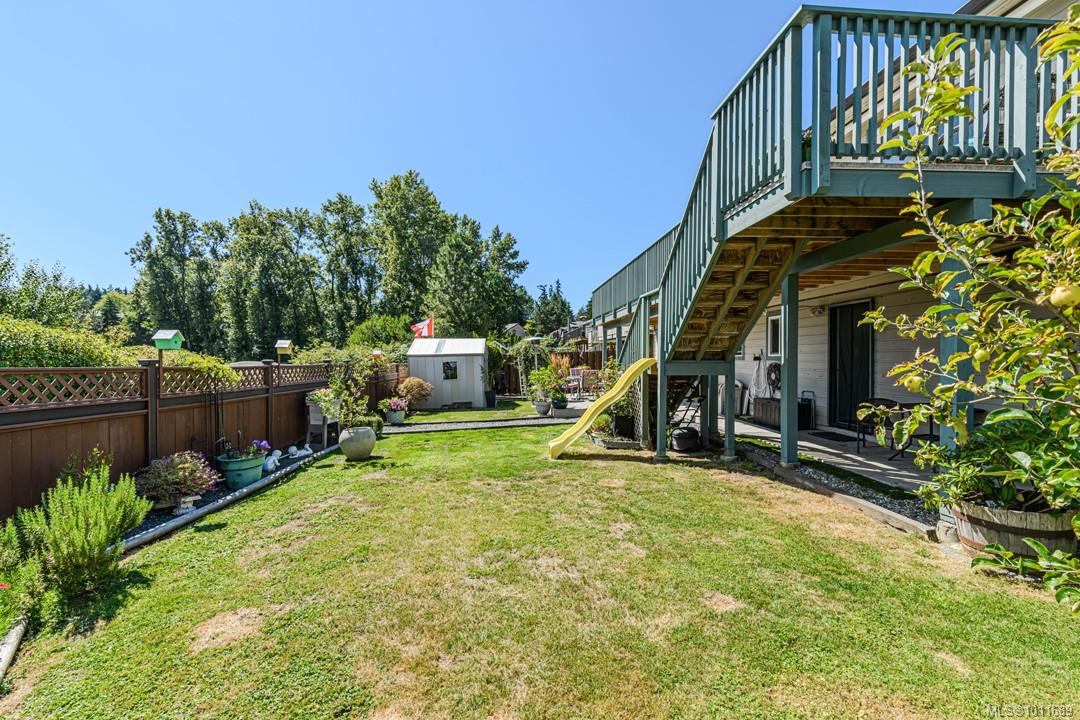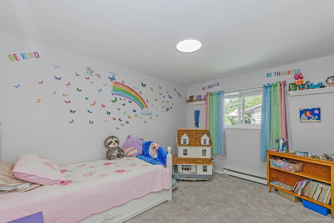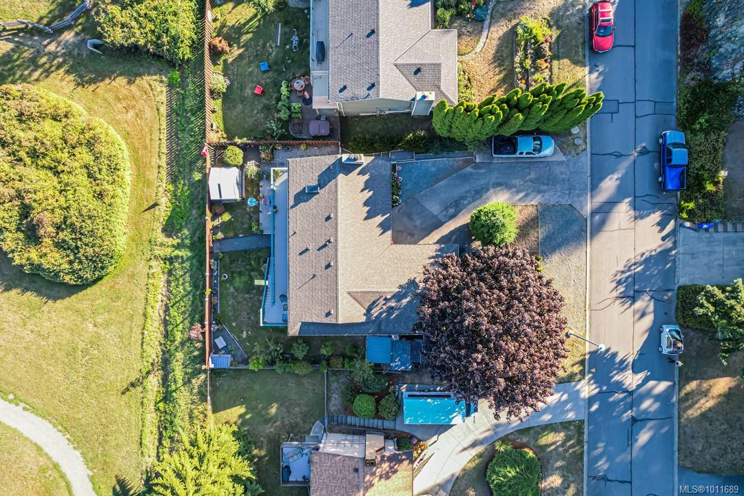 Home Business? Check out the flexible inlaw area w/kitchenette, 3pc bath & sep entrance, perfect for guests & extended family. Updated, multi-generational home on a no thru street, VR Park is an extension of the beautiful level backyard. Enjoy level entry living w/3 beds/2 baths up & income in legal 2 bed/1 bath suite. Open-concept layout shows off the vaulted wood ceilings & handsome rock fireplace, with spacious dining opening to new deck & fully fenced, landscaped yard. Skylights&lrg windows let the light flood in year round while the heat pump regulates for comfort. Other great updates include: 8yr roof, hot water on demand!, 2 laundries, & newer appliances. Yard offers fruit trees, gardens, generous storage, covered patio for the suite & locked gate to park for endless opportunities to bike, play, & off-leash walks. Ample parking for tenants or toys. Close to schools, E&N Trail, Eagle Creek shopping, Thetis Lake & local beaches, in a quiet, family-friendly neighbourhood!