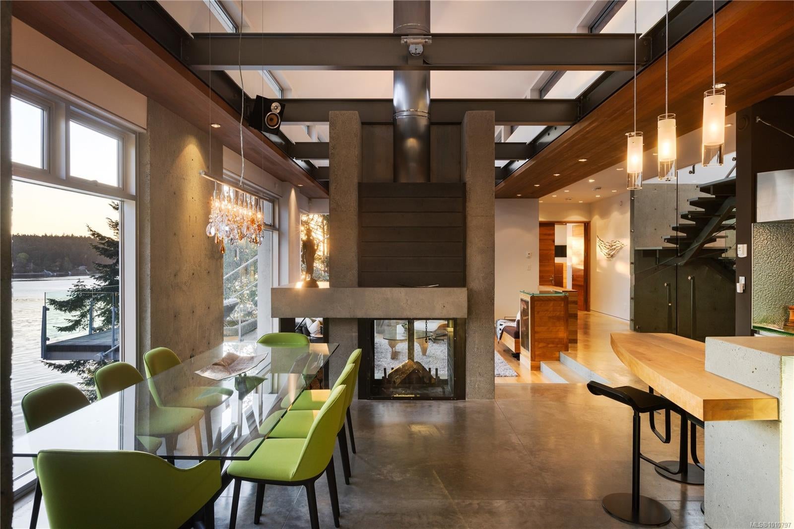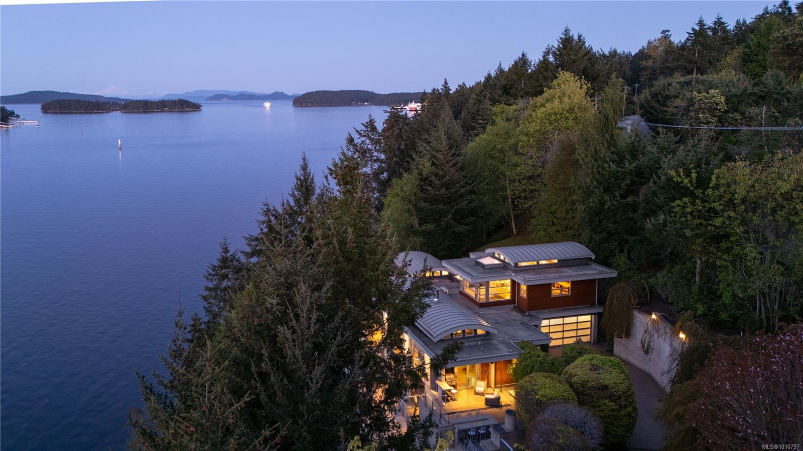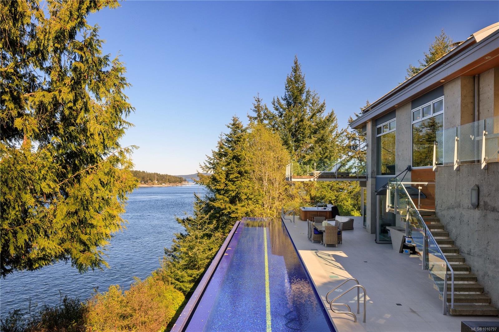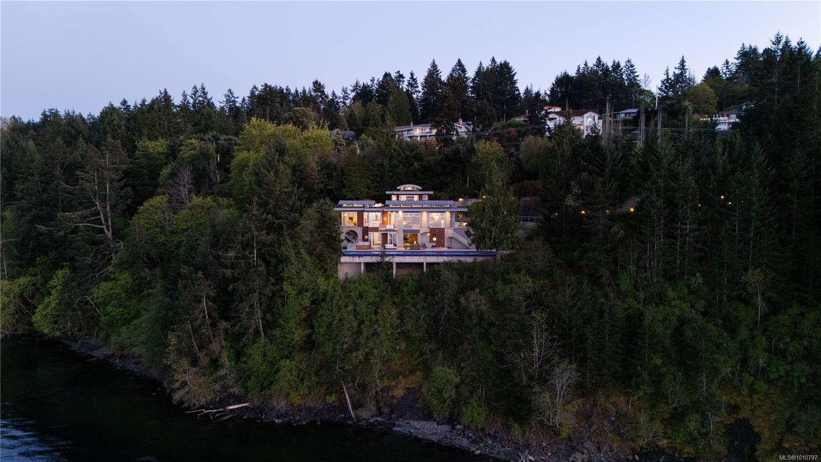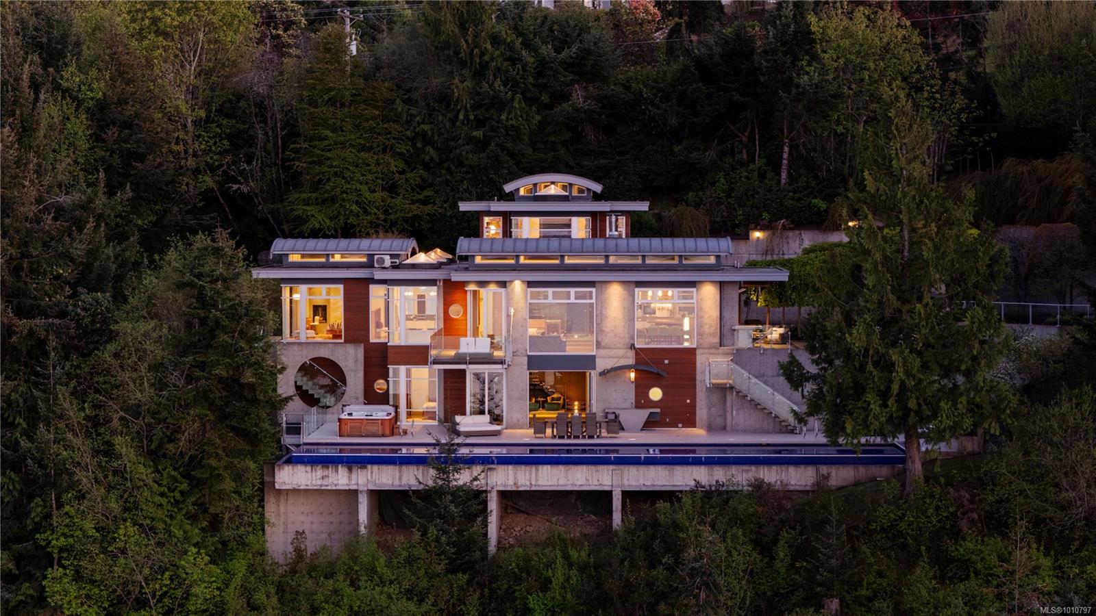 Oceanfront Masterpiece | Malibu Meets Vancouver Island. Experience a rare blend of oceanfront luxury and architectural brilliance in this custom steel and concrete estate home, set on 1.59 acres of private, landscaped grounds and 625 feet of ocean frontage. Floor-to-ceiling windows and signature porthole accents frame stunning panoramic views of the ocean, islands, and passing marine life. A bespoke flybridge extends from the living area, offering front-row views of the 82’ infinity lap pool—perfectly aligned to track the sun from sunrises over Mount Baker, to glowing sunsets on the water. Inside, sustainable geothermal heating warms polished concrete floors, beautifully paired with the rich hues of inlaid wood, floating stair rungs, and custom cabinetry. The main floor primary suite is a serene retreat with spa-inspired ensuite and sweeping vistas. The lower level offers guest accommodations, a media room, wine cellar, and a poolside gym with retractable glass doors for seamless indoor-outdoor living. Upstairs, a flexible family room or office provides a quiet escape. The kitchen opens to an outdoor BBQ area with a fireplace and concrete formed dining table. A man-made stream and modern waterfall enhance the natural ambiance. Designed by Daniel Boot, this home is a true coastal sanctuary—private and peaceful, yet minutes from shops, dining, and marinas.