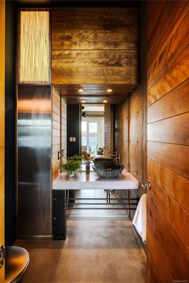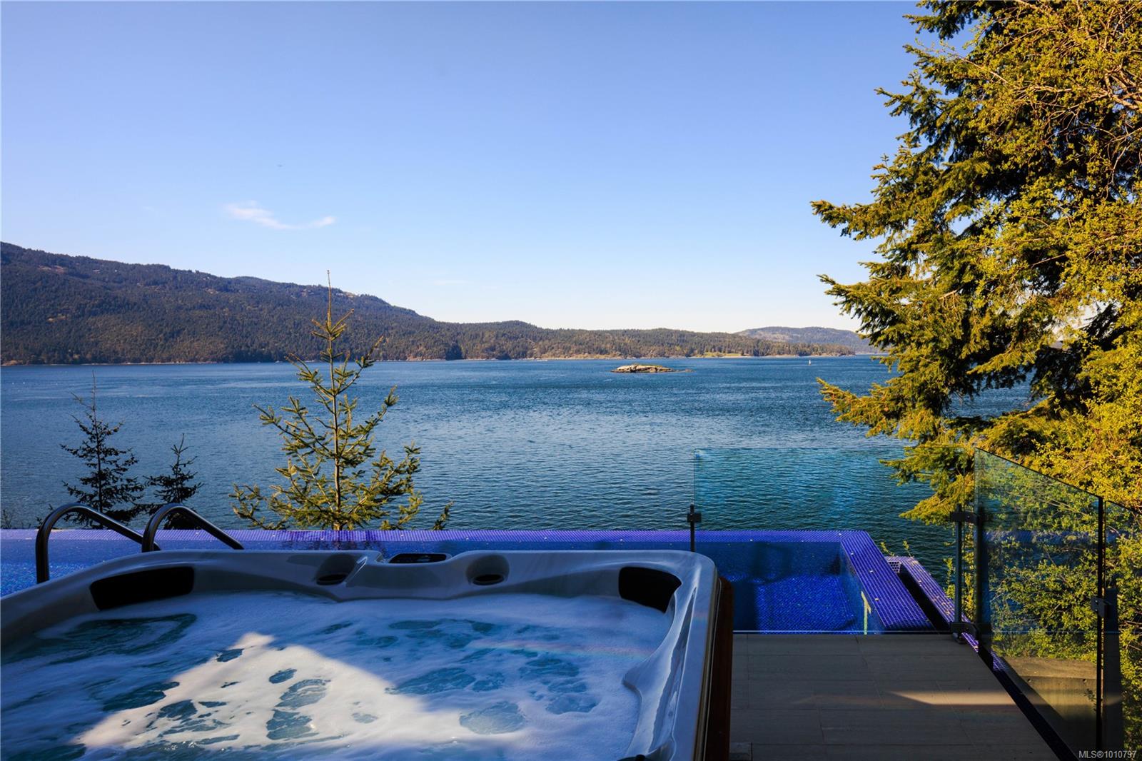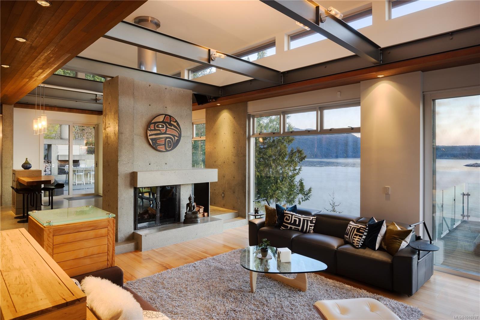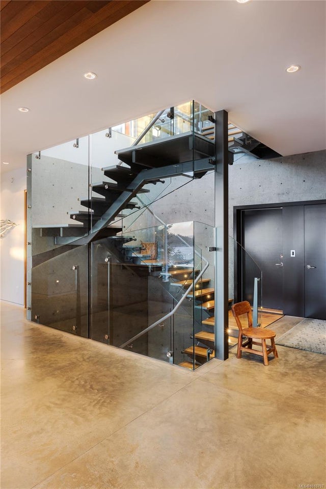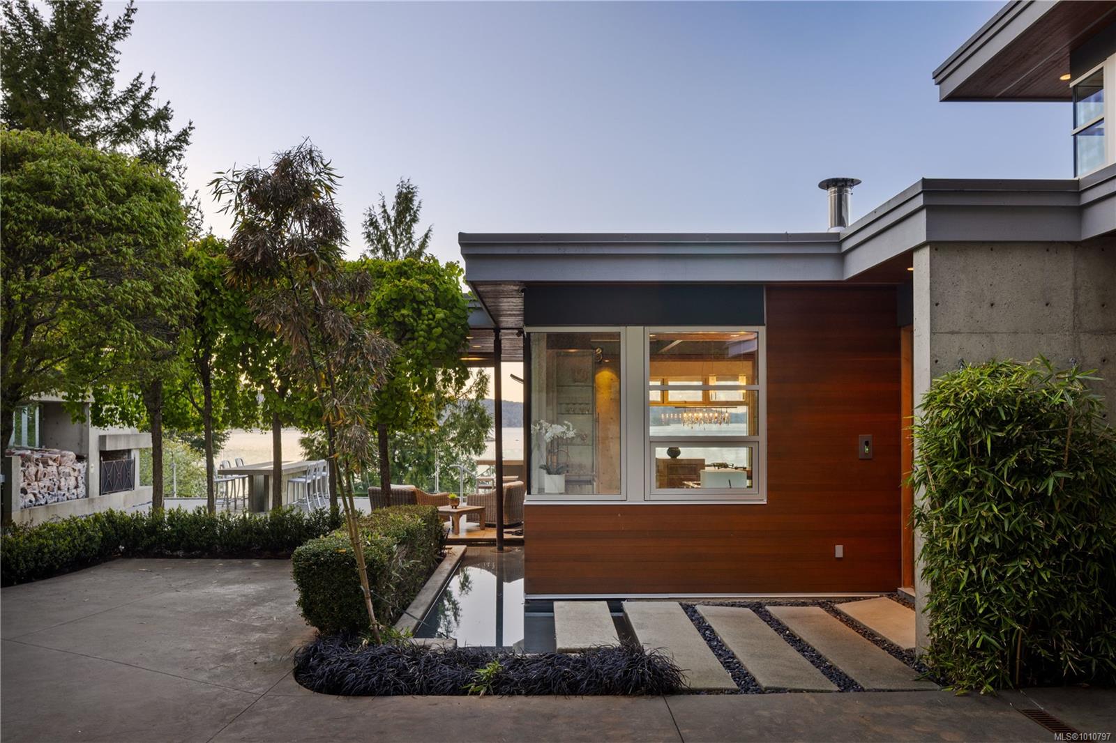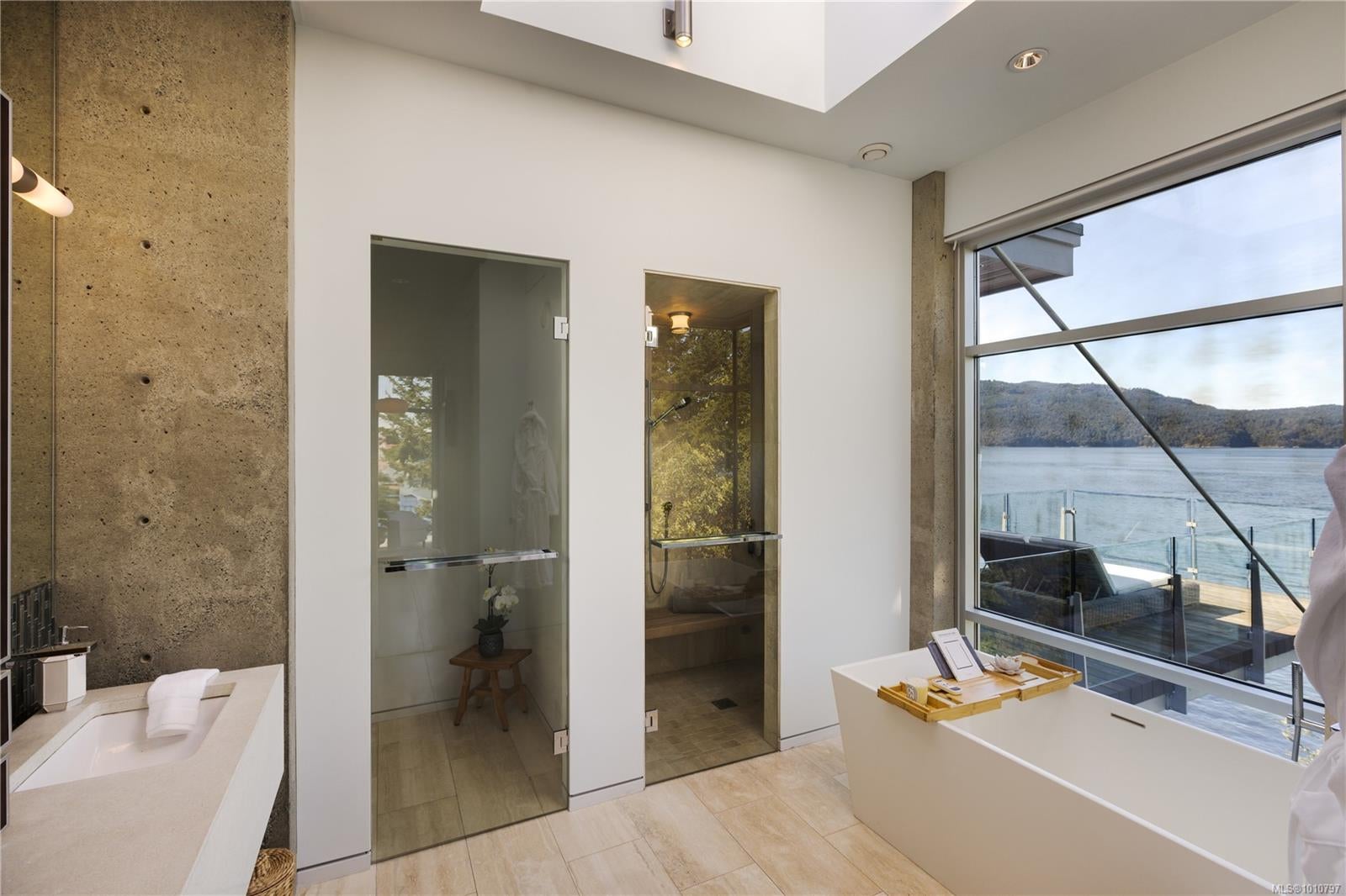 Oceanfront Masterpiece | Malibu Meets Vancouver Island. Experience a rare blend of oceanfront luxury and architectural brilliance in this custom steel and concrete estate home, set on 1.59 acres of private, landscaped grounds and 625 feet of ocean frontage. Floor-to-ceiling windows and signature porthole accents frame stunning panoramic views of the ocean, islands, and passing marine life. A bespoke flybridge extends from the living area, offering front-row views of the 82’ infinity lap pool—perfectly aligned to track the sun from sunrises over Mount Baker, to glowing sunsets on the water. Inside, sustainable geothermal heating warms polished concrete floors, beautifully paired with the rich hues of inlaid wood, floating stair rungs, and custom cabinetry. The main floor primary suite is a serene retreat with spa-inspired ensuite and sweeping vistas. The lower level offers guest accommodations, a media room, wine cellar, and a poolside gym with retractable glass doors for seamless indoor-outdoor living. Upstairs, a flexible family room or office provides a quiet escape. The kitchen opens to an outdoor BBQ area with a fireplace and concrete formed dining table. A man-made stream and modern waterfall enhance the natural ambiance. Designed by Daniel Boot, this home is a true coastal sanctuary—private and peaceful, yet minutes from shops, dining, and marinas.