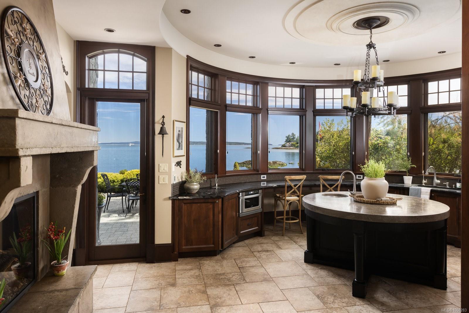 We proudly present this sophisticated West Coast waterfront retreat, showcasing breathtaking southerly panoramic ocean views of the Gulf Islands and Mount Baker. With its soaring ceilings and expansive windows, this solid stone residence creates a sensation of floating on water, offering an unparalleled living experience. Prepare to be mesmerized by the meticulous attention to detail and this home's high-quality construction and finishes, including walnut flooring imported from France, seven indoor fireplaces and custom millwork throughout. With a ground-level entry, guest quarters on the main floor and an elevator to the second level, the home offers enhanced accessibility. The main level boasts an exquisite circular kitchen with high-end appliances and a butler's pantry. The formal dining room is perfect for hosting elegant dinners, while the great room, featuring 21-foot ceilings, creates a grand yet inviting atmosphere. A charming study with built-in shelves and a coffered ceiling provides an ideal home office. Ascending the spiral staircase, you'll find a luxurious primary suite with a circular balcony offering ocean vistas, a serene reading nook, and a relaxing sauna, providing a private sanctuary for rest and rejuvenation. Enjoy your private enclosed sunroom, conveniently accessible from the primary bedroom's walk-in closet. The deluxe media room is ideal for movie nights, while the family room, with its convenient kitchenette and games room, offers additional space for activities. The exterior features are equally impressive, with expansive terraces perfect for outdoor dining, lounging and taking in the views. The low-maintenance, manicured grounds make upkeep easy, while a private hot tub patio offers a serene, relaxing space. Enjoy direct access to a sandy beach with a low-bank waterfront. Fully fenced and gated, this prime location is just minutes from all amenities, with convenient access to the Airport, BC Ferries and world-class marinas.