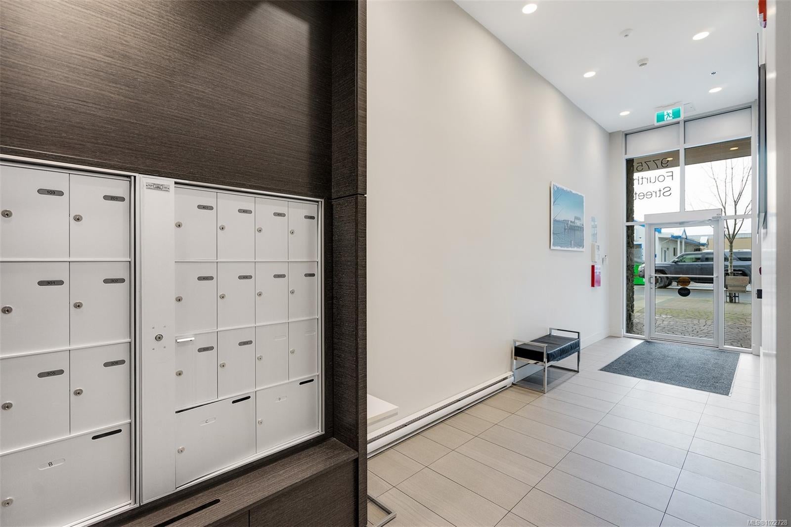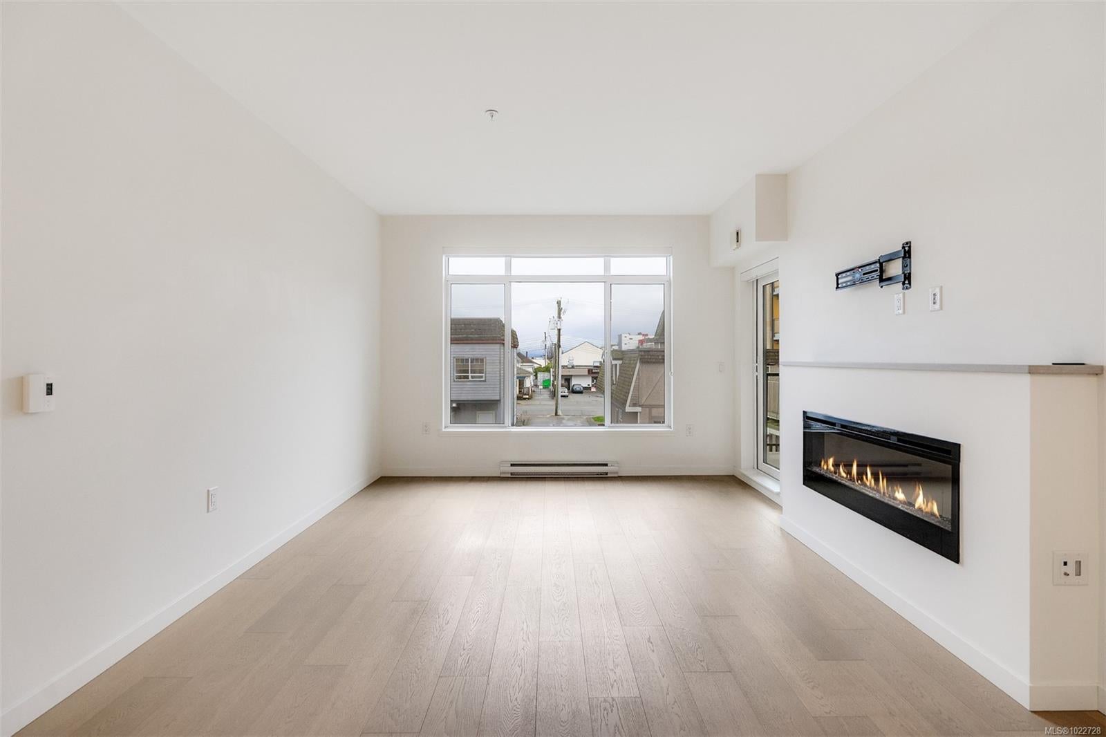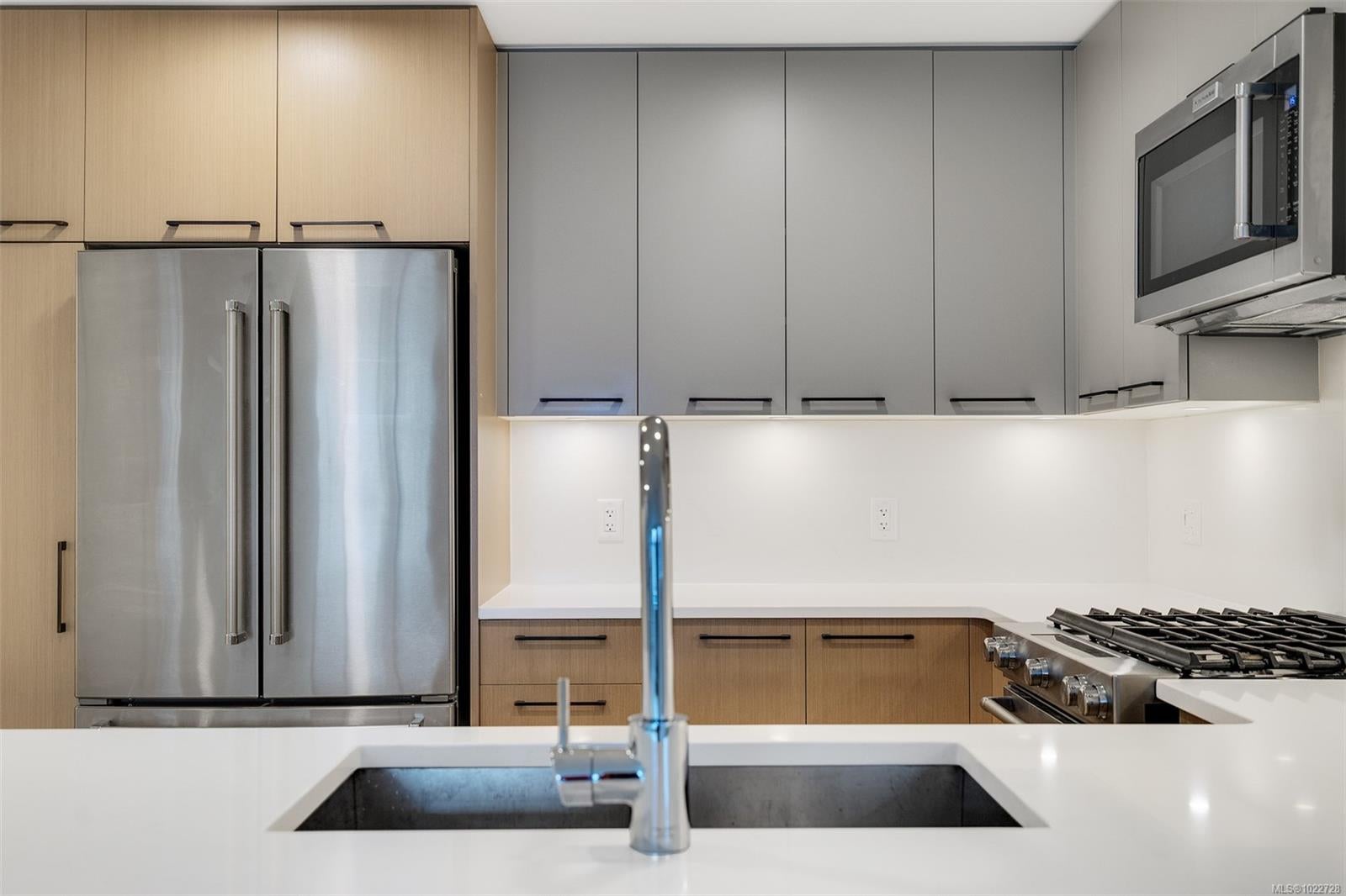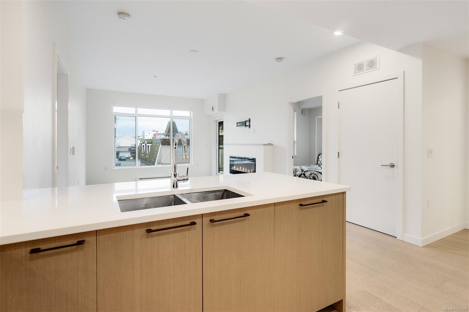 Two bedroom two full bathroom plus large den unit at The Quartet in downtown Sidney! Immaculate condition, durable construction built in 2019 and ready for immediate occupancy. Large 1060sqft floorplan plus 100sqft covered balcony with gas outlet for year round enjoyment to enjoy sunrises and your morning coffee. Unit features nine foot ceilings, open concept design with bedrooms on opposite sides, large 10x7 den/office a very flexible space, primary bedroom with double closets and ensuite with walk-in shower and heated floors, cozy living room with feature fireplace, hardwood floors, large windows, gourmet kitchen with Kitchen-Aid stainless steel appliance package and quartz countertops, insuite laundry and secure underground parking stall! Built for convenience and accessibility in mind. Centrally located just off the Avenue in Sidney for easy walking access to all levels of amenities and the ocean nearby. Dogs or cats allowed, 2 of any size! Ideal for retirees or downsizers!