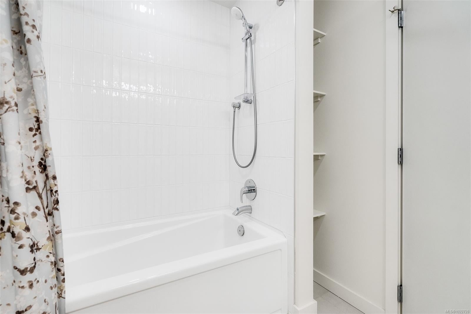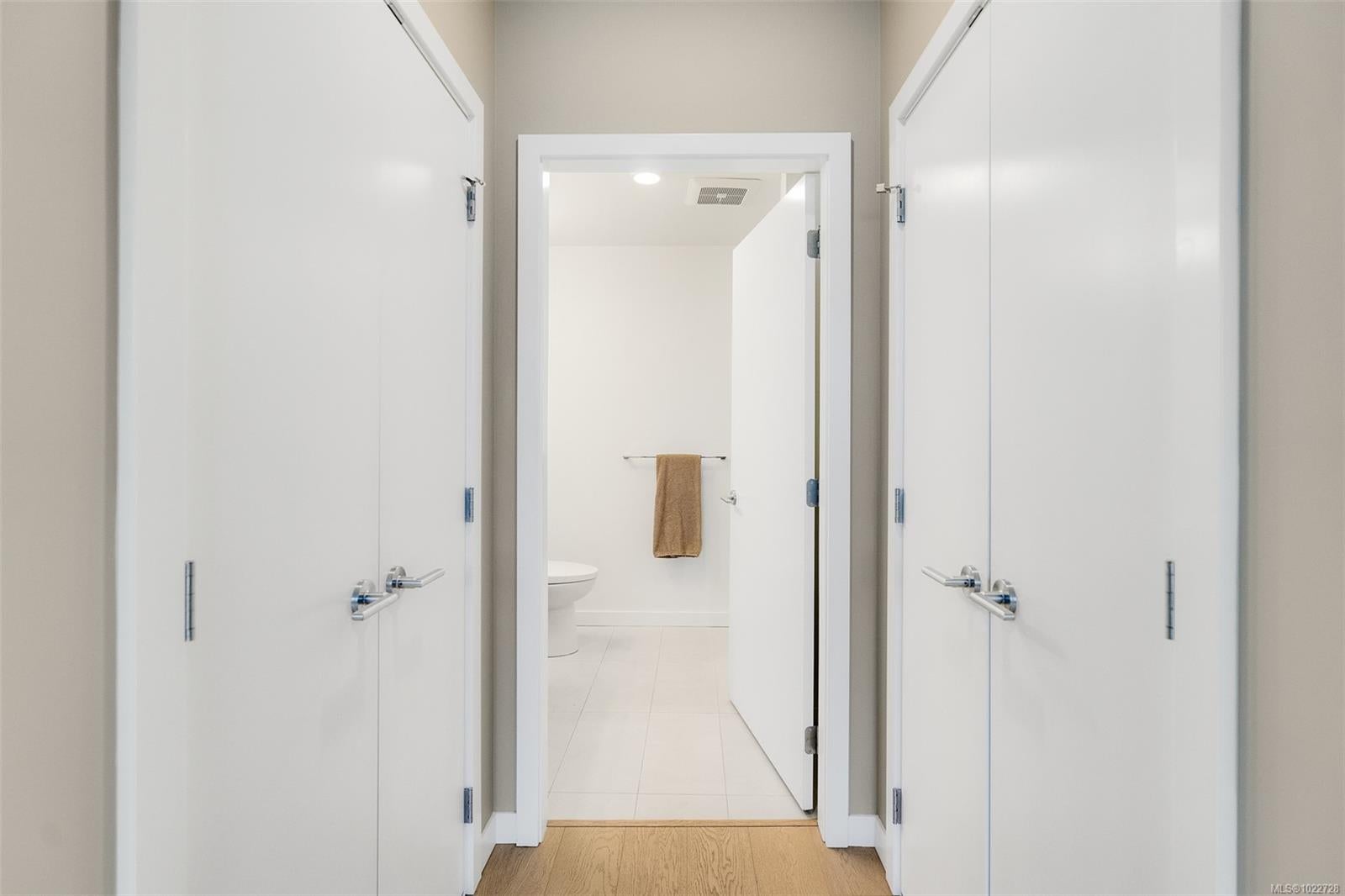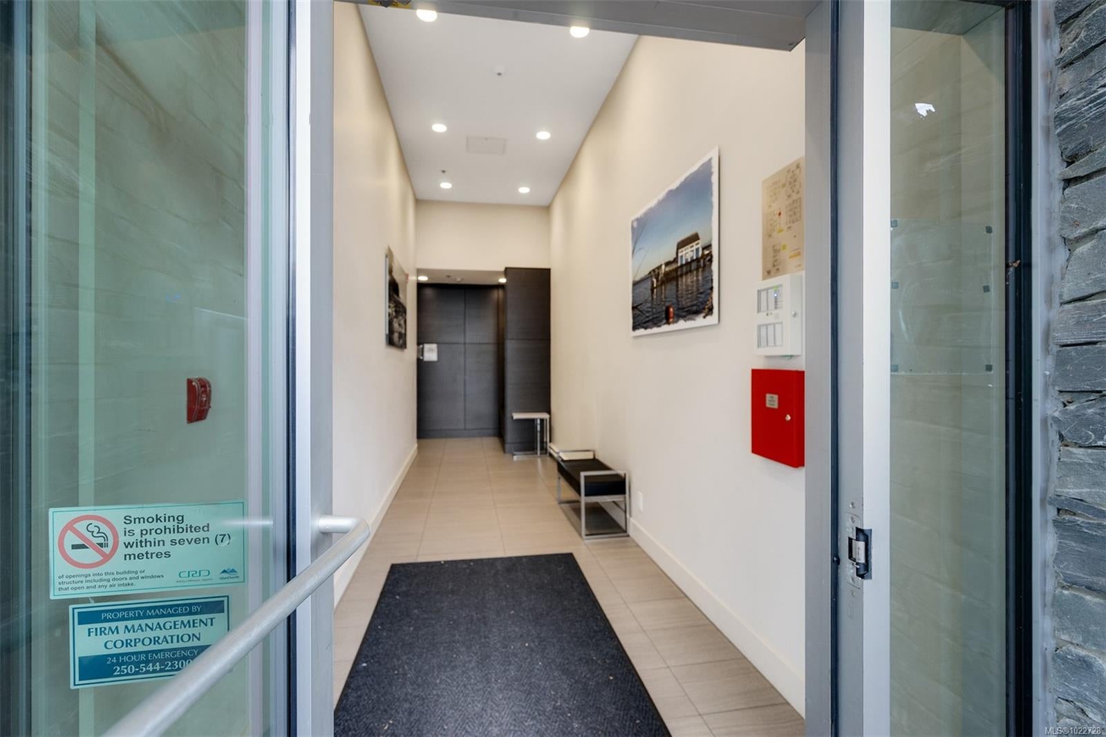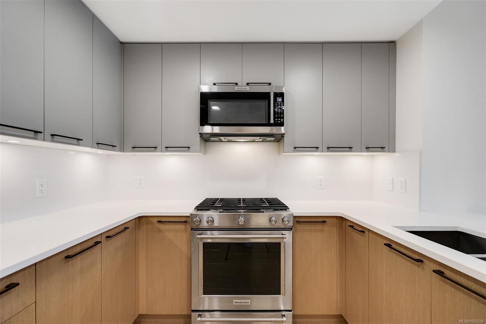 Two bedroom two full bathroom plus large den unit at The Quartet in downtown Sidney! Immaculate condition, durable construction built in 2019 and ready for immediate occupancy. Large 1060sqft floorplan plus 100sqft covered balcony with gas outlet for year round enjoyment to enjoy sunrises and your morning coffee. Unit features nine foot ceilings, open concept design with bedrooms on opposite sides, large 10x7 den/office a very flexible space, primary bedroom with double closets and ensuite with walk-in shower and heated floors, cozy living room with feature fireplace, hardwood floors, large windows, gourmet kitchen with Kitchen-Aid stainless steel appliance package and quartz countertops, insuite laundry and secure underground parking stall! Built for convenience and accessibility in mind. Centrally located just off the Avenue in Sidney for easy walking access to all levels of amenities and the ocean nearby. Dogs or cats allowed, 2 of any size! Ideal for retirees or downsizers!