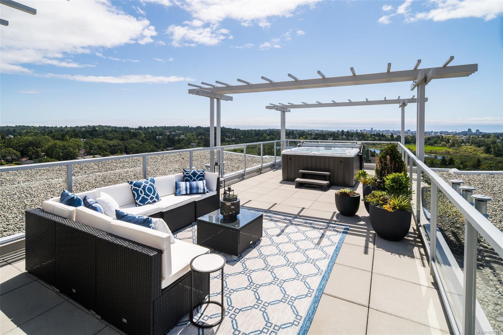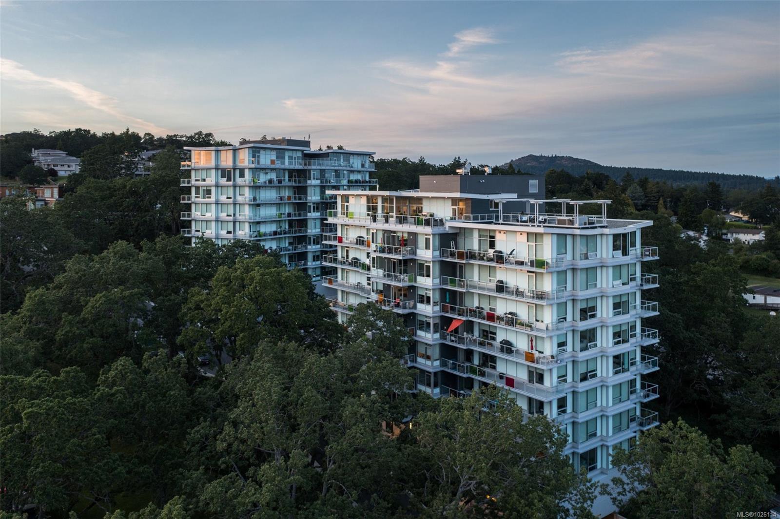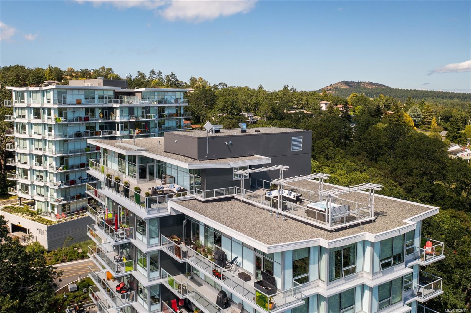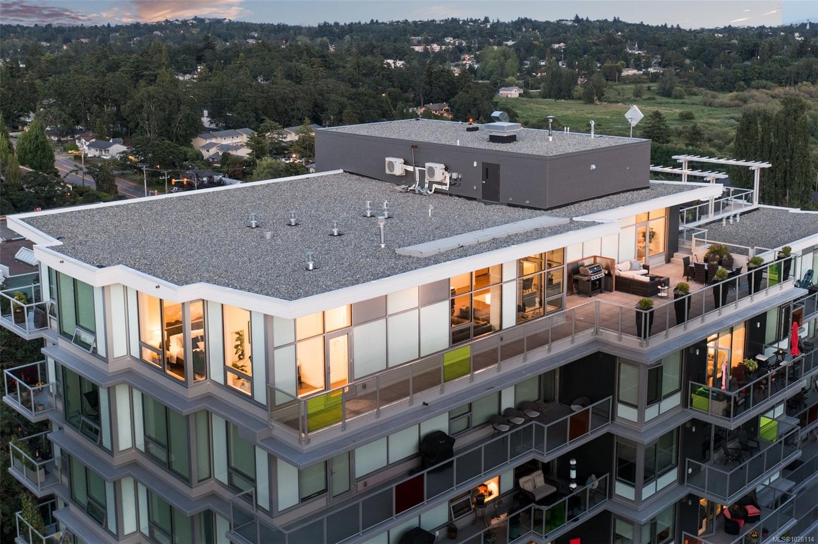 A Rare Penthouse Offering. The premier residence in this steel and concrete development and one of only two on its floor, this home is truly without equal. Nearly 1,600 sq.ft. of private terraces showcase 300° views from downtown Victoria to the Sooke Hills and Olympic Mountains. Inside, 1,568 sq.ft. of light-filled space features vaulted ceilings, expansive windows, built-in valences and heat pumps found only in penthouse homes. A split-bedroom layout ensures privacy, each with a deluxe ensuite, while most rooms enjoy private outlooks. The kitchen highlights include quartz surfaces, premium cabinetry and a huge island, flowing to an open living and dining room with a gas fireplace as a focal point. Outdoor living is unrivalled with an oversized balcony which includes a hot tub, three lighted arbours and a fire pit to create a retreat unmatched by any other unit. Two parking stalls closest to the elevator plus an oversized storage room add convenience. Pets are welcome too! Just 20 minutes from Sidney or downtown Victoria, with access to the Lochside and Galloping Goose trails.