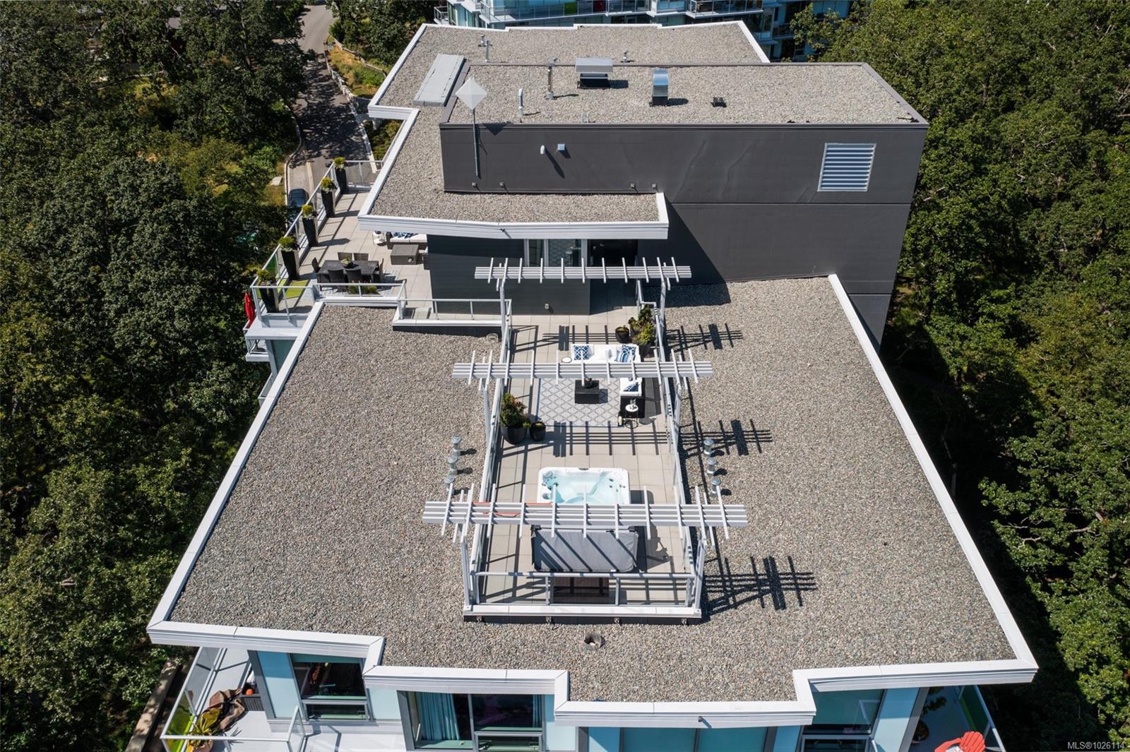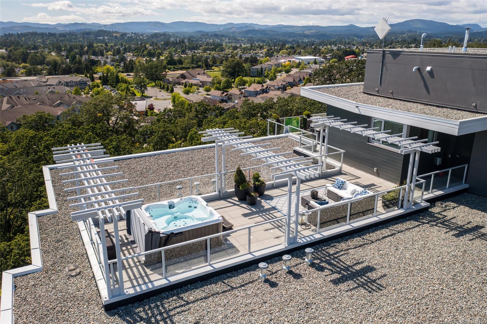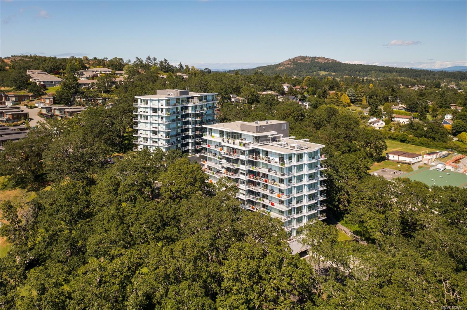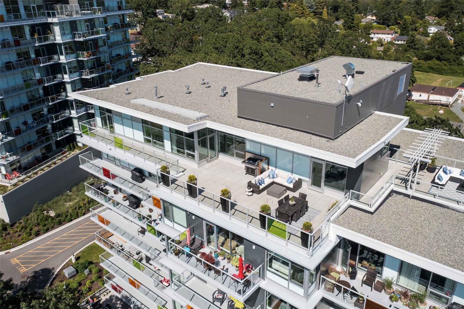 A Rare Penthouse Offering. The premier residence in this steel and concrete development and one of only two on its floor, this home is truly without equal. Nearly 1,600 sq.ft. of private terraces showcase 300° views from downtown Victoria to the Sooke Hills and Olympic Mountains. Inside, 1,568 sq.ft. of light-filled space features vaulted ceilings, expansive windows, built-in valences and heat pumps found only in penthouse homes. A split-bedroom layout ensures privacy, each with a deluxe ensuite, while most rooms enjoy private outlooks. The kitchen highlights include quartz surfaces, premium cabinetry and a huge island, flowing to an open living and dining room with a gas fireplace as a focal point. Outdoor living is unrivalled with an oversized balcony which includes a hot tub, three lighted arbours and a fire pit to create a retreat unmatched by any other unit. Two parking stalls closest to the elevator plus an oversized storage room add convenience. Pets are welcome too! Just 20 minutes from Sidney or downtown Victoria, with access to the Lochside and Galloping Goose trails.