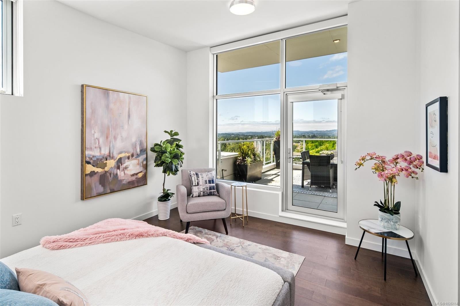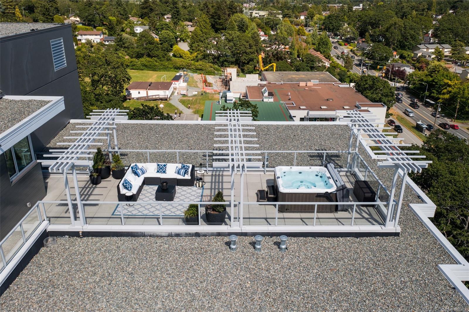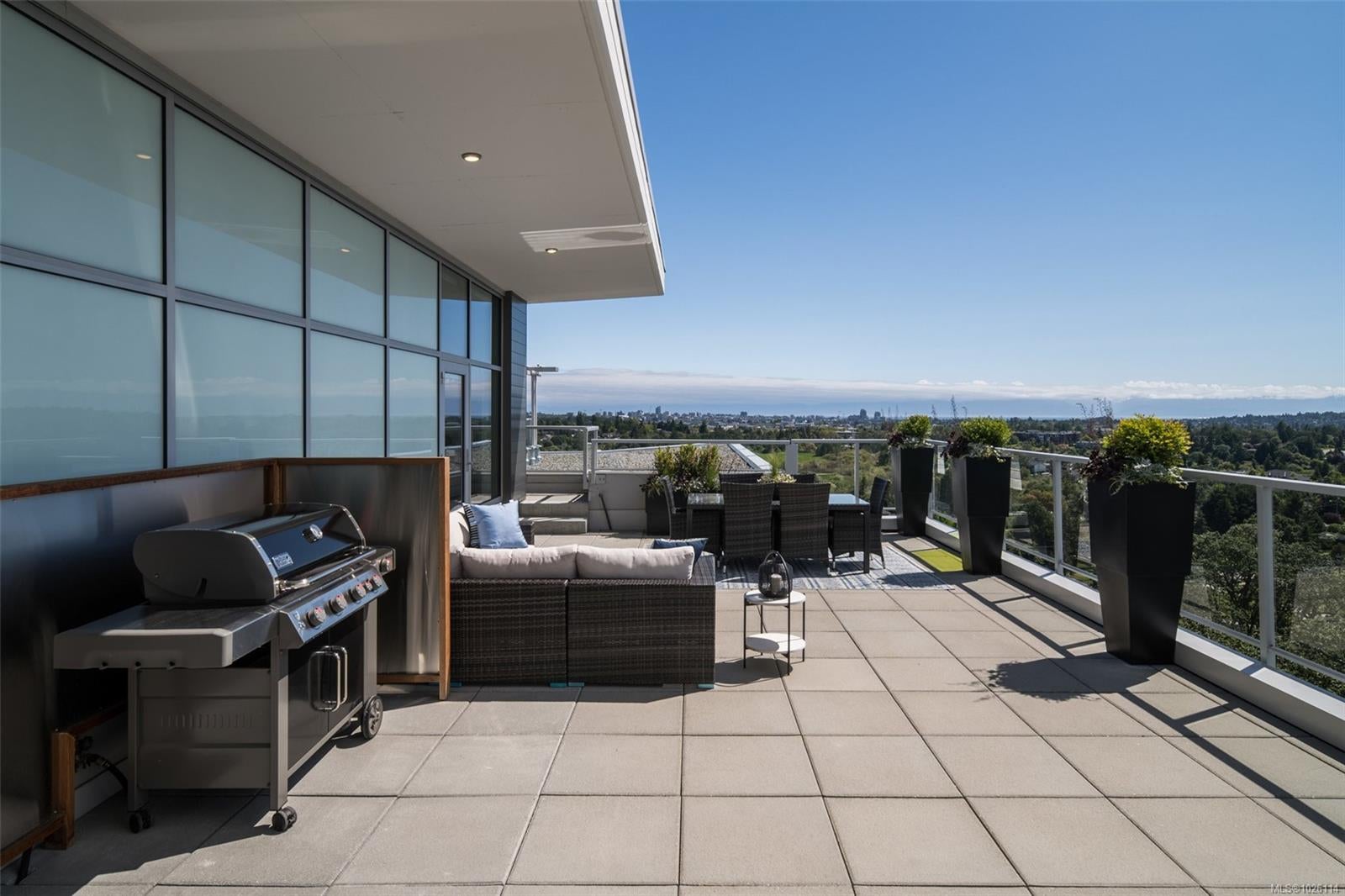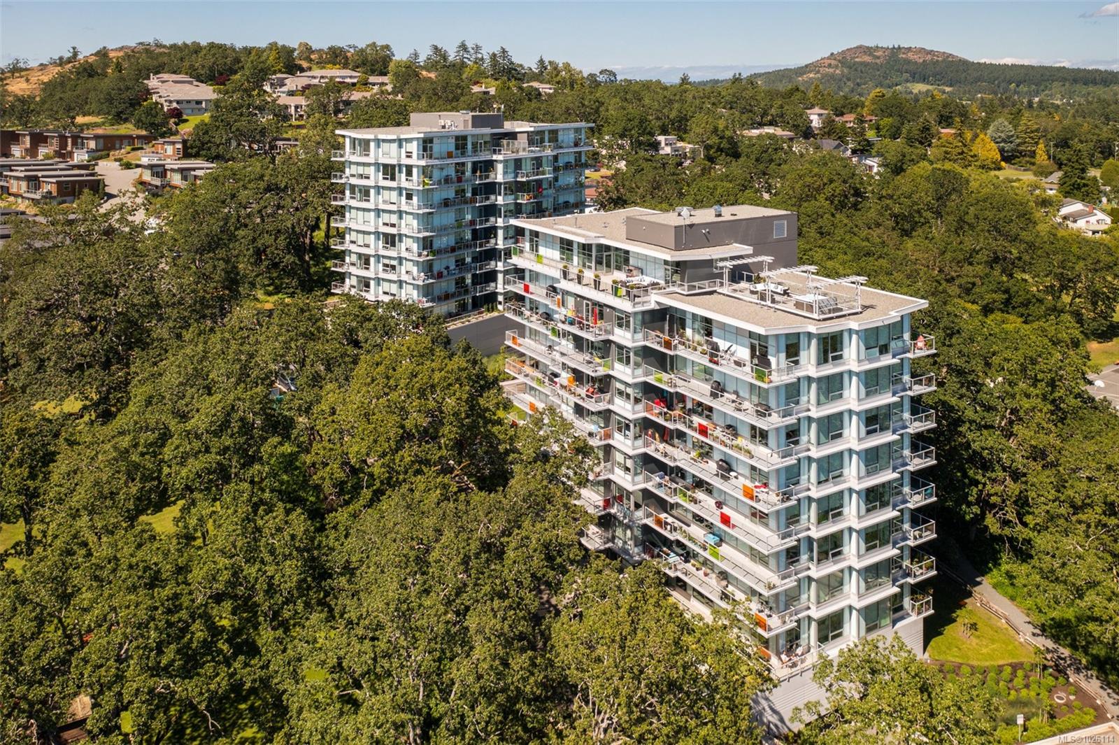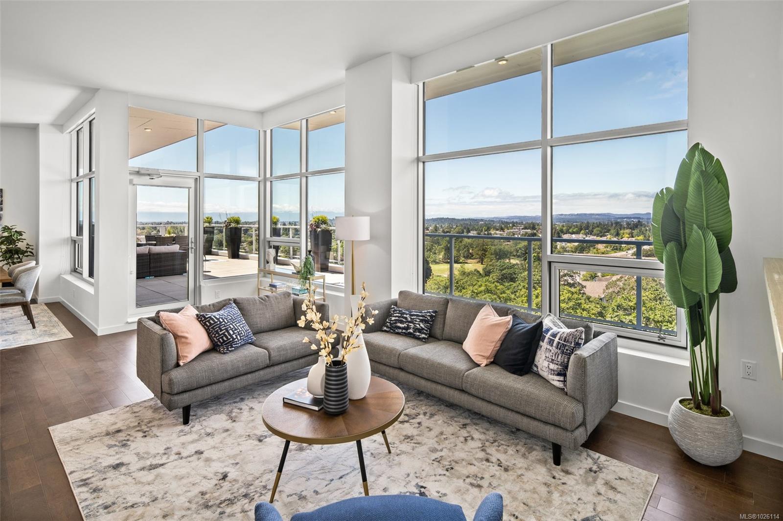 A Rare Penthouse Offering. The premier residence in this steel and concrete development and one of only two on its floor, this home is truly without equal. Nearly 1,600 sq.ft. of private terraces showcase 300° views from downtown Victoria to the Sooke Hills and Olympic Mountains. Inside, 1,568 sq.ft. of light-filled space features vaulted ceilings, expansive windows, built-in valences and heat pumps found only in penthouse homes. A split-bedroom layout ensures privacy, each with a deluxe ensuite, while most rooms enjoy private outlooks. The kitchen highlights include quartz surfaces, premium cabinetry and a huge island, flowing to an open living and dining room with a gas fireplace as a focal point. Outdoor living is unrivalled with an oversized balcony which includes a hot tub, three lighted arbours and a fire pit to create a retreat unmatched by any other unit. Two parking stalls closest to the elevator plus an oversized storage room add convenience. Pets are welcome too! Just 20 minutes from Sidney or downtown Victoria, with access to the Lochside and Galloping Goose trails.