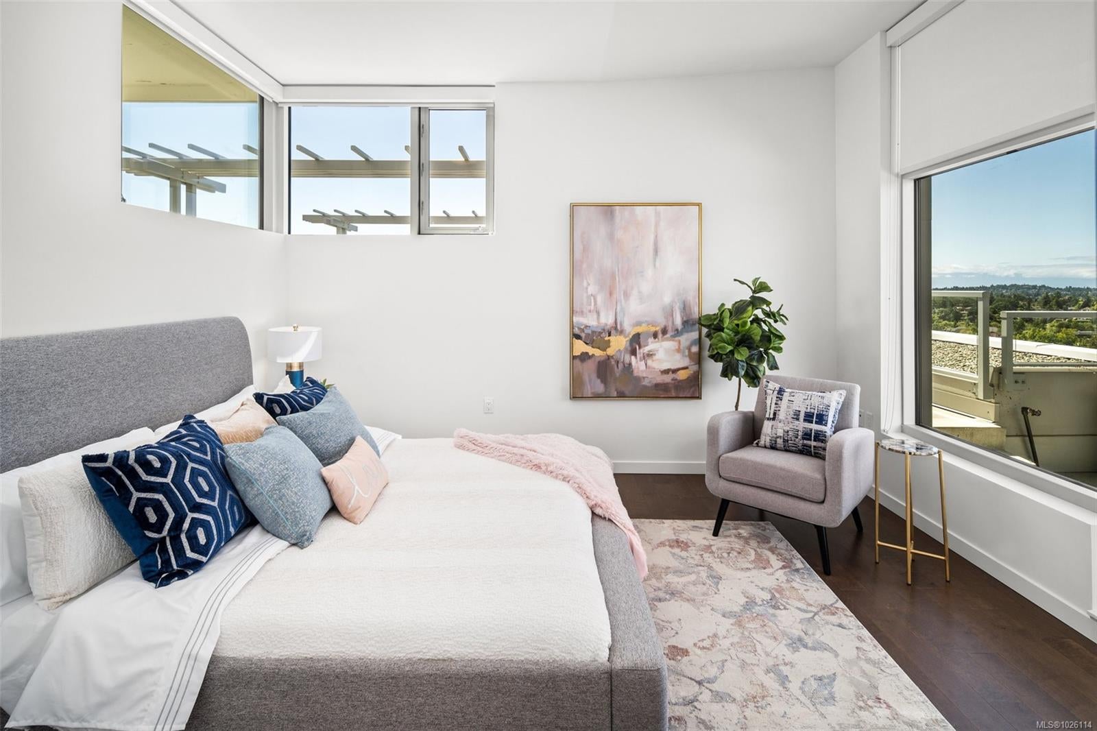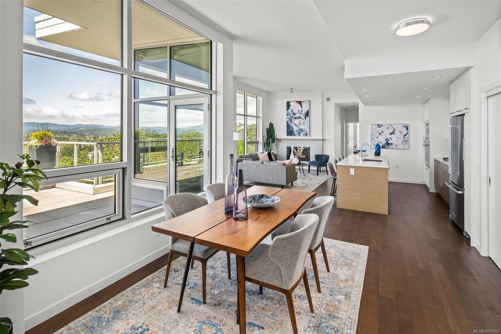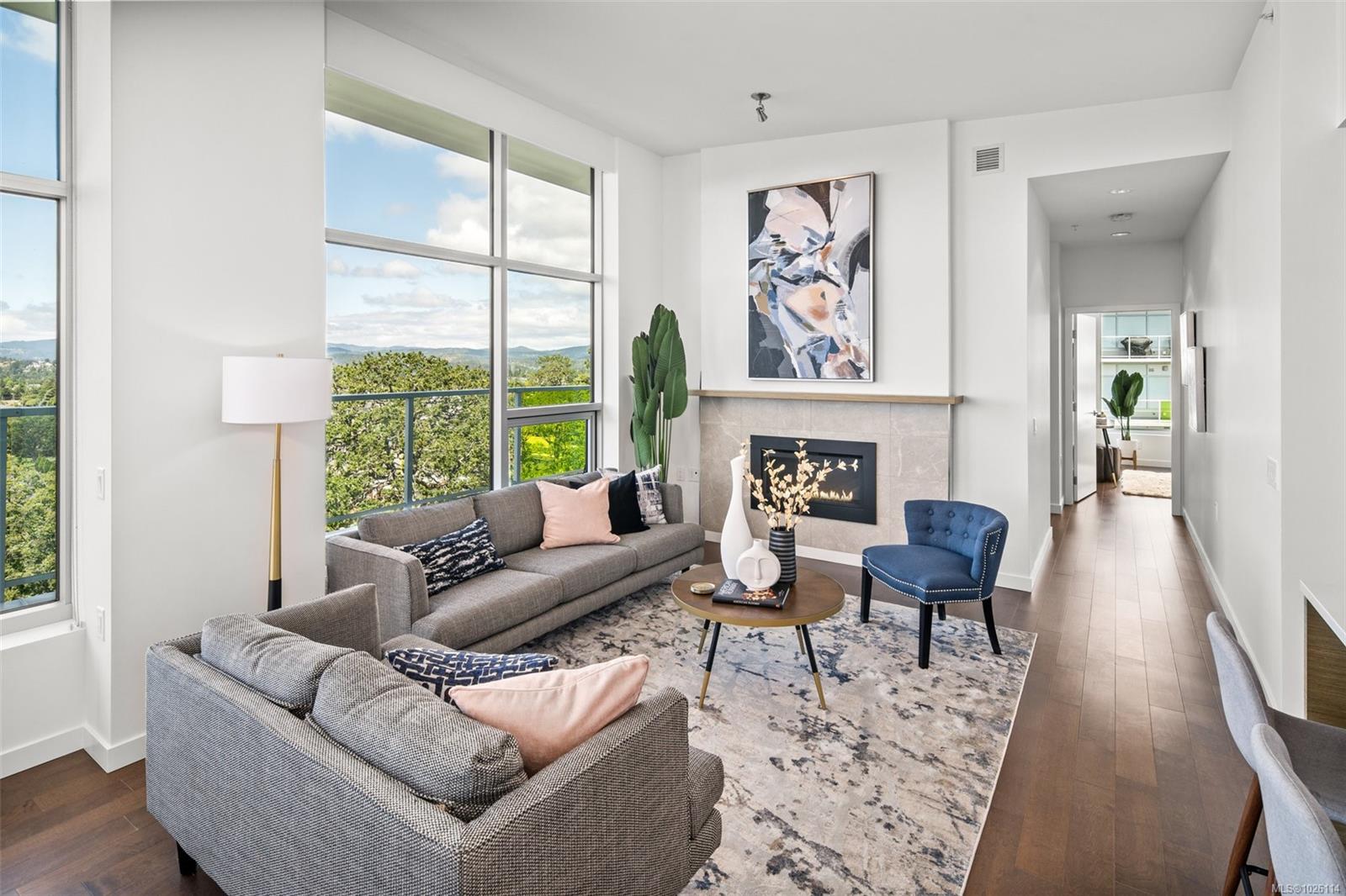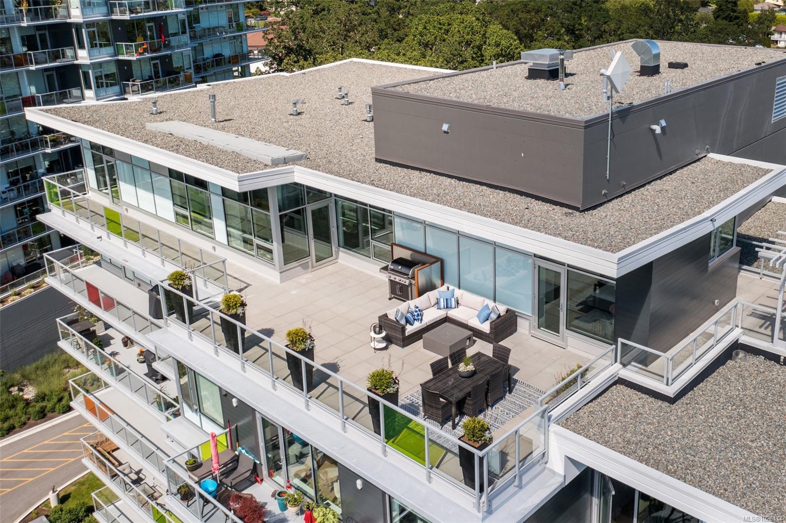 A Rare Penthouse Offering. The premier residence in this steel and concrete development and one of only two on its floor, this home is truly without equal. Nearly 1,600 sq.ft. of private terraces showcase 300° views from downtown Victoria to the Sooke Hills and Olympic Mountains. Inside, 1,568 sq.ft. of light-filled space features vaulted ceilings, expansive windows, built-in valences and heat pumps found only in penthouse homes. A split-bedroom layout ensures privacy, each with a deluxe ensuite, while most rooms enjoy private outlooks. The kitchen highlights include quartz surfaces, premium cabinetry and a huge island, flowing to an open living and dining room with a gas fireplace as a focal point. Outdoor living is unrivalled with an oversized balcony which includes a hot tub, three lighted arbours and a fire pit to create a retreat unmatched by any other unit. Two parking stalls closest to the elevator plus an oversized storage room add convenience. Pets are welcome too! Just 20 minutes from Sidney or downtown Victoria, with access to the Lochside and Galloping Goose trails.