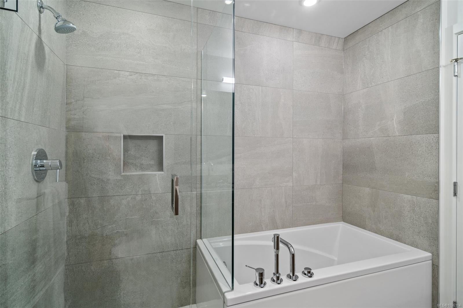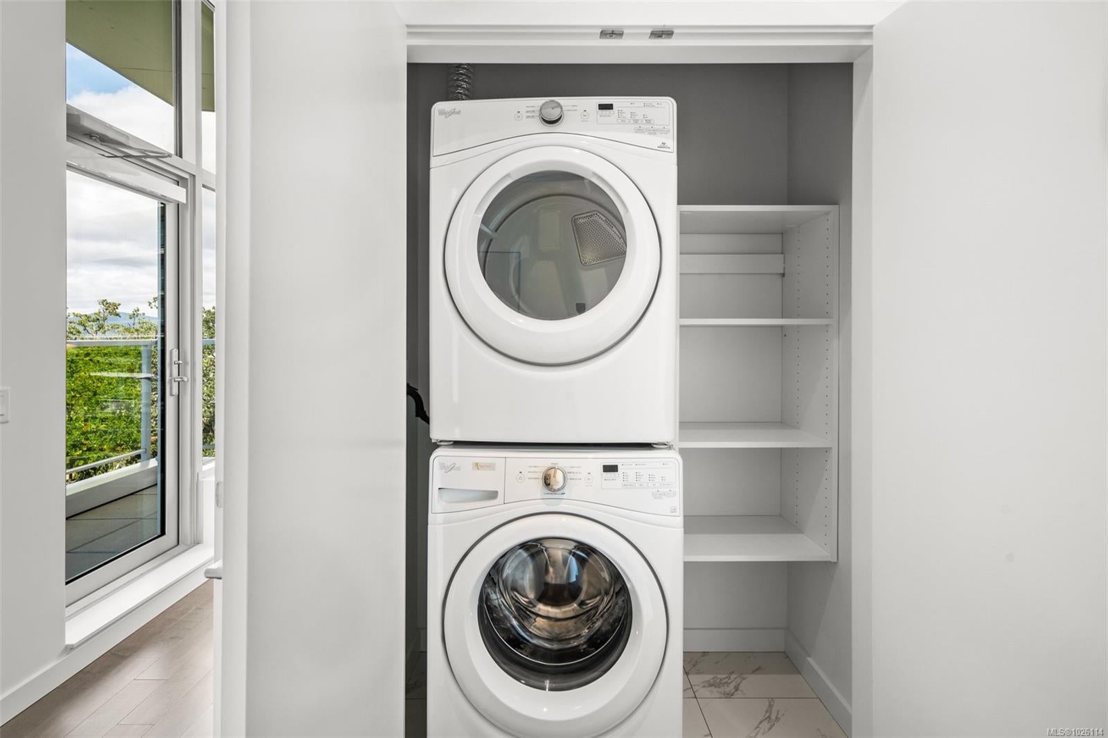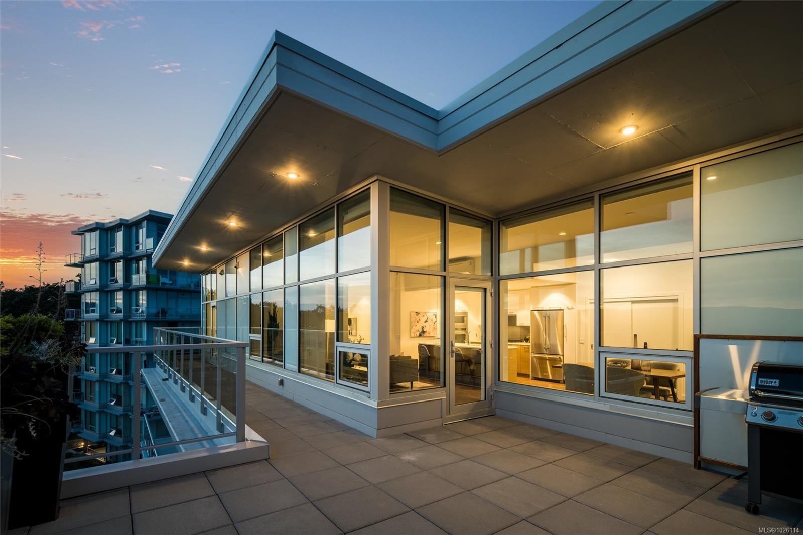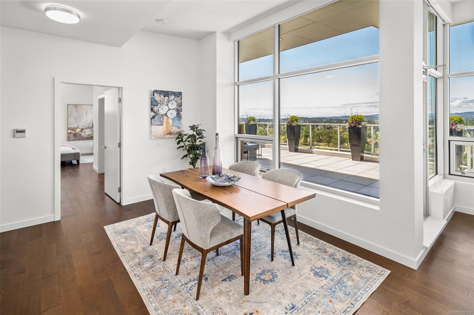 A Rare Penthouse Offering. The premier residence in this steel and concrete development and one of only two on its floor, this home is truly without equal. Nearly 1,600 sq.ft. of private terraces showcase 300° views from downtown Victoria to the Sooke Hills and Olympic Mountains. Inside, 1,568 sq.ft. of light-filled space features vaulted ceilings, expansive windows, built-in valences and heat pumps found only in penthouse homes. A split-bedroom layout ensures privacy, each with a deluxe ensuite, while most rooms enjoy private outlooks. The kitchen highlights include quartz surfaces, premium cabinetry and a huge island, flowing to an open living and dining room with a gas fireplace as a focal point. Outdoor living is unrivalled with an oversized balcony which includes a hot tub, three lighted arbours and a fire pit to create a retreat unmatched by any other unit. Two parking stalls closest to the elevator plus an oversized storage room add convenience. Pets are welcome too! Just 20 minutes from Sidney or downtown Victoria, with access to the Lochside and Galloping Goose trails.