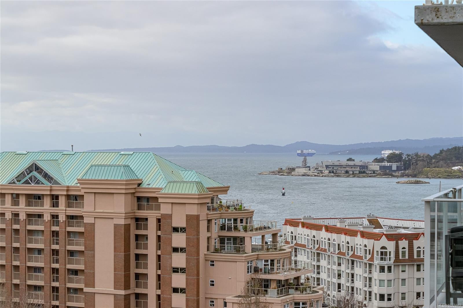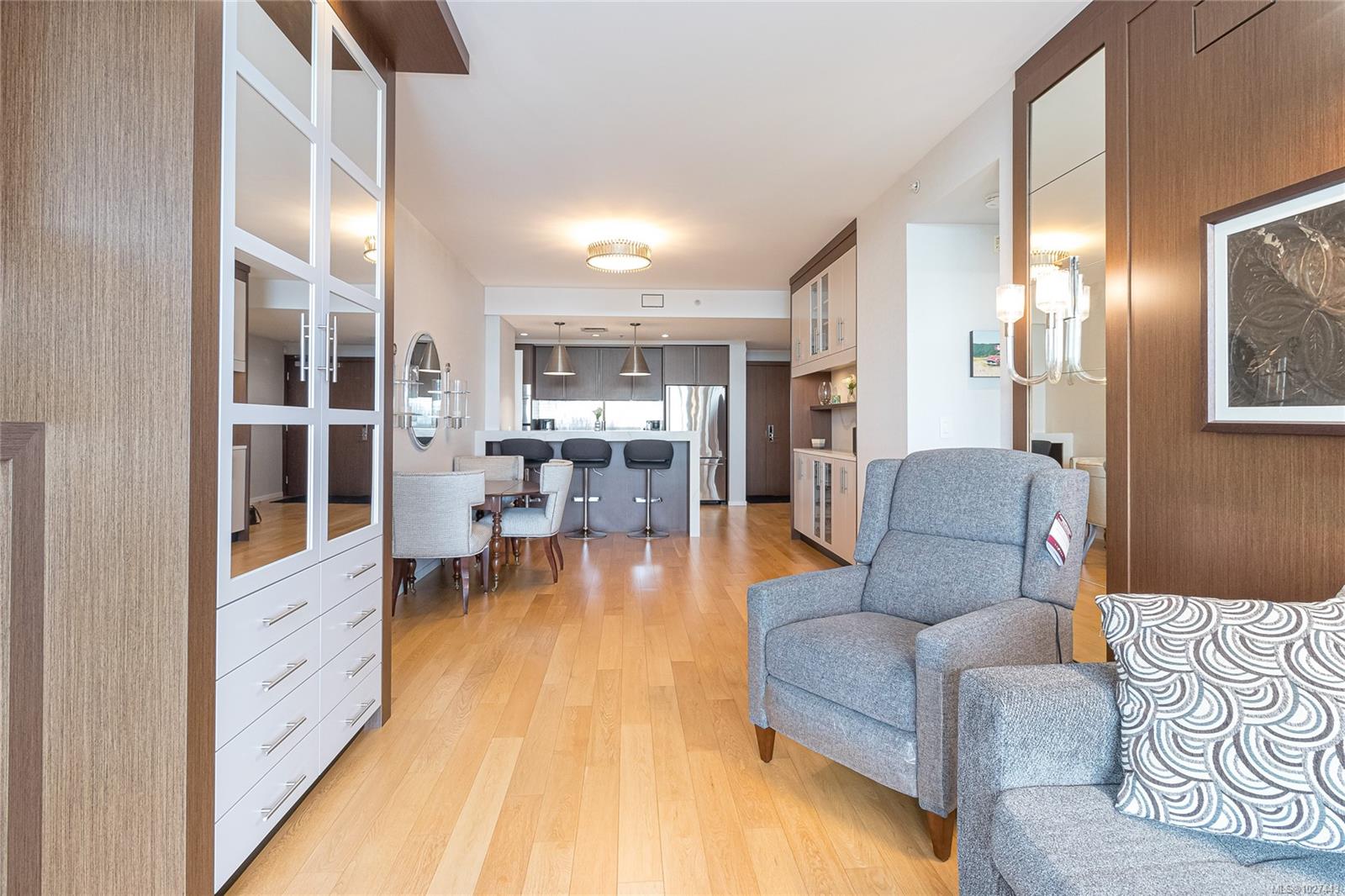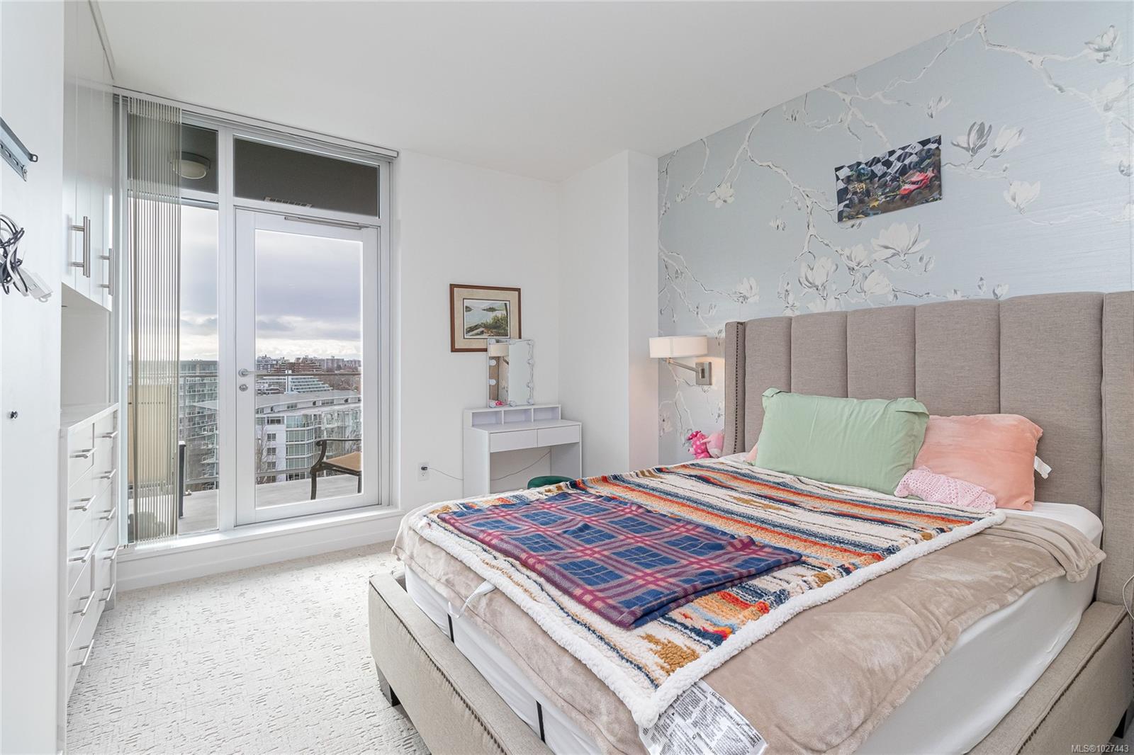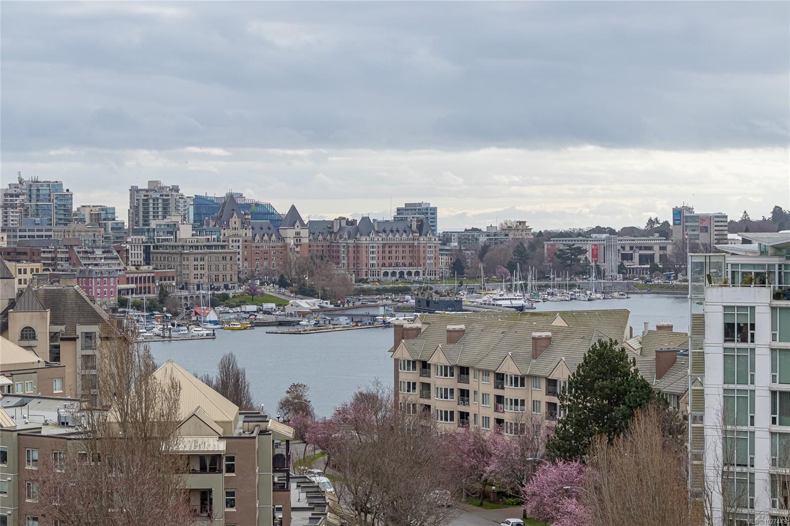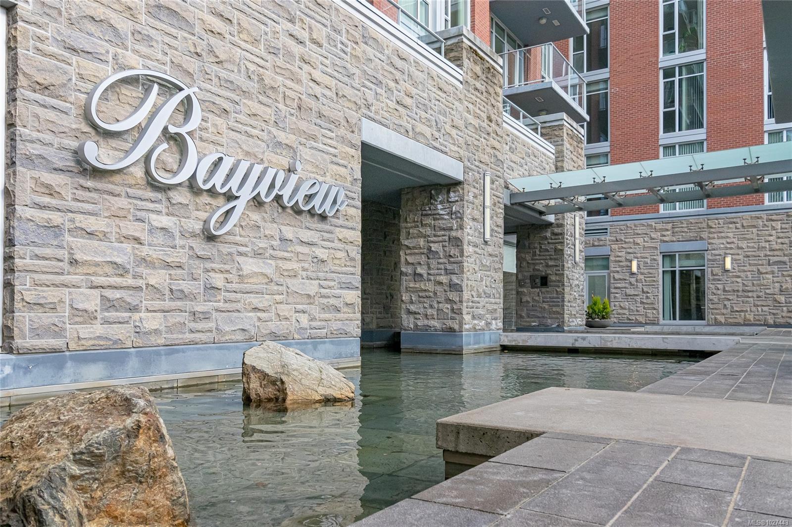 Outstanding views of the ocean, mountains towards the Olympics and Salish Sea, and the vibrant Inner Harbour can be viewed from all the large windows and huge deck. This updated 1328 sq ft two bed, two bath Condo is in the distinguished Bayview One. Waterfall marble countertops , Jenn Air stainless steel appliances, gas range, and plenty of cabinets make this a great working kitchen. Living room and dining combo are nice and bright with upgraded and custom built in cabinets and specialty woodworking details with a wonderful fireplace with built in reading bench - Primary bedroom with door to deck and nice spa like 5 piece bath and lots of storage is across from a second bedroom and 5 piece bath with jack and jill entrance - Nice 6'x7' pantry storage area and in house laundry complete the floorplan - Two parking spaces (one oversized) strata includes Concierge, Hot Tub, Sauna & Steam Rooms, Fitness Centre, Outdoor Terrace with BBQ & Fire Pit, Games Lounge, Car Wash, Dog Wash Station