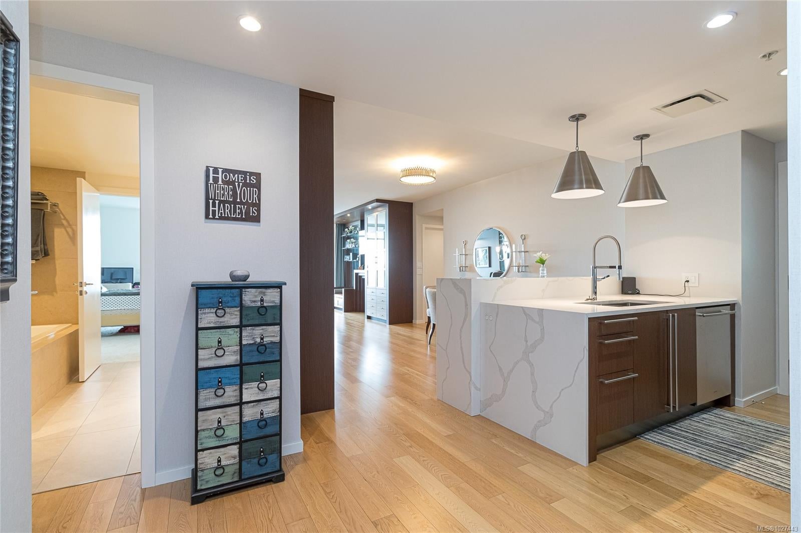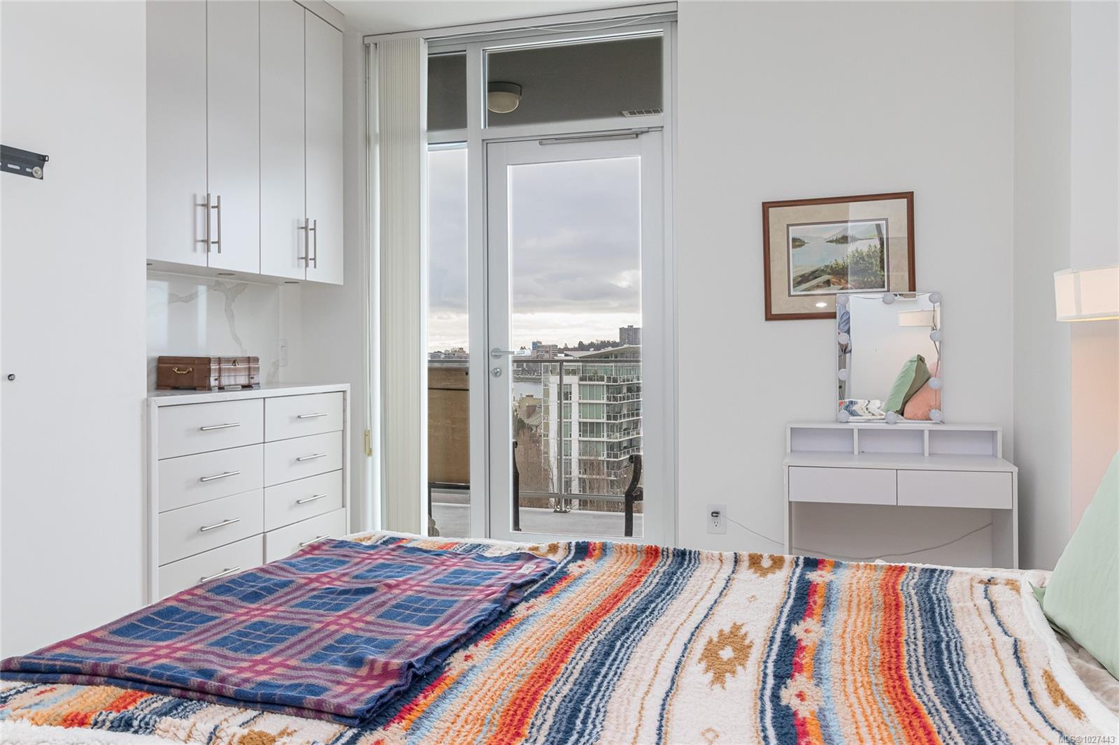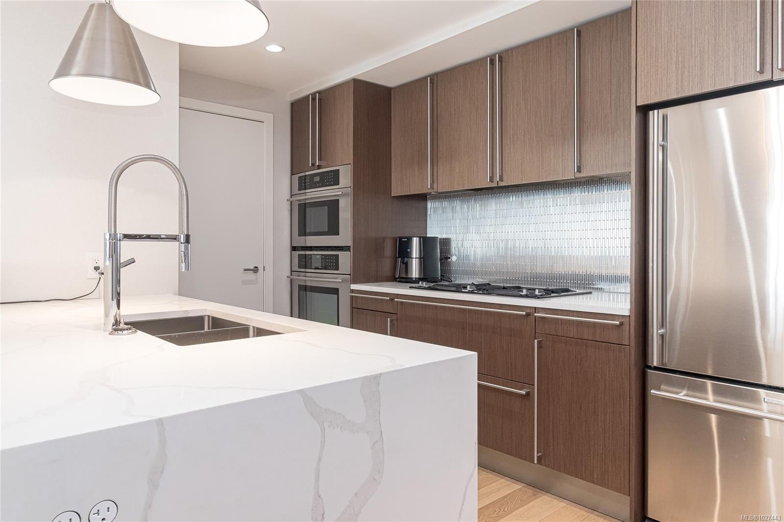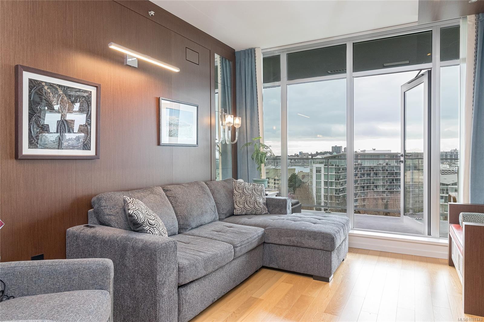Outstanding views of the ocean, mountains towards the Olympics and Salish Sea, and the vibrant Inner Harbour can be viewed from all the large windows and huge deck. This updated 1328 sq ft two bed, two bath Condo is in the distinguished Bayview One. Waterfall marble countertops , Jenn Air stainless steel appliances, gas range, and plenty of cabinets make this a great working kitchen. Living room and dining combo are nice and bright with upgraded and custom built in cabinets and specialty woodworking details with a wonderful fireplace with built in reading bench - Primary bedroom with door to deck and nice spa like 5 piece bath and lots of storage is across from a second bedroom and 5 piece bath with jack and jill entrance - Nice 6'x7' pantry storage area and in house laundry complete the floorplan - Two parking spaces (one oversized) strata includes Concierge, Hot Tub, Sauna & Steam Rooms, Fitness Centre, Outdoor Terrace with BBQ & Fire Pit, Games Lounge, Car Wash, Dog Wash Station