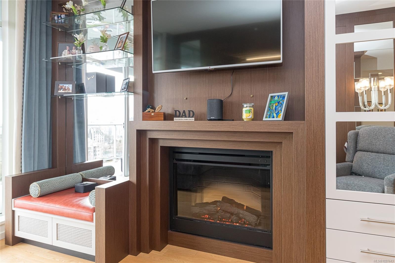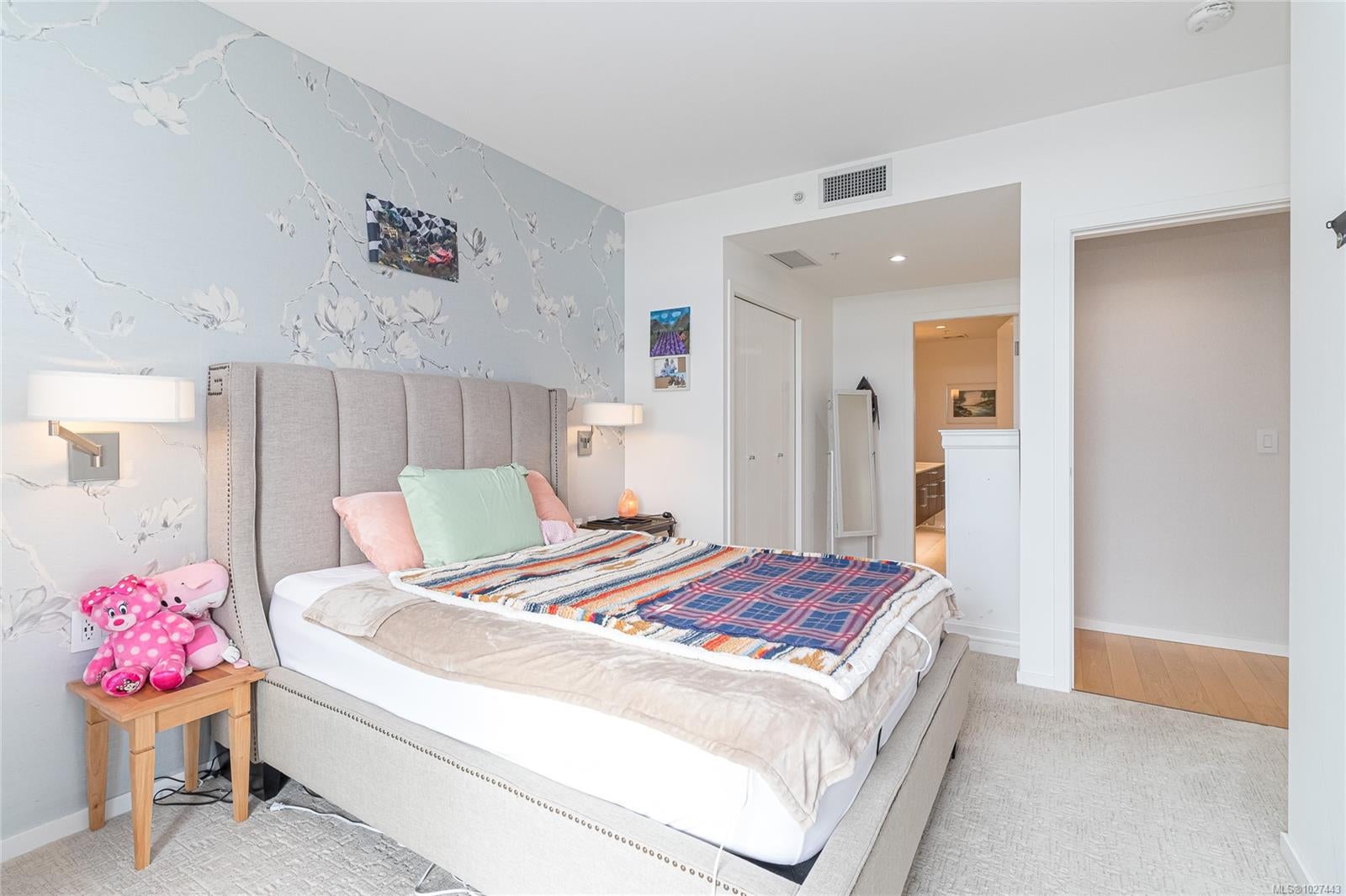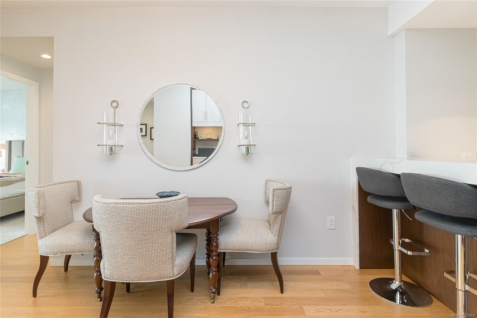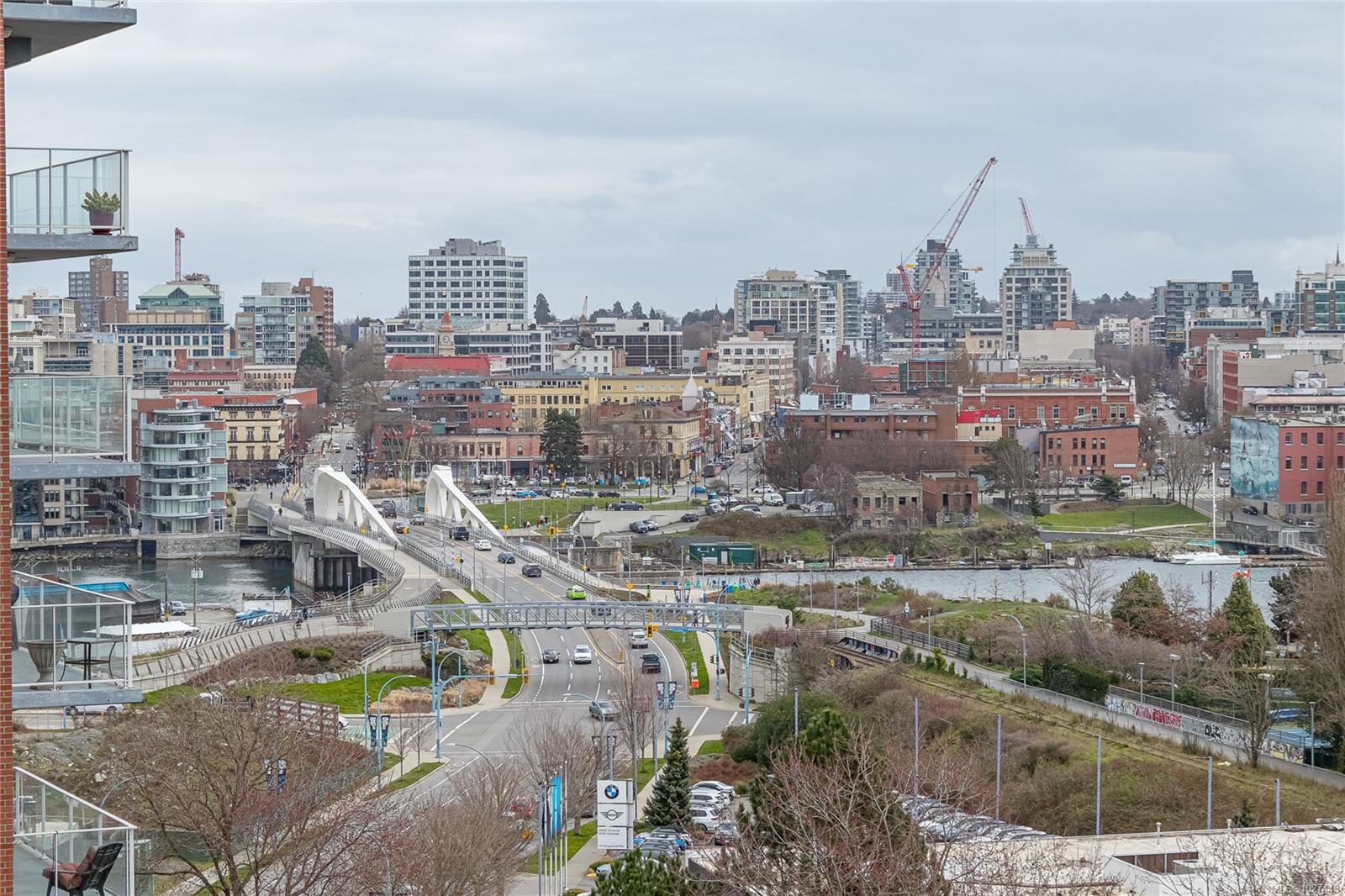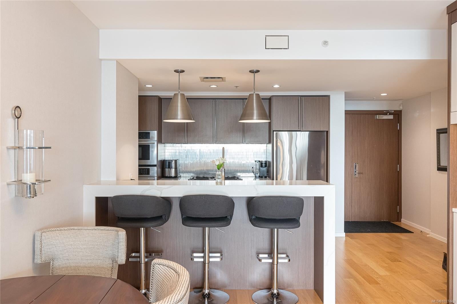 Outstanding views of the ocean, mountains towards the Olympics and Salish Sea, and the vibrant Inner Harbour can be viewed from all the large windows and huge deck. This updated 1328 sq ft two bed, two bath Condo is in the distinguished Bayview One. Waterfall marble countertops , Jenn Air stainless steel appliances, gas range, and plenty of cabinets make this a great working kitchen. Living room and dining combo are nice and bright with upgraded and custom built in cabinets and specialty woodworking details with a wonderful fireplace with built in reading bench - Primary bedroom with door to deck and nice spa like 5 piece bath and lots of storage is across from a second bedroom and 5 piece bath with jack and jill entrance - Nice 6'x7' pantry storage area and in house laundry complete the floorplan - Two parking spaces (one oversized) strata includes Concierge, Hot Tub, Sauna & Steam Rooms, Fitness Centre, Outdoor Terrace with BBQ & Fire Pit, Games Lounge, Car Wash, Dog Wash Station