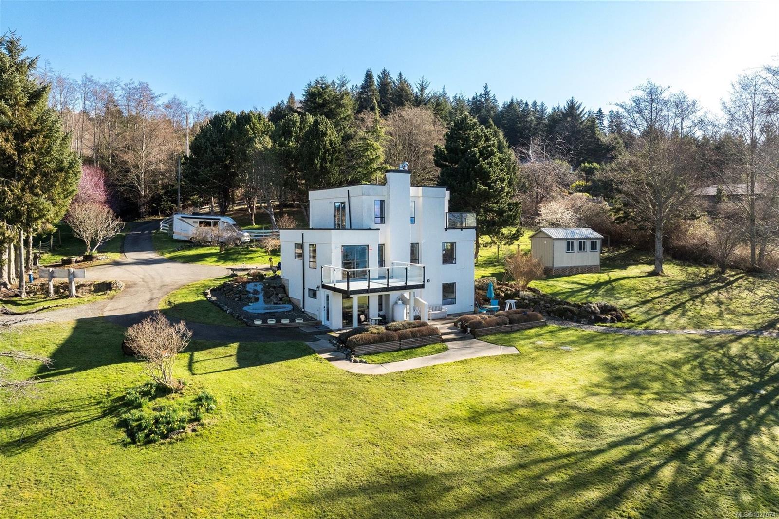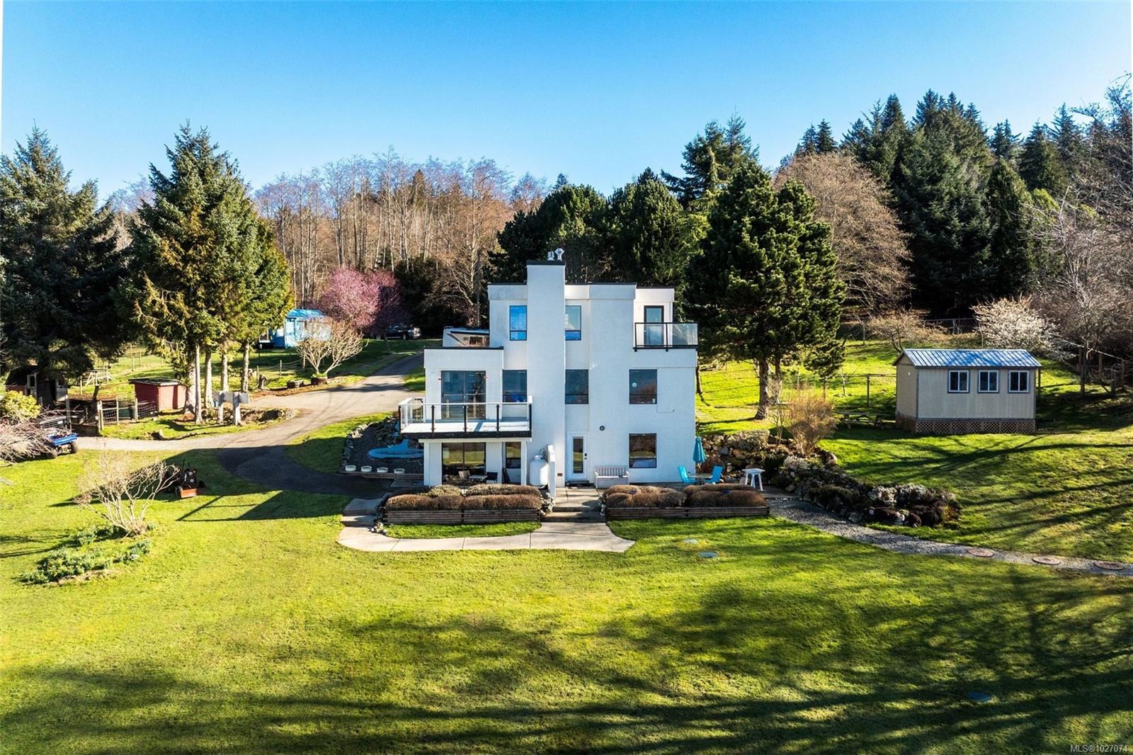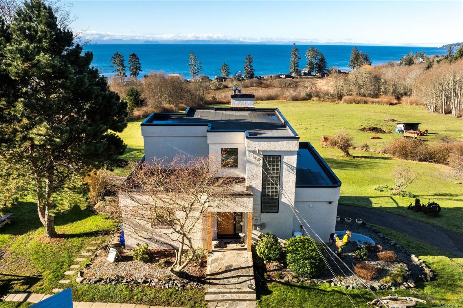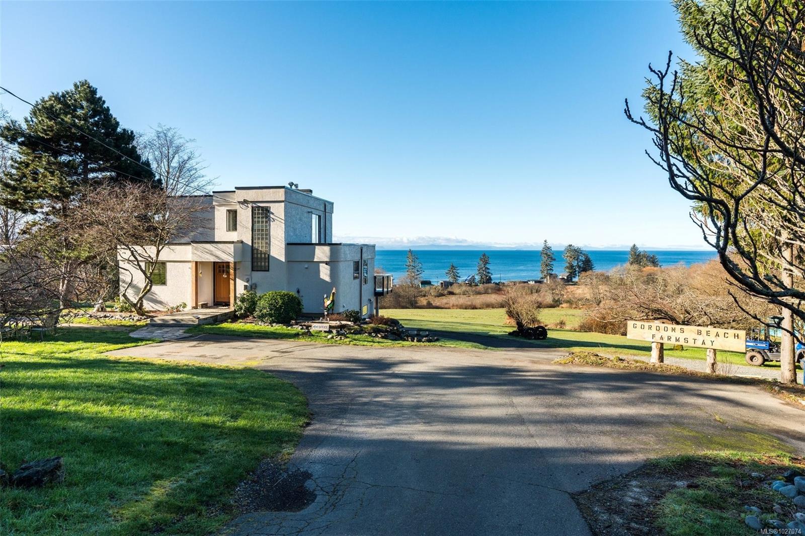 Wide open spaces, ocean views, brilliant sunsets and spectacular starlit nights - 4537 Otter Point has it all. A unique, masterfully crafted property: 10 acres of gently-sloping southwest facing land affords views over Gordon's Beach, the Strait of Juan de Fuca, and the Olympic Mountains. A 1991-built custom art-deco revival home is the centrepiece: 2300 sq ft on three levels: two self-contained vacation units below, two bedrooms on the main, and a stunning master suite upstairs, with rooftop decks, walk in closet, and luxurious ensuite bath, including a door to a private rooftop outdoor shower. A charming century cottage and efficient tiny home offer additional accommodation or revenue potential. Previously operated as a successful B&B and hobby farm, there are also numerous outbuildings: barn, chicken coop, ocean-view fire pit, pump house, and more. Current farm-tax status for lower assessment and taxes. Note re rooms: lower, main, second = house; third = cottage; other=tiny house.