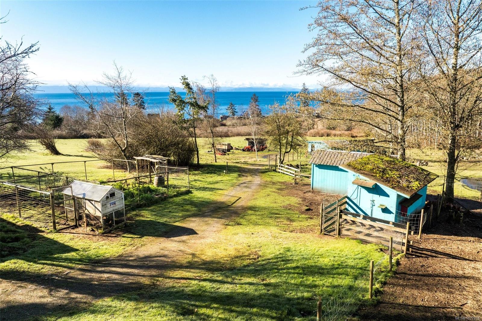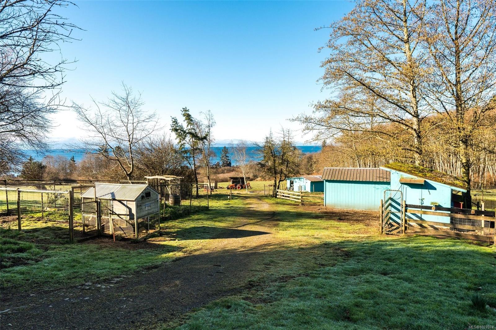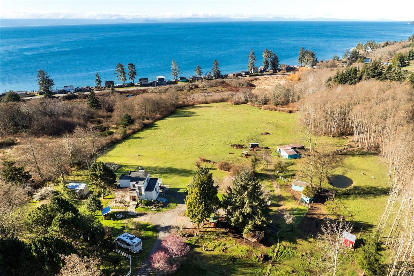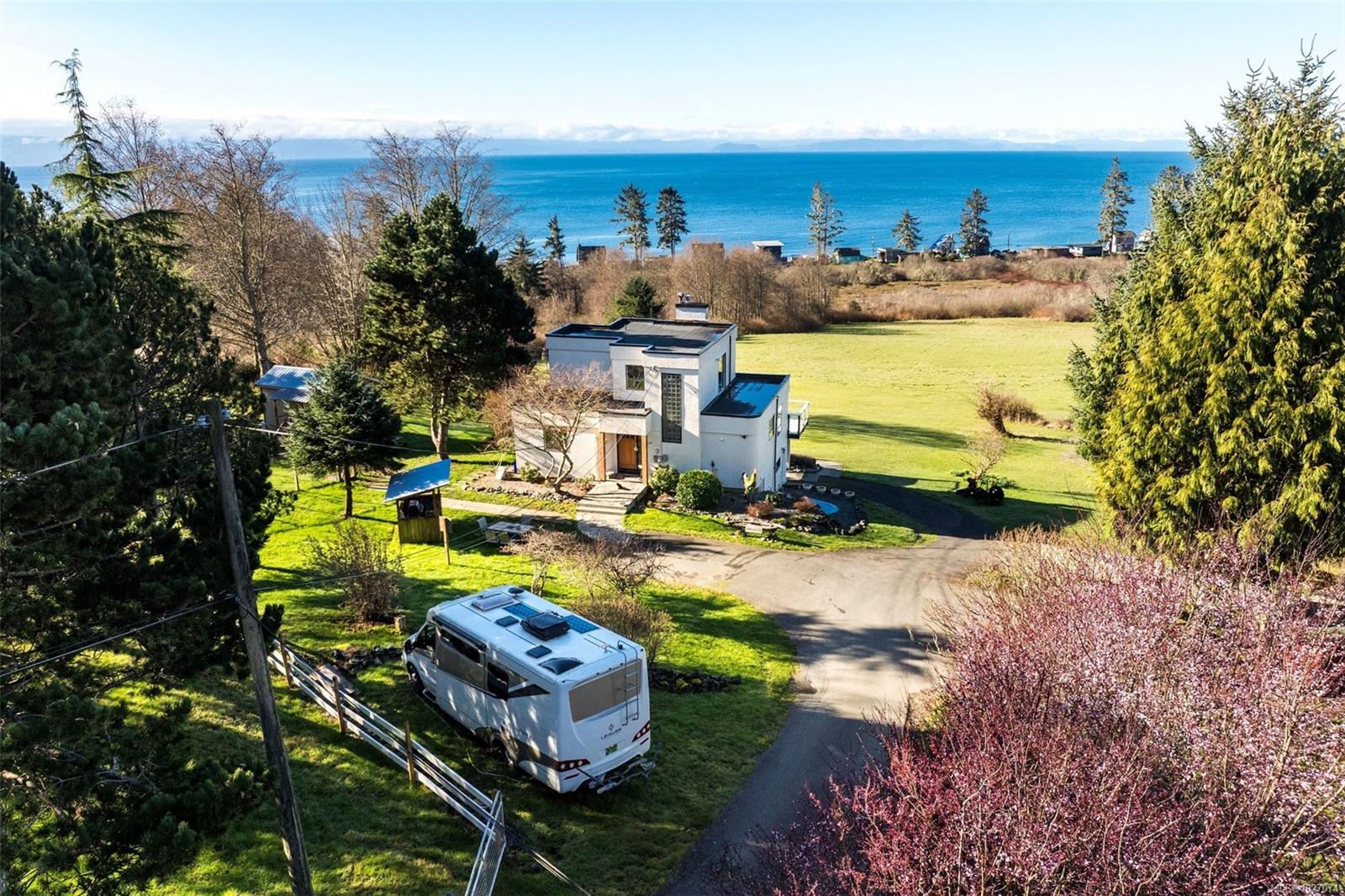 Wide open spaces, ocean views, brilliant sunsets and spectacular starlit nights - 4537 Otter Point has it all. A unique, masterfully crafted property: 10 acres of gently-sloping southwest facing land affords views over Gordon's Beach, the Strait of Juan de Fuca, and the Olympic Mountains. A 1991-built custom art-deco revival home is the centrepiece: 2300 sq ft on three levels: two self-contained vacation units below, two bedrooms on the main, and a stunning master suite upstairs, with rooftop decks, walk in closet, and luxurious ensuite bath, including a door to a private rooftop outdoor shower. A charming century cottage and efficient tiny home offer additional accommodation or revenue potential. Previously operated as a successful B&B and hobby farm, there are also numerous outbuildings: barn, chicken coop, ocean-view fire pit, pump house, and more. Current farm-tax status for lower assessment and taxes. Note re rooms: lower, main, second = house; third = cottage; other=tiny house.