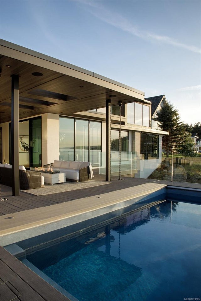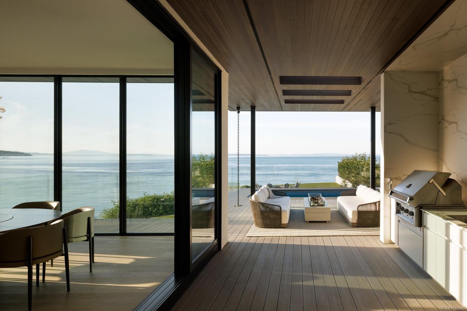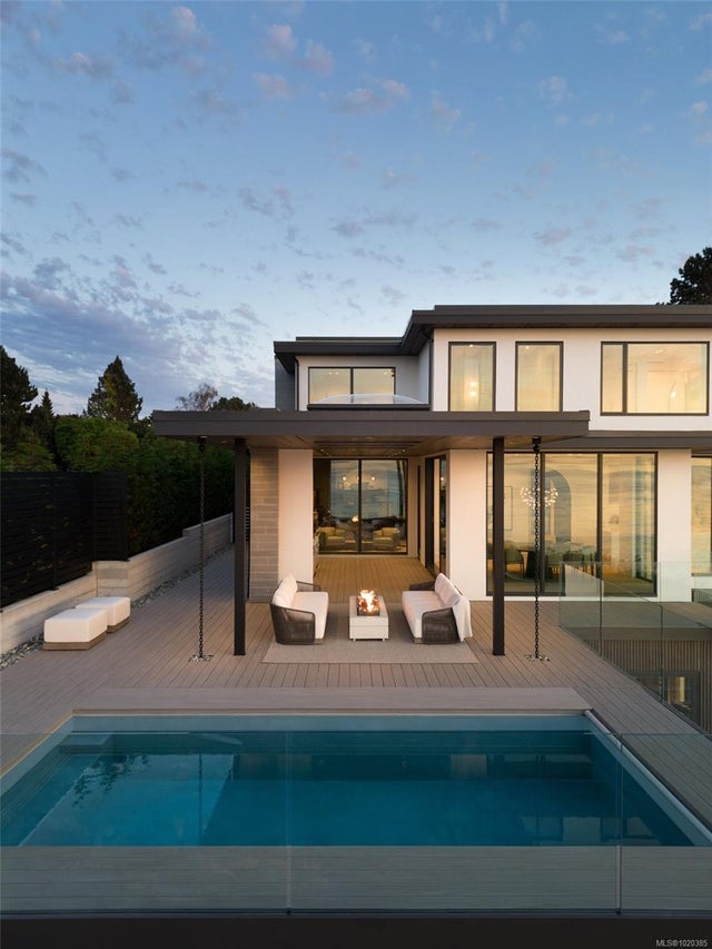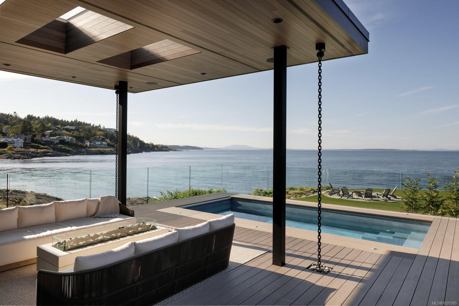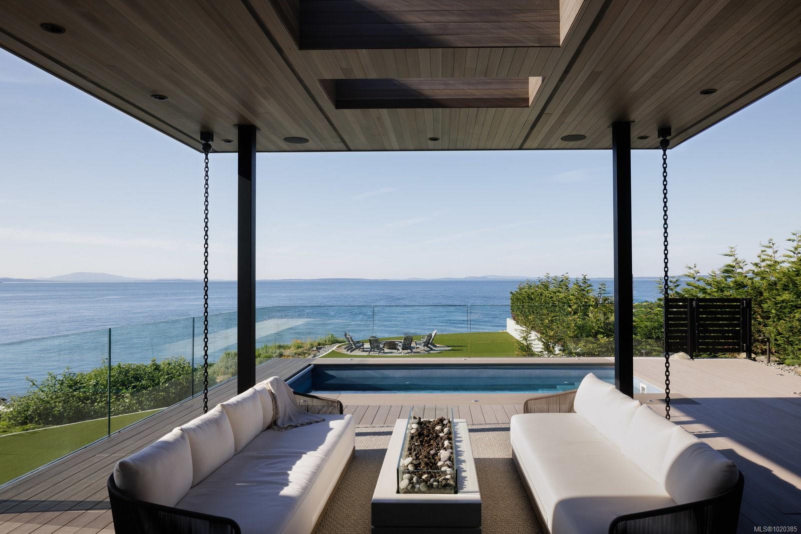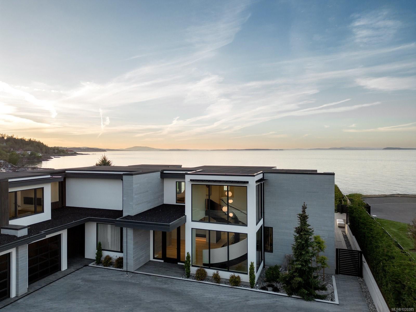 Experience Unparalleled Luxury at Vista del Mare. Perfectly positioned on over half an acre of prime waterfront in the prestigious Ten Mile Point, this architectural masterpiece by Robert Blaney, brought to life by Terry Johal Developments, promises to leave you breathless. Winner of 4 CARE Awards, including Best Single Family Detached Home, Best Innovative Feature, Best Primary Suite and Best Custom Millwork. Step into grandeur with 10-foot ceilings and a show-stopping steel and white oak floating spiral staircase that sets the tone for the rest of this captivating home. The expansive floor-to-ceiling windows on all three levels not only flood the interior with natural light but also offer uninterrupted views of Haro Strait and San Juan Island, making every room a visual delight. The neutral colour palette, accented by targeted designer lighting, creates an ambiance that is both clean and invigorating. The main floor's open-plan design maximizes these ocean views, seamlessly integrating the living, dining, and kitchen areas for effortless entertaining and everyday living. The sky-lit covered patio, adjacent to your complete outdoor kitchen with a deluxe Hestan grill and Fontana Forni pizza oven - imported from Italy- allows for al fresco dining with the backdrop of stunning seascapes, with the occasional killer whale and aurora borealis sighting. Enjoy a dip in the heated pool, followed by a rinse in the outdoor shower. Car enthusiasts will appreciate the attached three-car garage, equipped with two vehicle elevators. Above the garage, a separate, well-insulated guest suite offers a private living area, bedroom, and full bath.