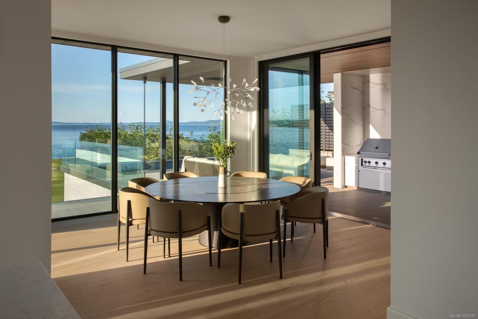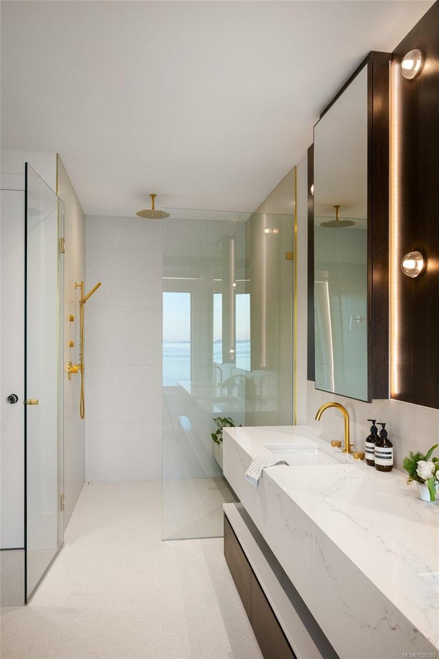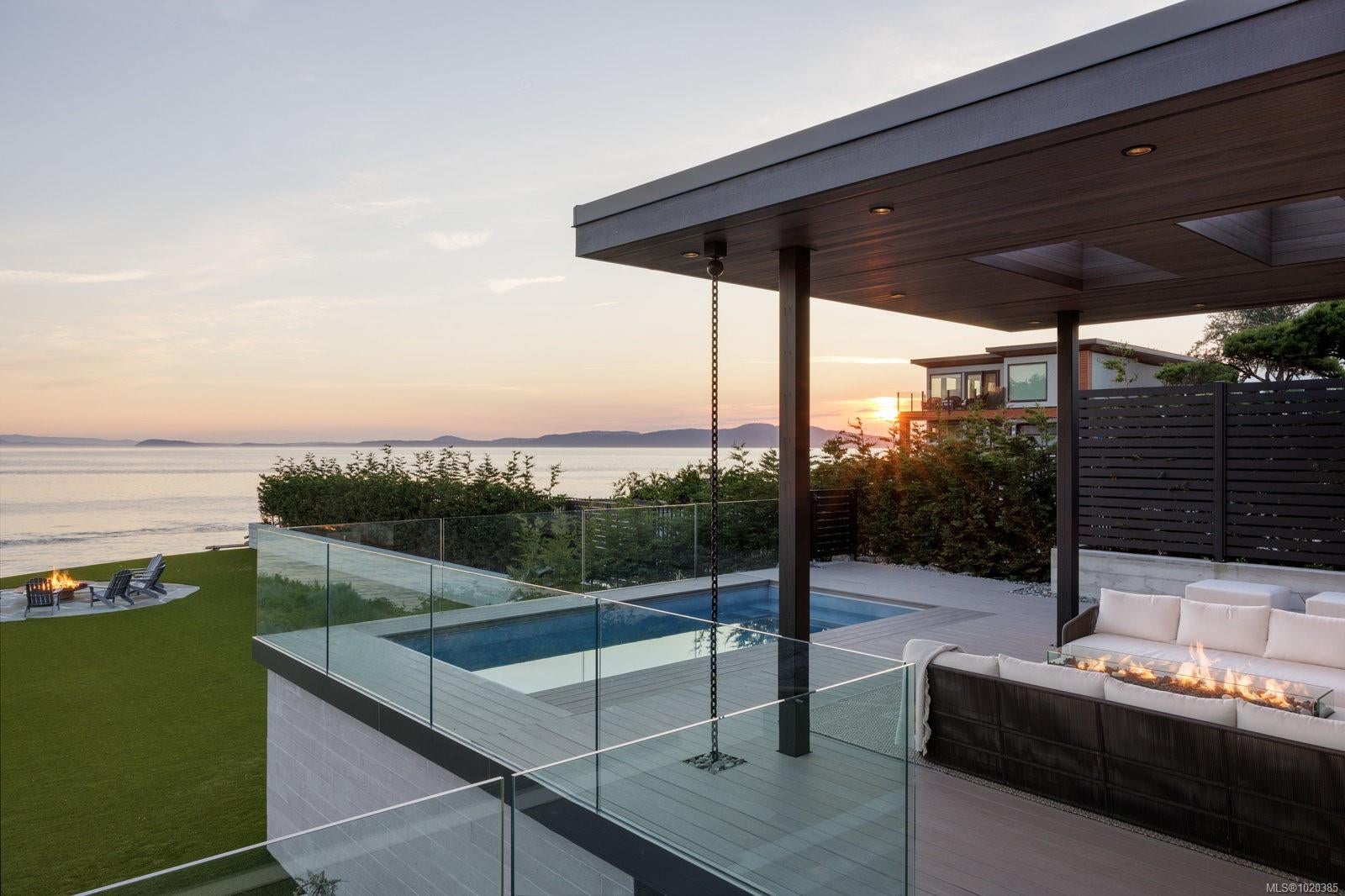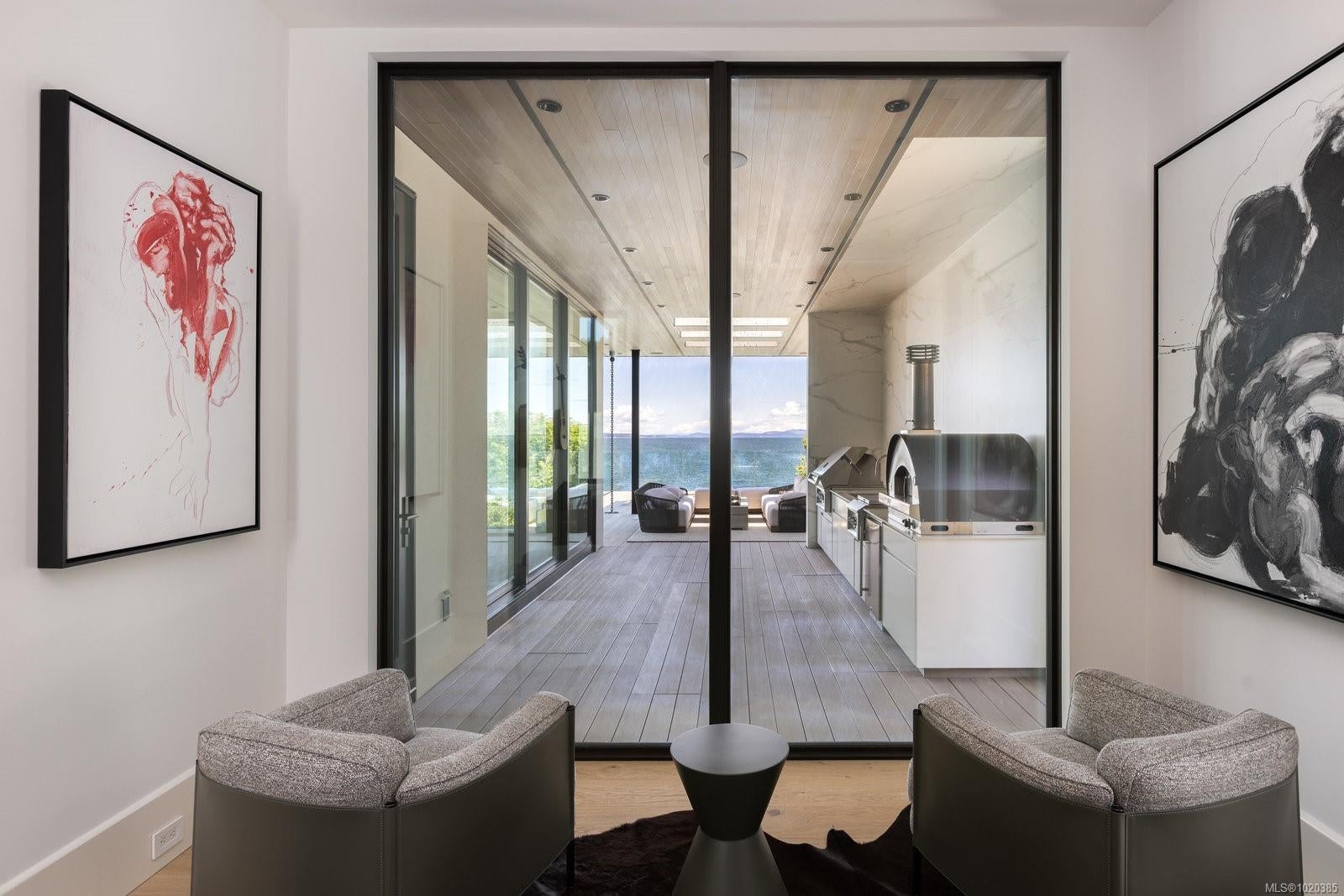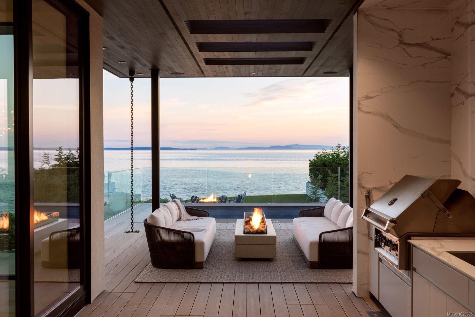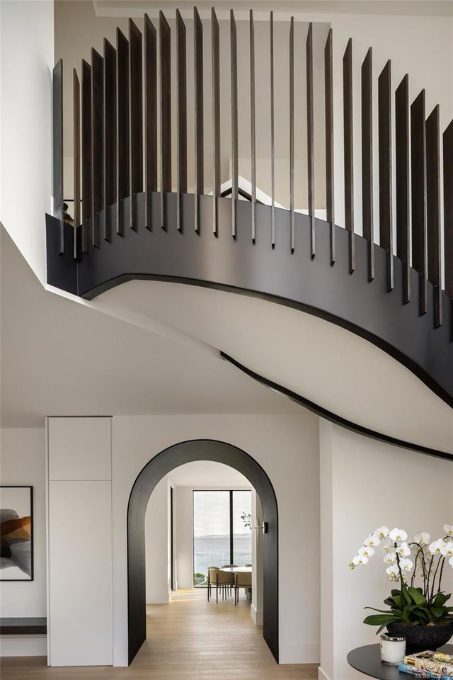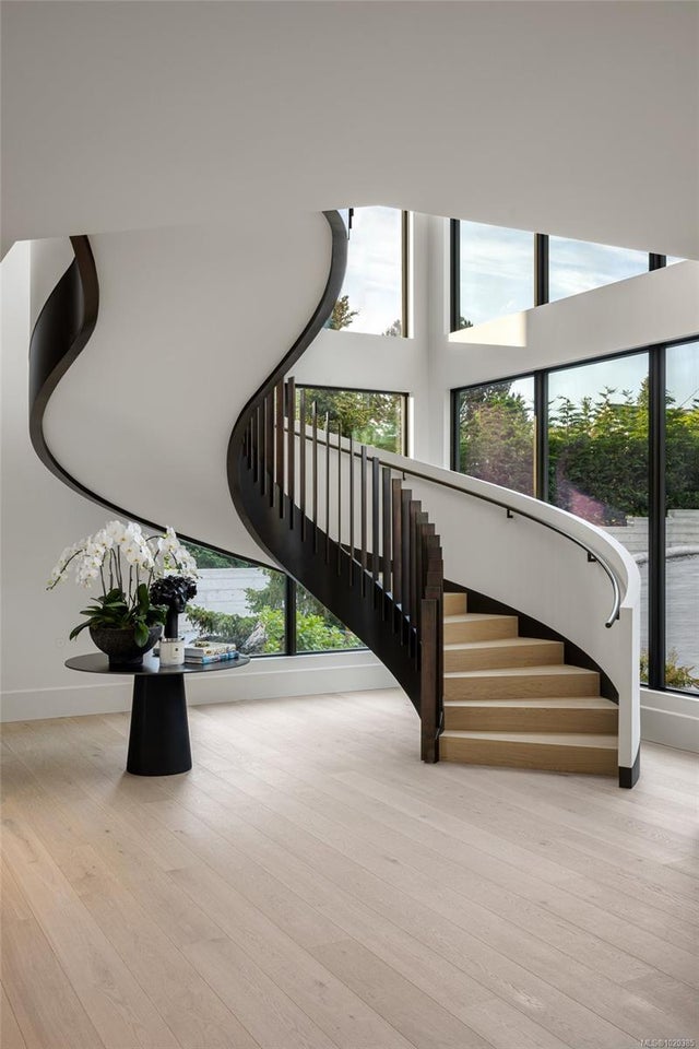 Experience Unparalleled Luxury at Vista del Mare. Perfectly positioned on over half an acre of prime waterfront in the prestigious Ten Mile Point, this architectural masterpiece by Robert Blaney, brought to life by Terry Johal Developments, promises to leave you breathless. Winner of 4 CARE Awards, including Best Single Family Detached Home, Best Innovative Feature, Best Primary Suite and Best Custom Millwork. Step into grandeur with 10-foot ceilings and a show-stopping steel and white oak floating spiral staircase that sets the tone for the rest of this captivating home. The expansive floor-to-ceiling windows on all three levels not only flood the interior with natural light but also offer uninterrupted views of Haro Strait and San Juan Island, making every room a visual delight. The neutral colour palette, accented by targeted designer lighting, creates an ambiance that is both clean and invigorating. The main floor's open-plan design maximizes these ocean views, seamlessly integrating the living, dining, and kitchen areas for effortless entertaining and everyday living. The sky-lit covered patio, adjacent to your complete outdoor kitchen with a deluxe Hestan grill and Fontana Forni pizza oven - imported from Italy- allows for al fresco dining with the backdrop of stunning seascapes, with the occasional killer whale and aurora borealis sighting. Enjoy a dip in the heated pool, followed by a rinse in the outdoor shower. Car enthusiasts will appreciate the attached three-car garage, equipped with two vehicle elevators. Above the garage, a separate, well-insulated guest suite offers a private living area, bedroom, and full bath.